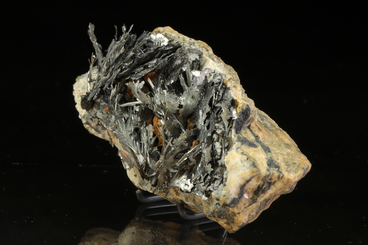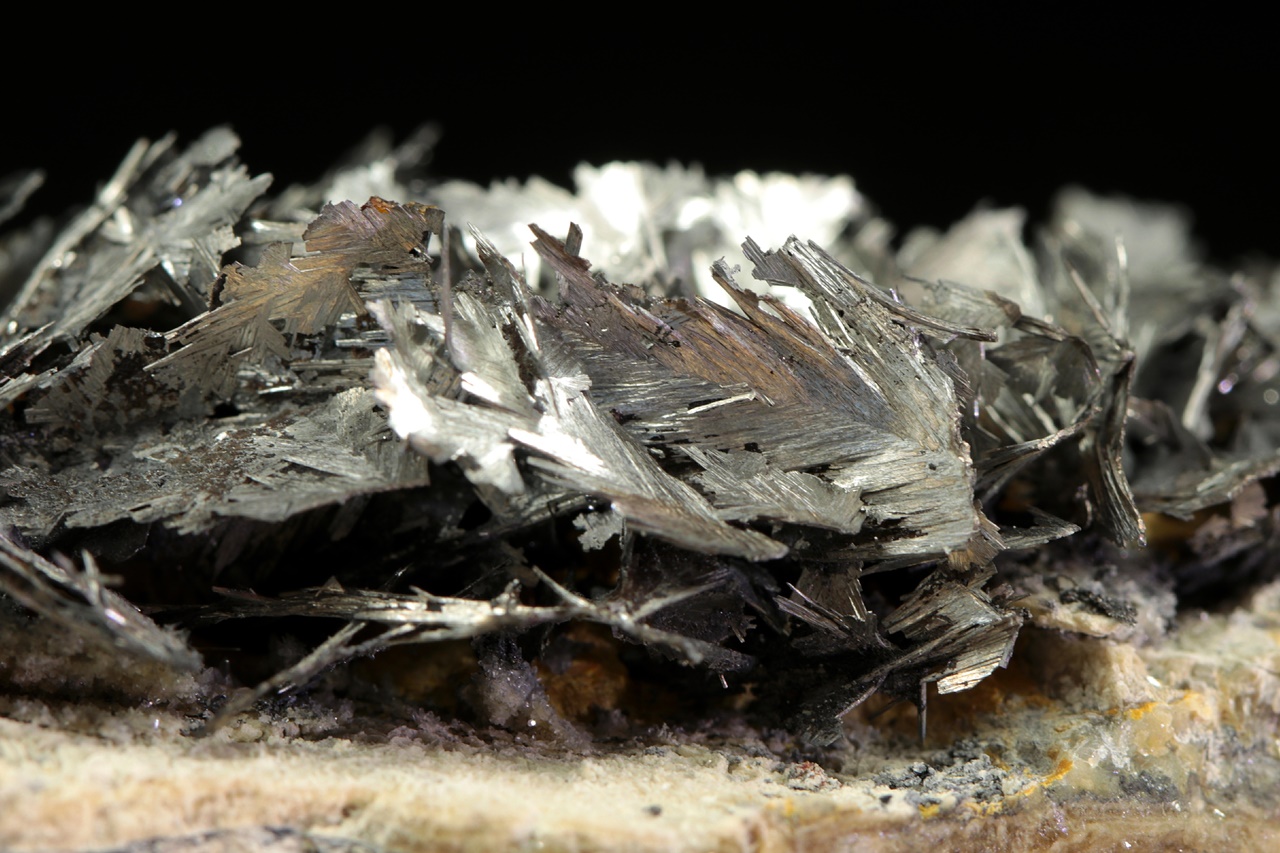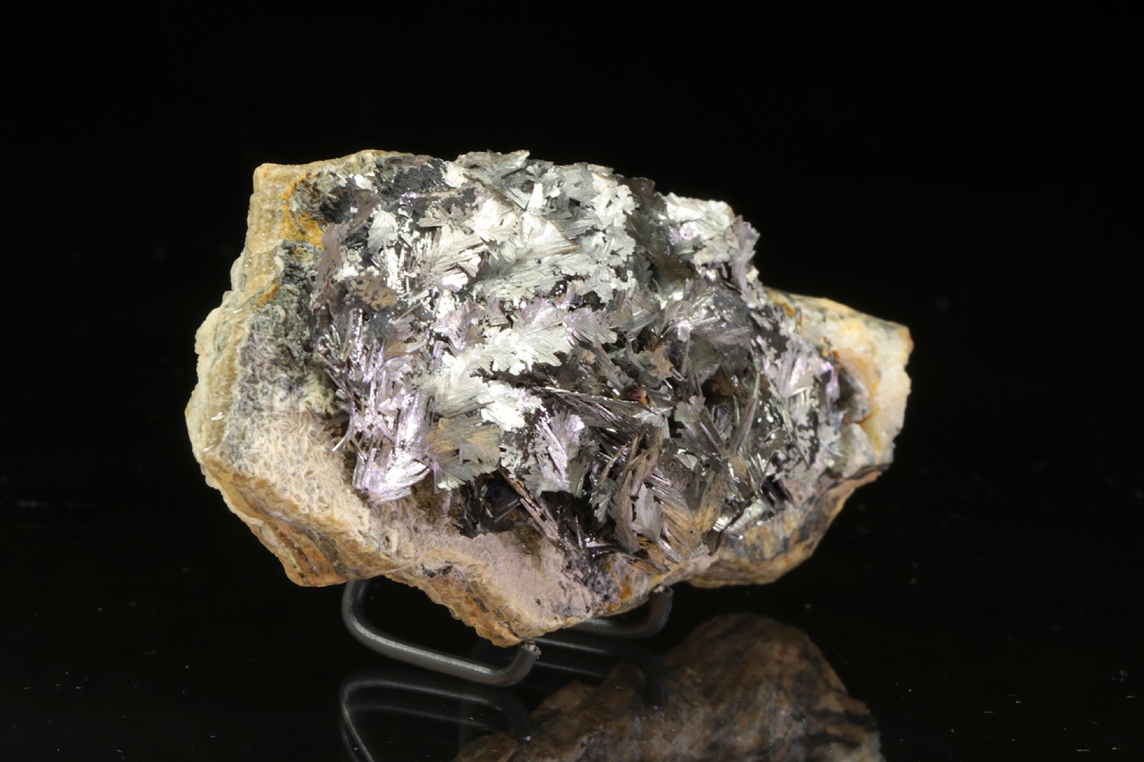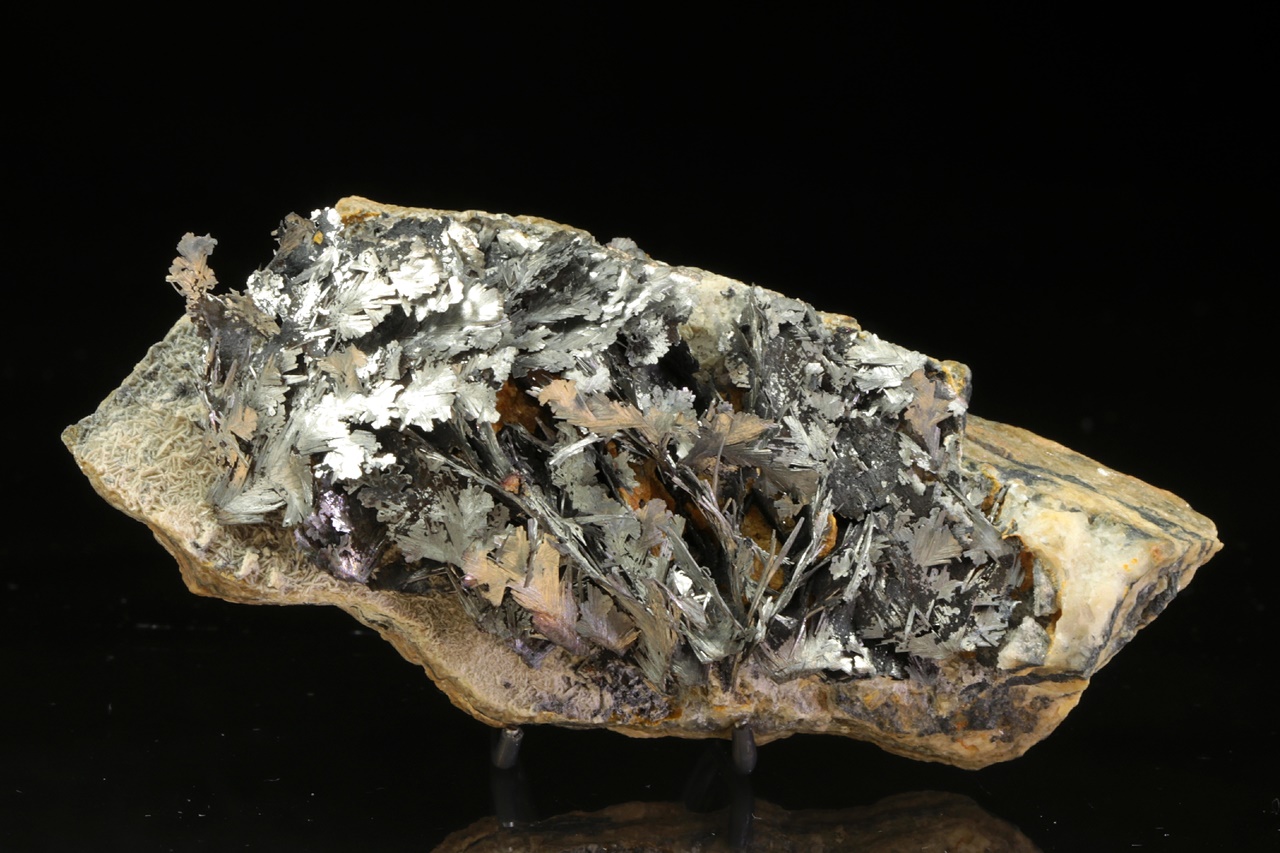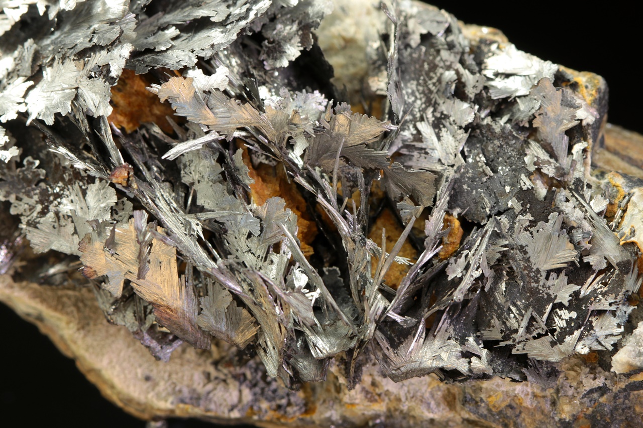 Silberglänzende, plättchenförmige Kristalle aus Silberantimonid. Dyskrasit bildet auf der Stufe Zwillinge zu dendritisch gewachsenen Kristallen. Der größte Kristall ist 2 cm groß.