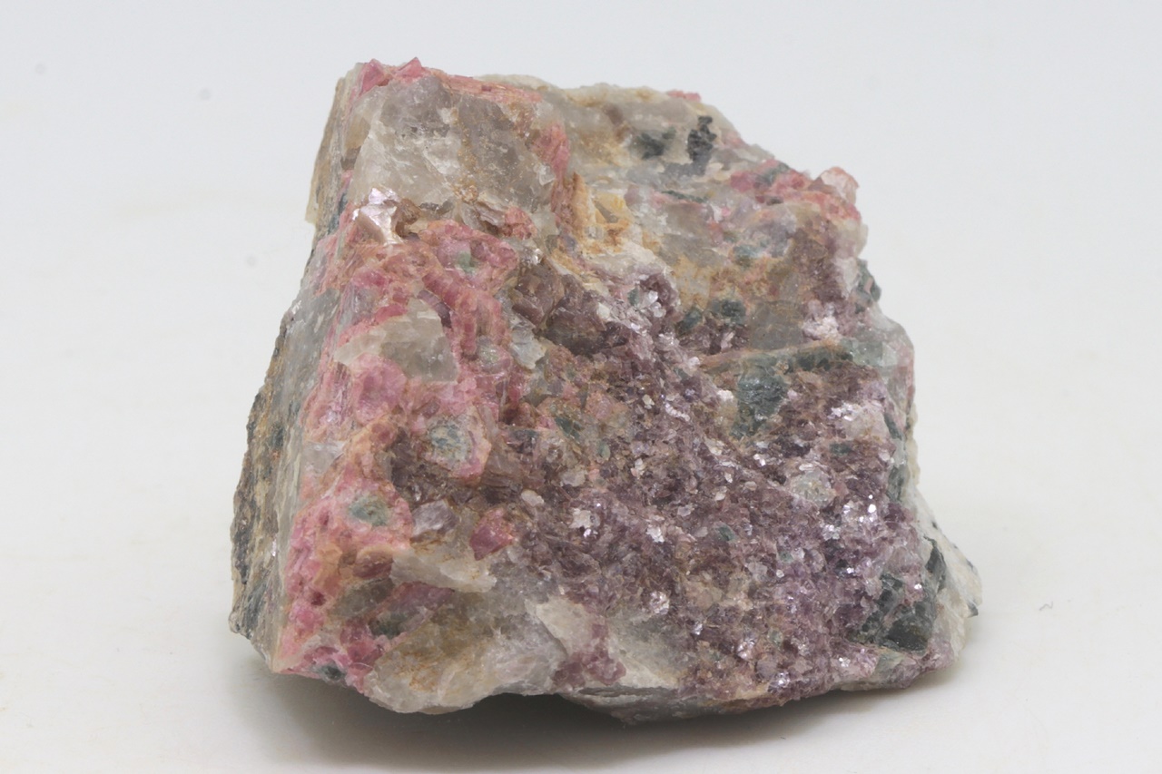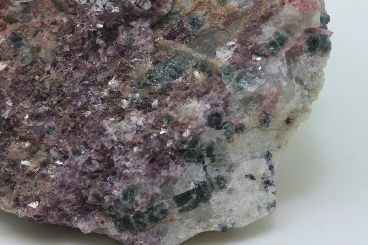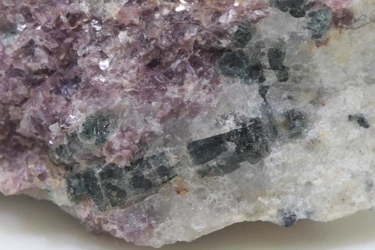 Kristalle von rosafarbenem und dunkelblauem, teilweise auch zweifarbigem Elbait mit violettem Lepidolith.
