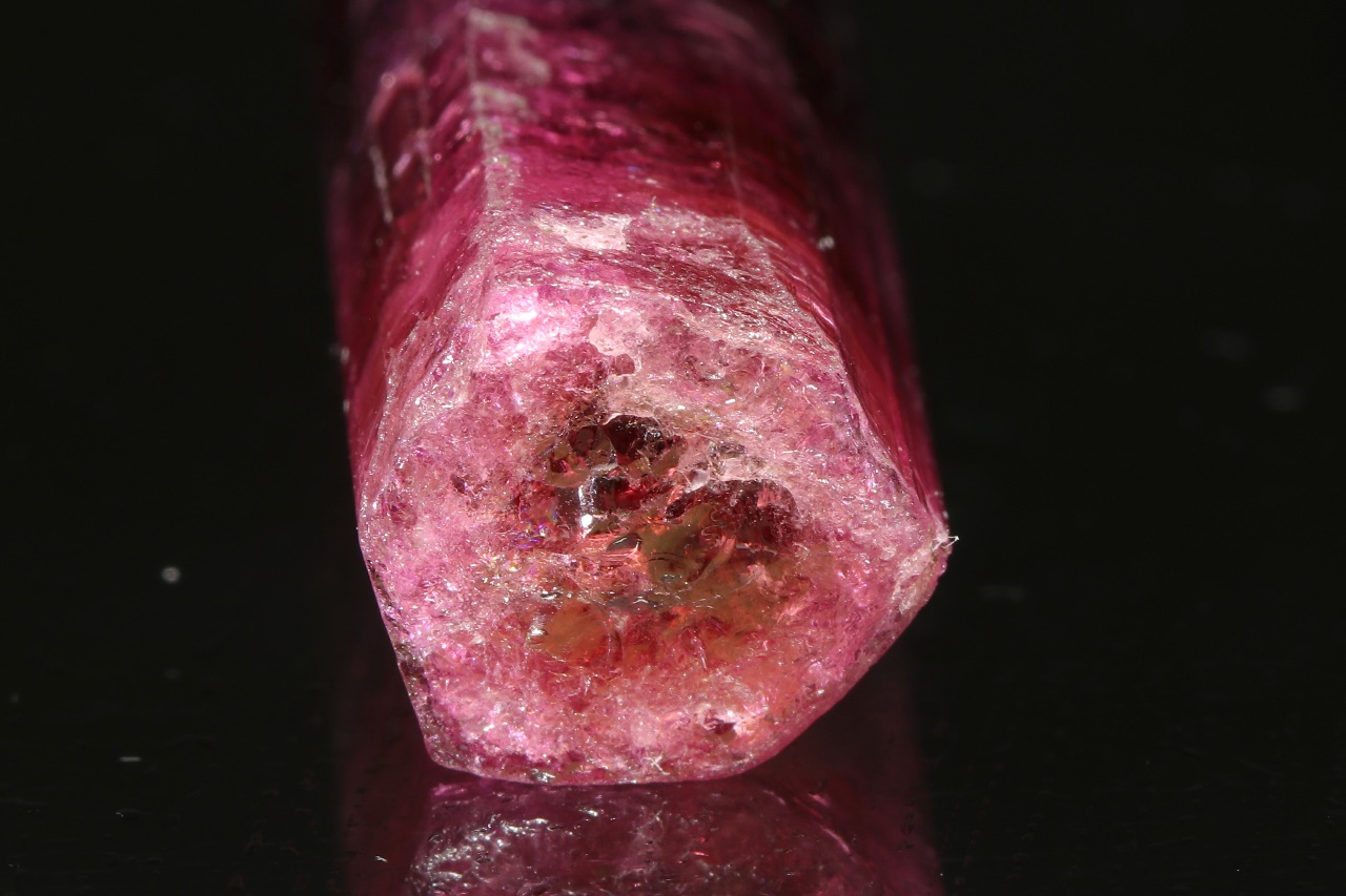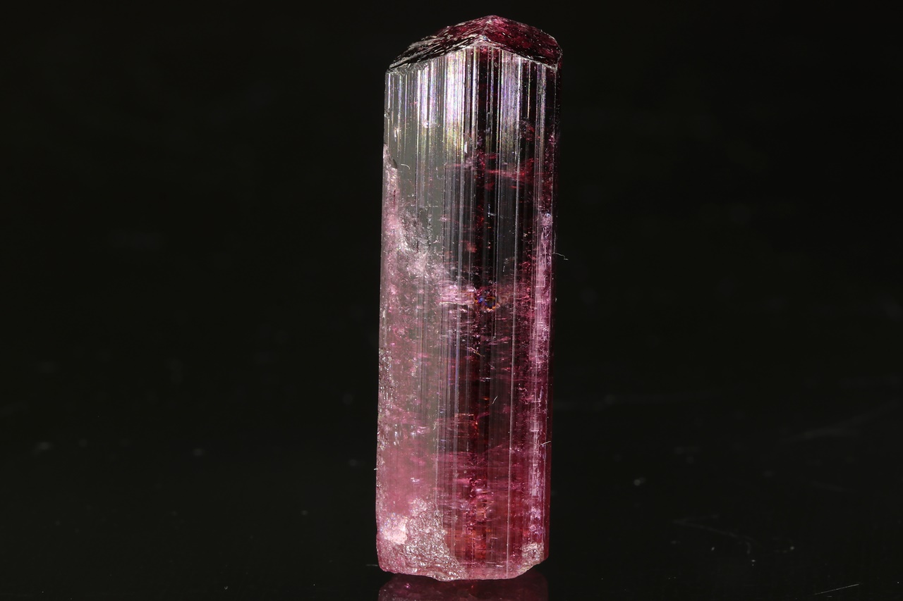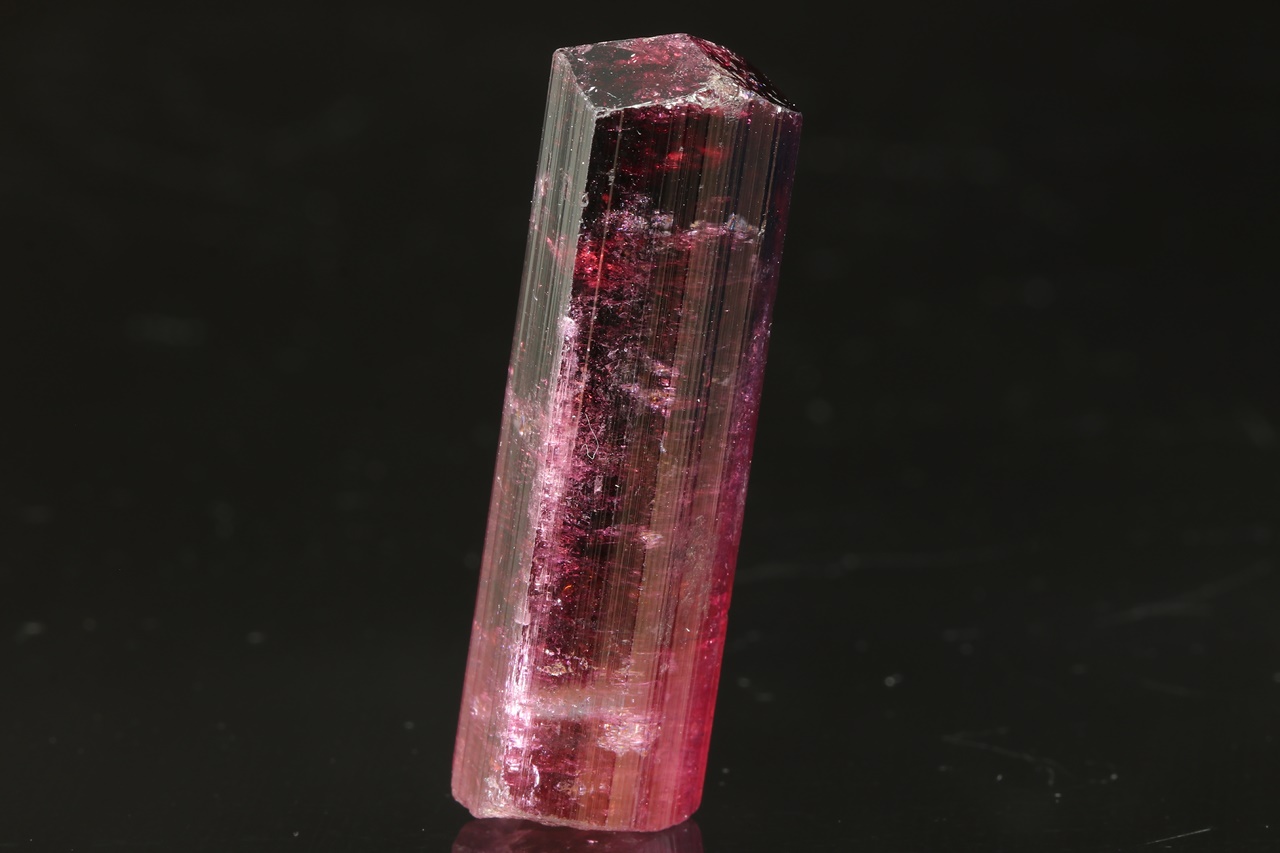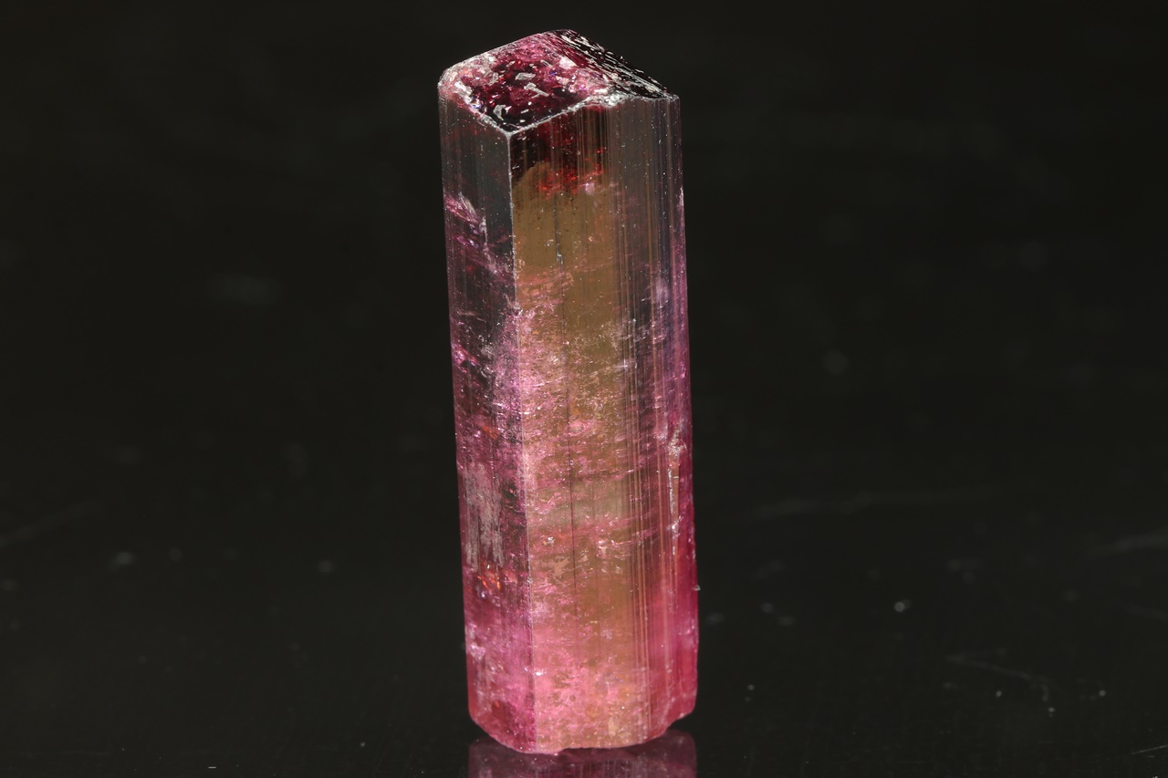 Unbeschädigter Kristall intensiv weinrot gefärbten Turmalins mit orangefarbenem Zentrum. Das Exemplar steht ohne Stütze.