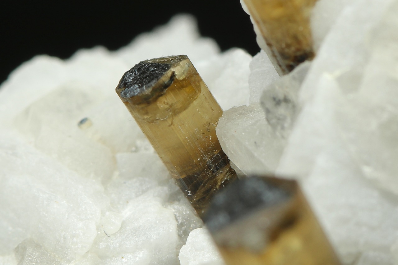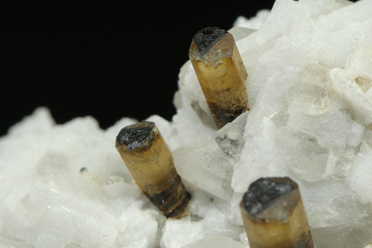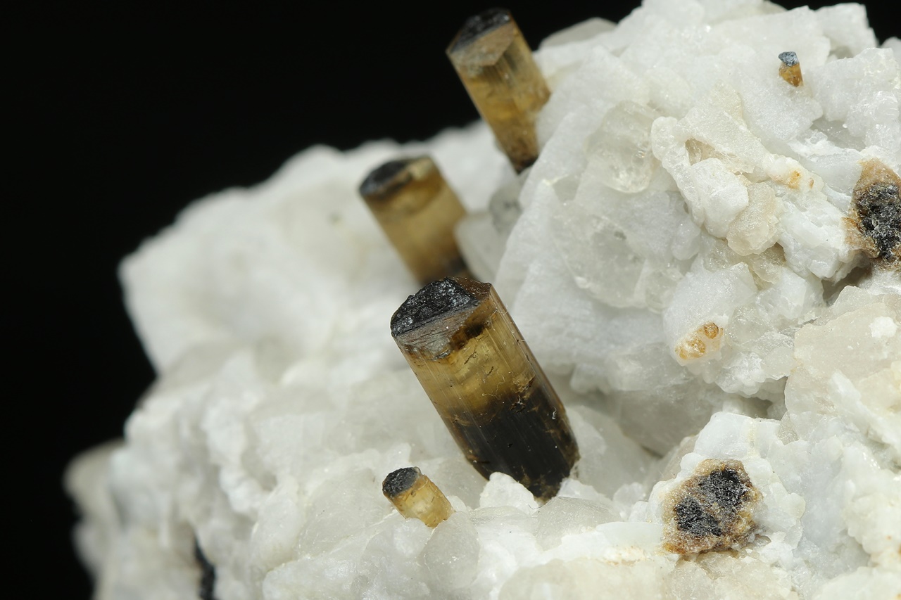 Säulenförmige Kristalle des durchsichtigen Turmalins mit ausgeprägter Zonalität, die aus einer Albite-Grundplatte wachsen. Der größte Turmalinkristall ist 10 mm groß. Die Probe ist von unten abgeschnitten.
