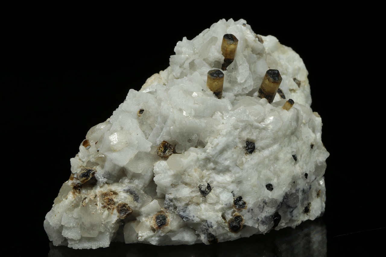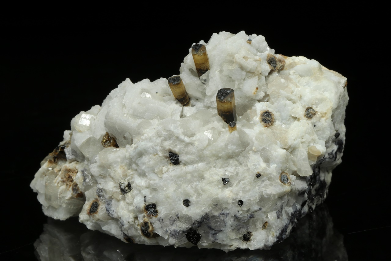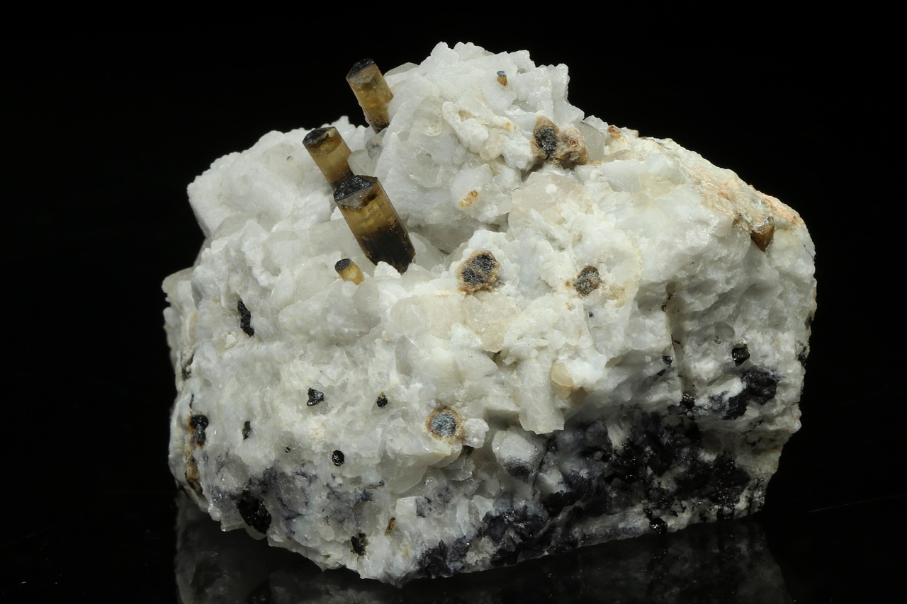 Säulenförmige Kristalle des durchsichtigen Turmalins mit ausgeprägter Zonalität, die aus einer Albite-Grundplatte wachsen. Der größte Turmalinkristall ist 10 mm groß. Die Probe ist von unten abgeschnitten.