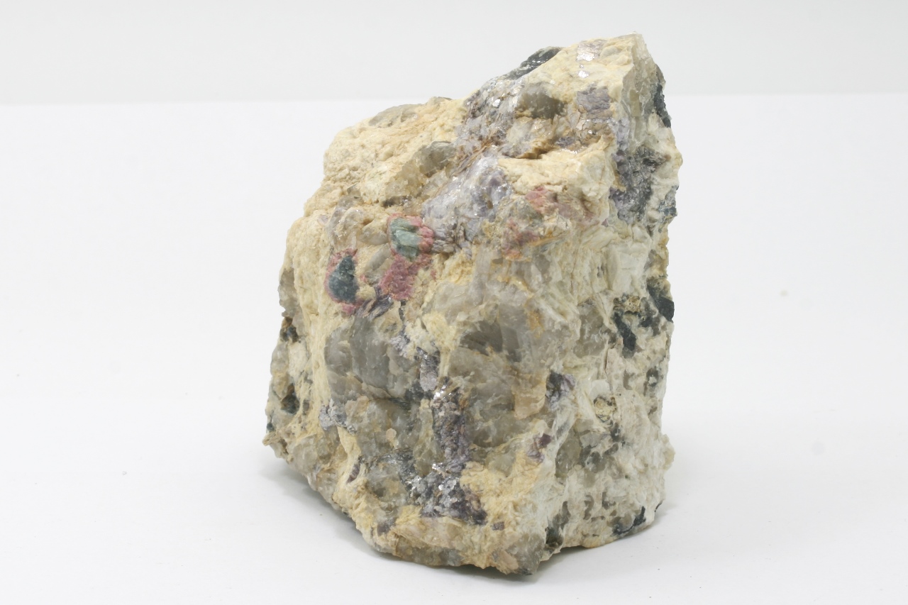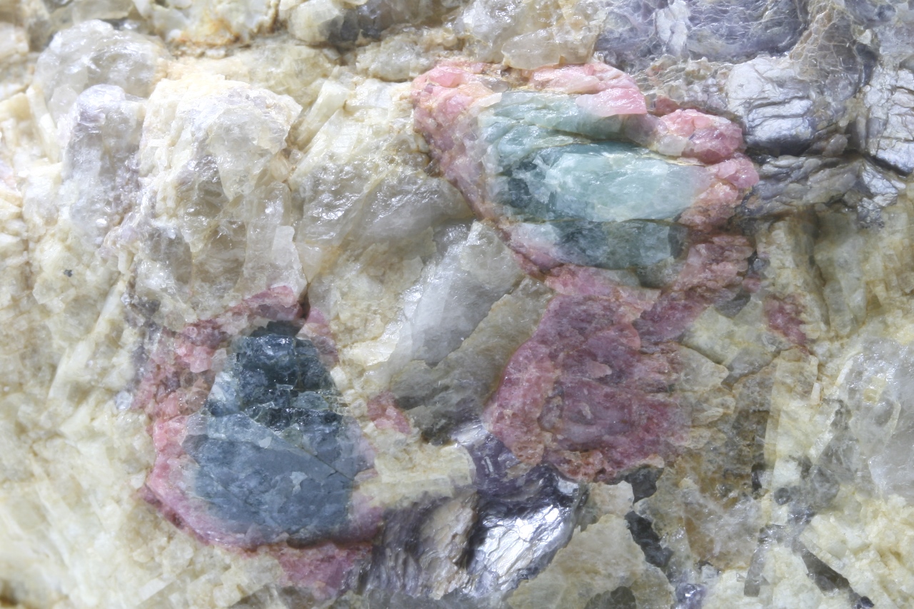 Zwei Körner des invertierten Wassermelonenturmalins mit grünem Zentrum und rotem Rand sowie blättrige Aggregate von rosa Lepidolith .