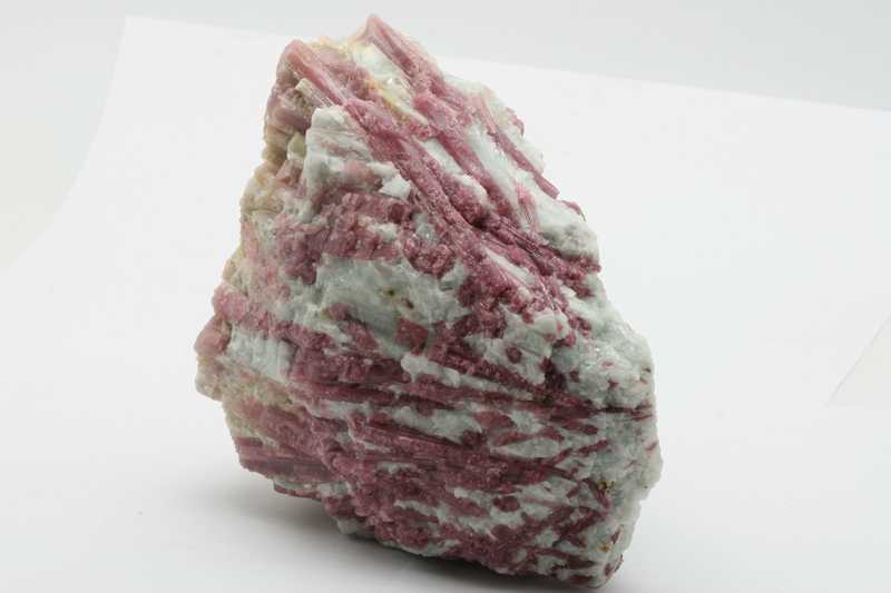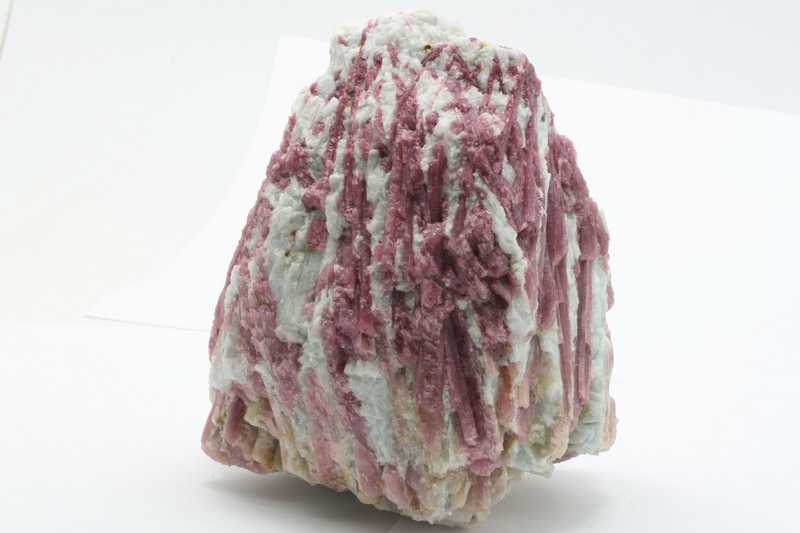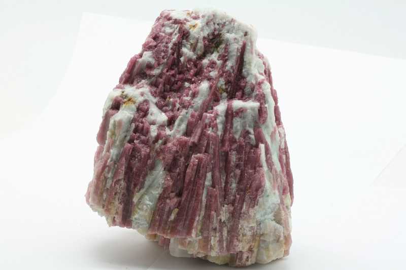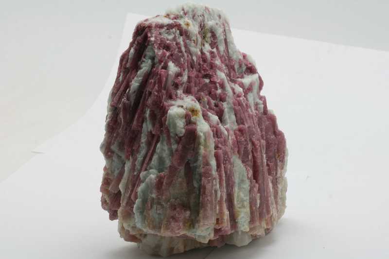 Rosa Turmalin-Säulen mit orangefarbenem Pyrochlor und braunem Zirkon. Ästhetisches Beispiel für eine pegmatitische Assoziation aus dem brasilianischen Minas Gerais.