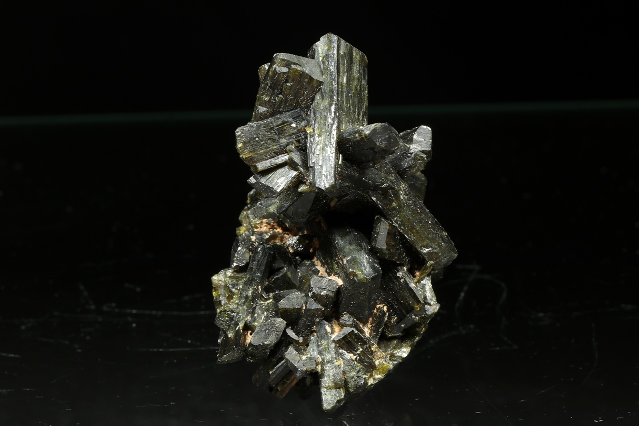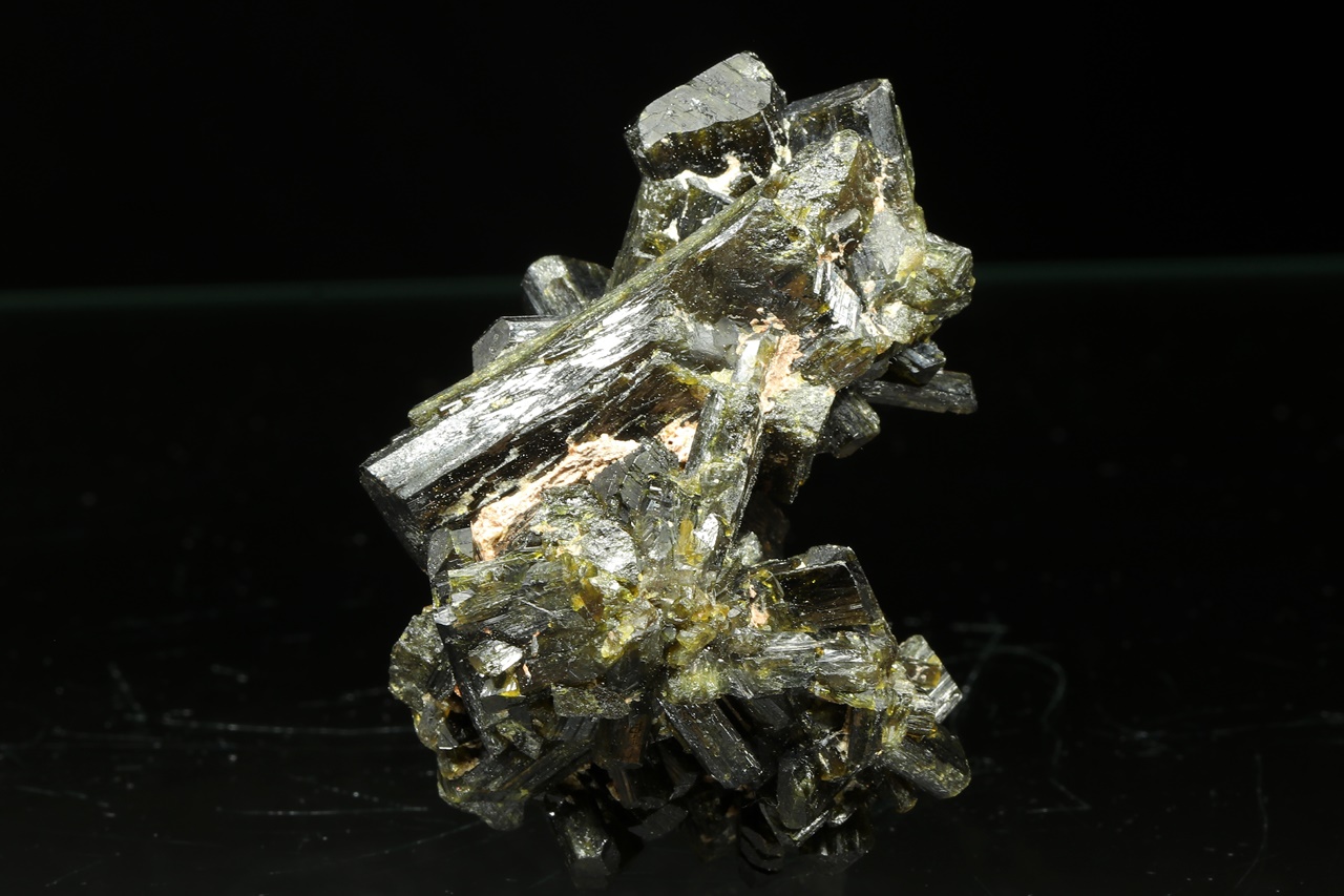 Cluster von dunkelgrünen, beidseitig endenden Epidot-Kristallen bis zu 4 cm Größe.