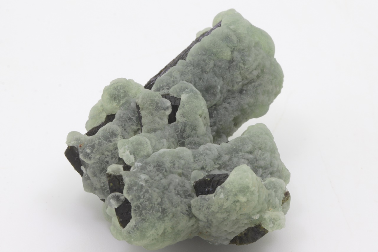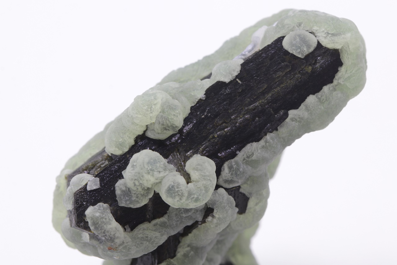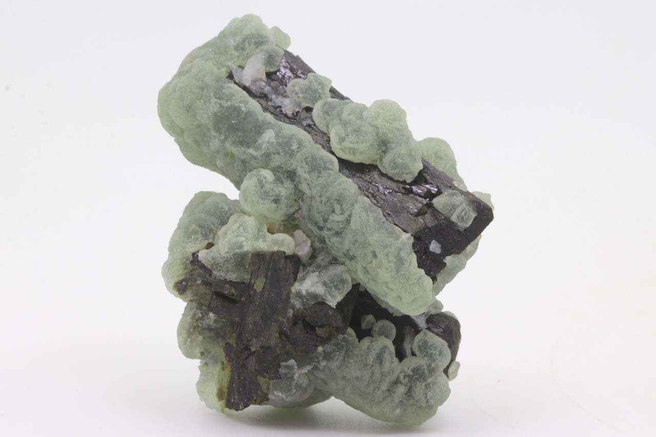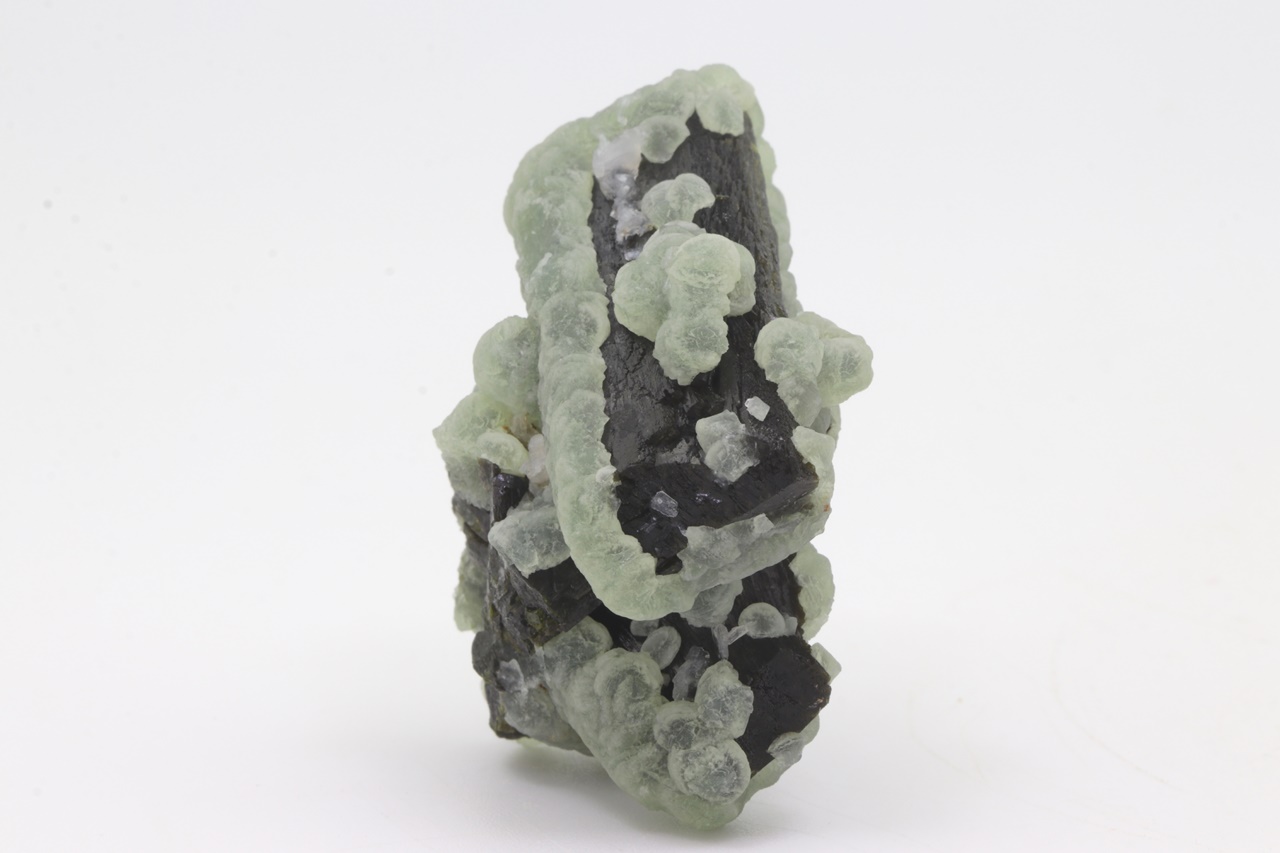 Ästhetische Verwachsung von schwarzen Epidot-Kristallen bis zu 5 cm Größe, überzogen mit radialen Aggregaten von hellgrünem Prehnit.