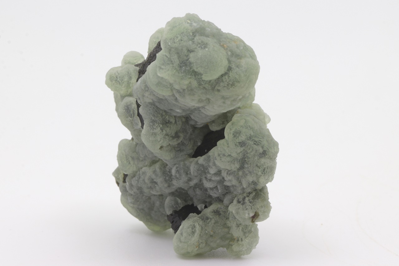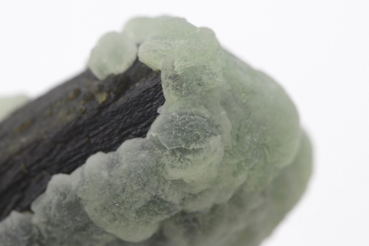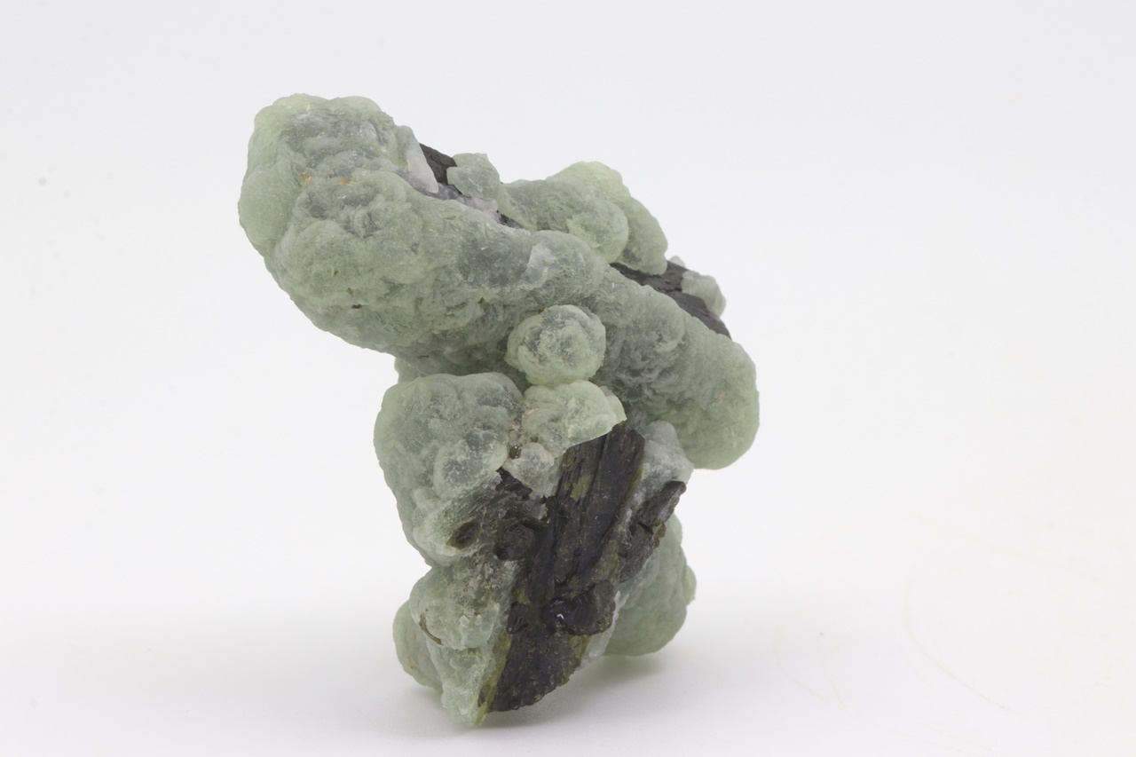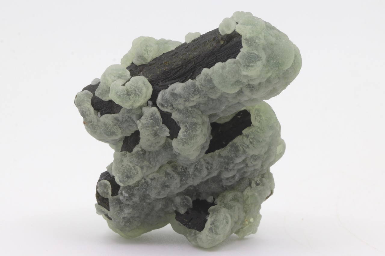 Ästhetische Verwachsung von schwarzen Epidot-Kristallen bis zu 5 cm Größe, überzogen mit radialen Aggregaten von hellgrünem Prehnit.