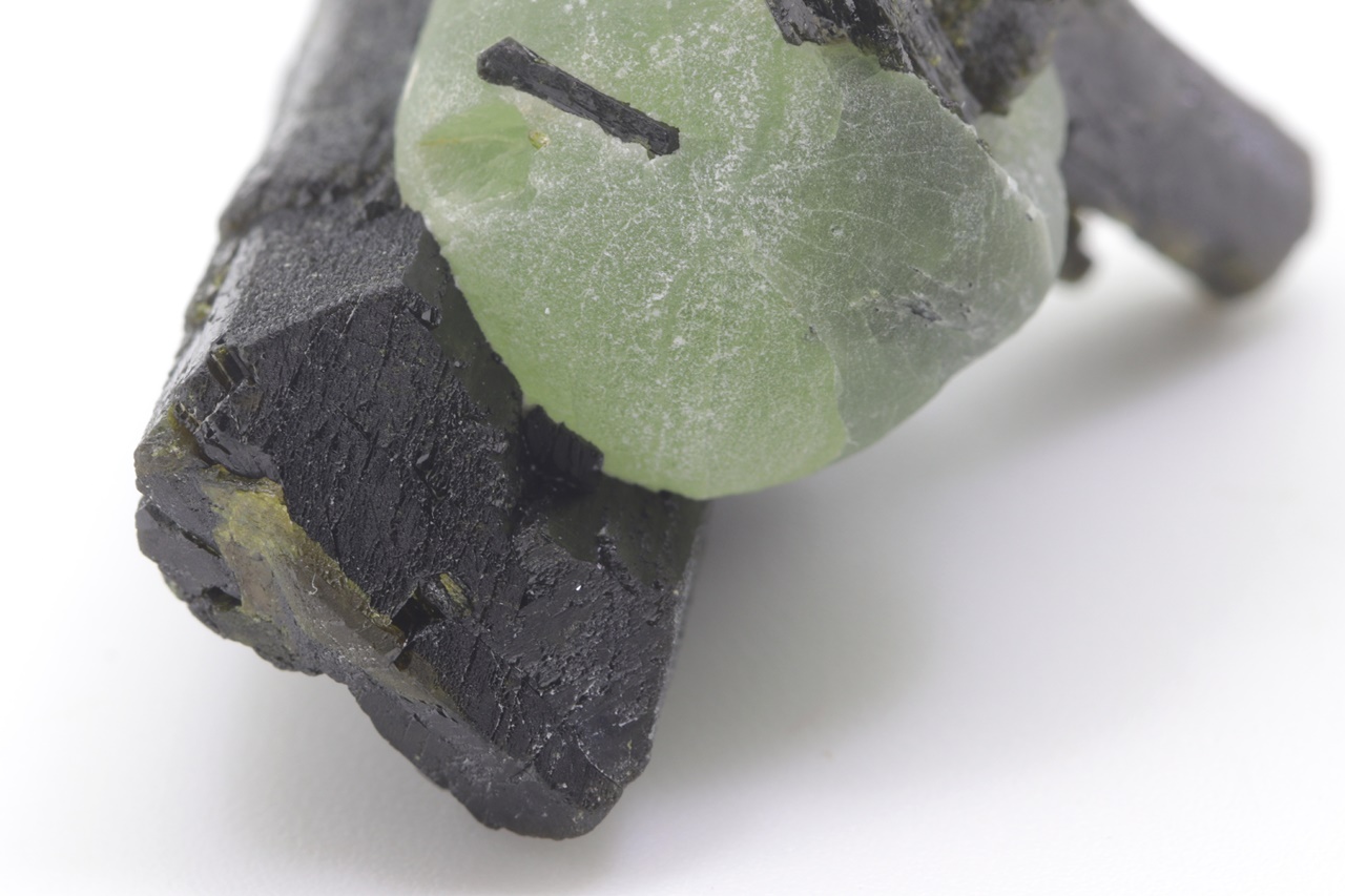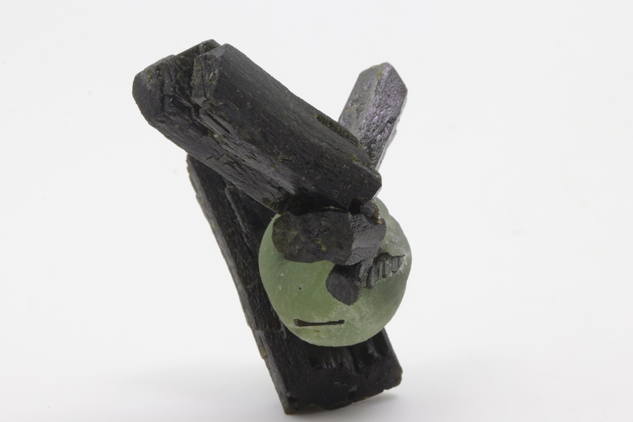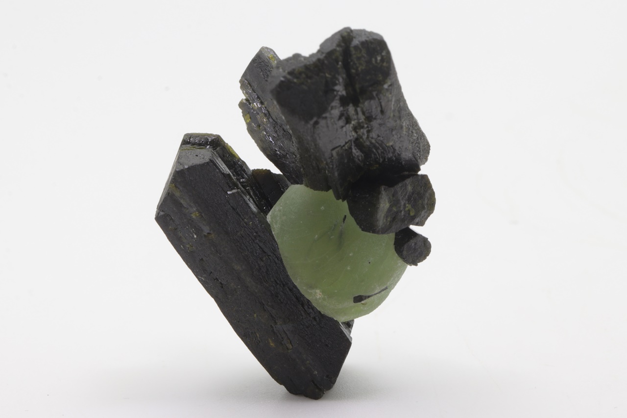 Sprossen dunkelgrüner Epidotkristalle bis zu 3,5 cm Größe mit einem kugeligen Prehnit-Aggregat.