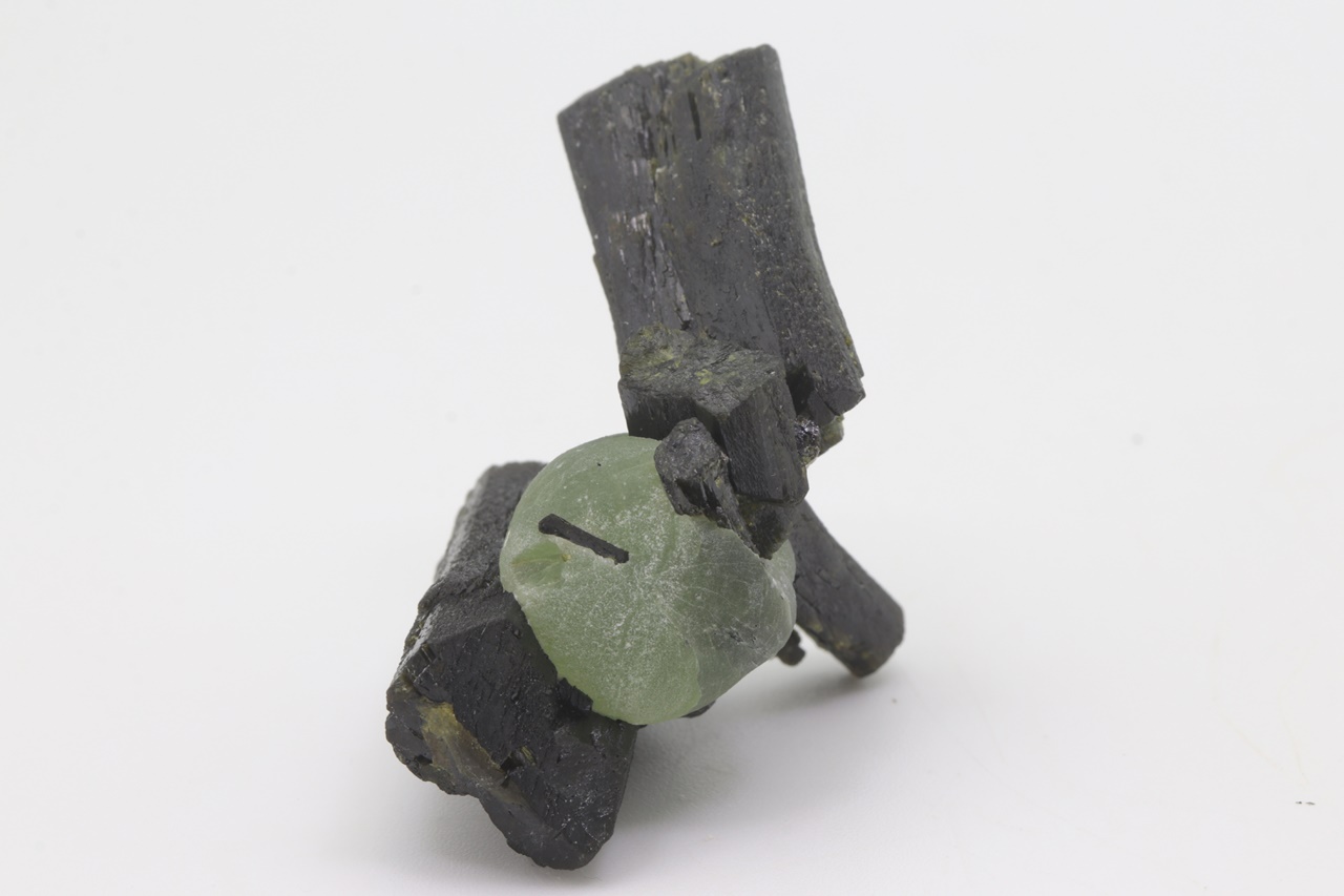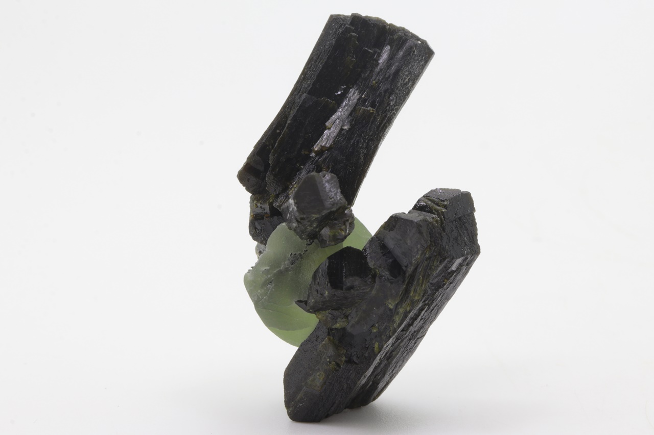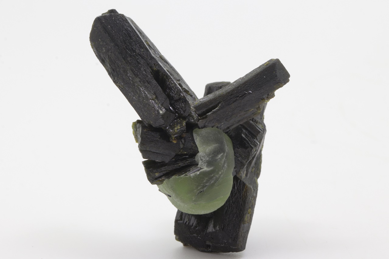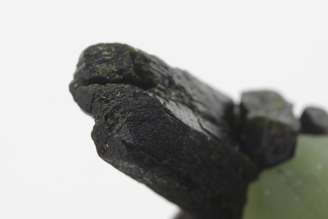 Sprossen dunkelgrüner Epidotkristalle bis zu 3,5 cm Größe mit einem kugeligen Prehnit-Aggregat.