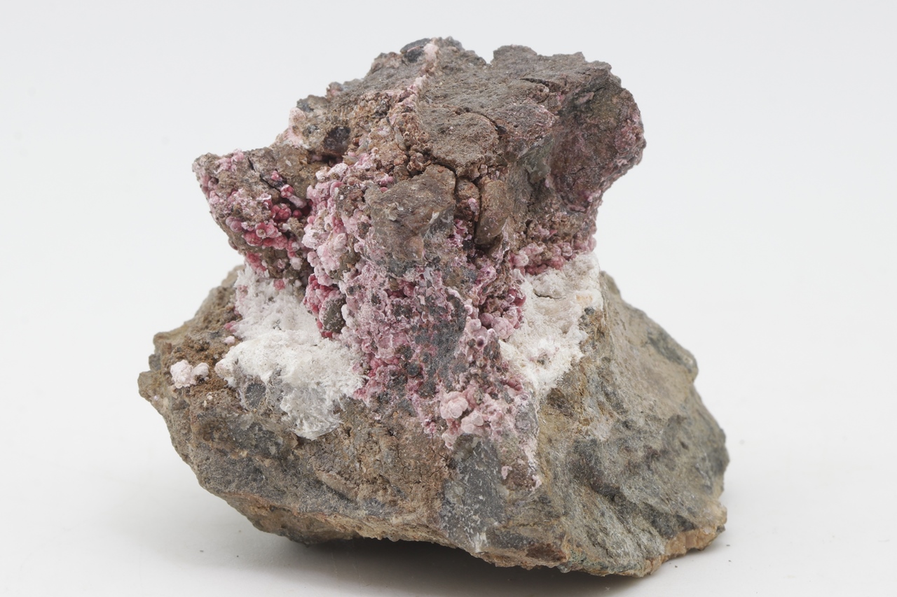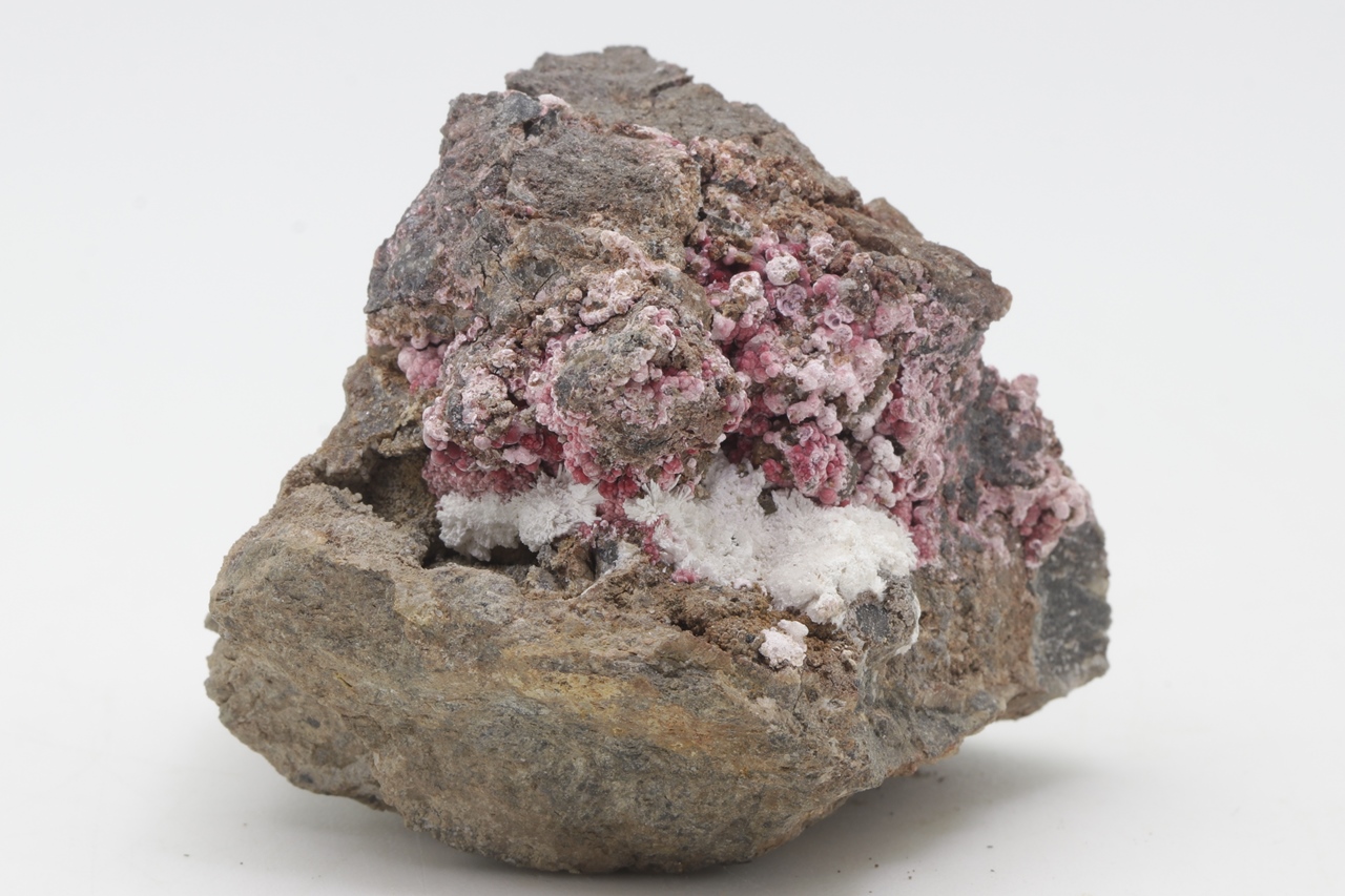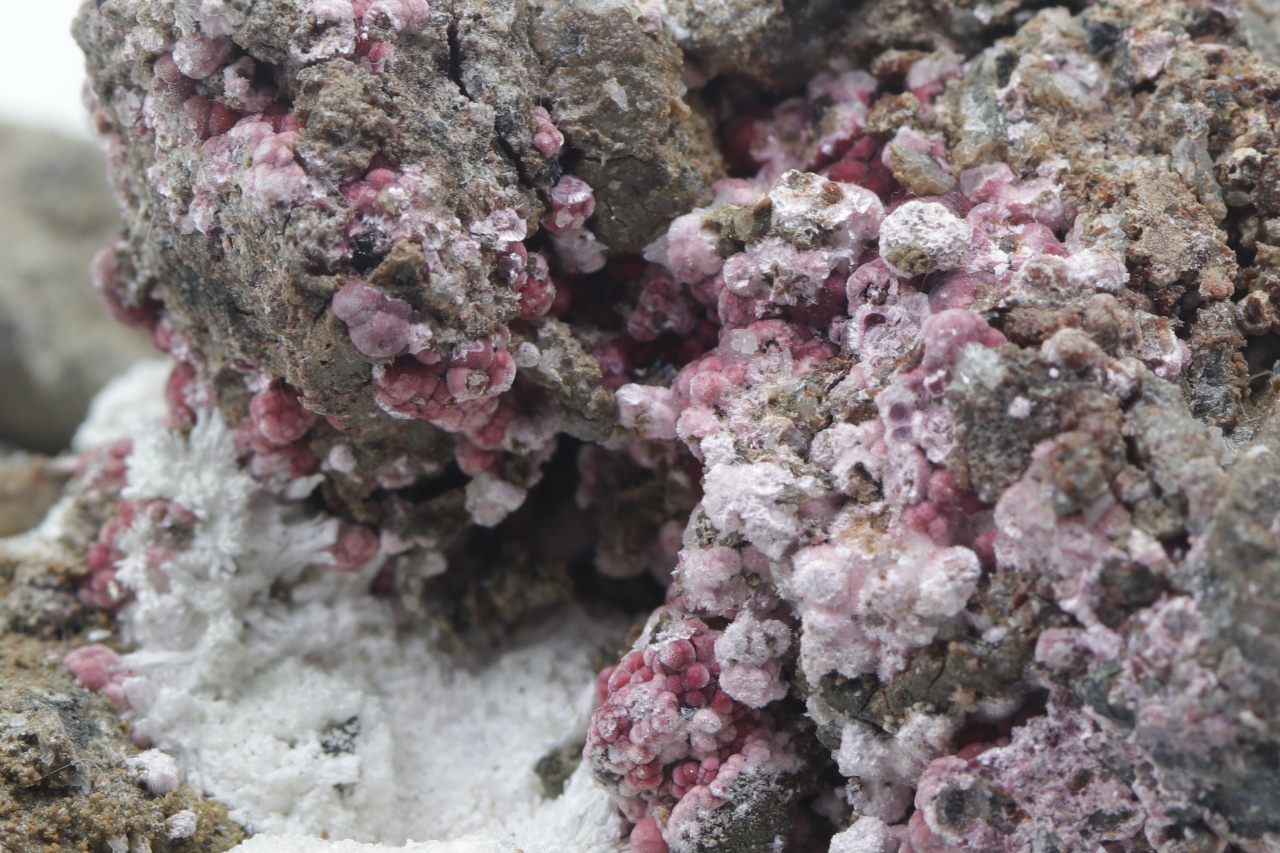 Reiche Stufe von rosafarbigen kugeligen Erythrin-Aggregaten bis zu 1 mm Größe.