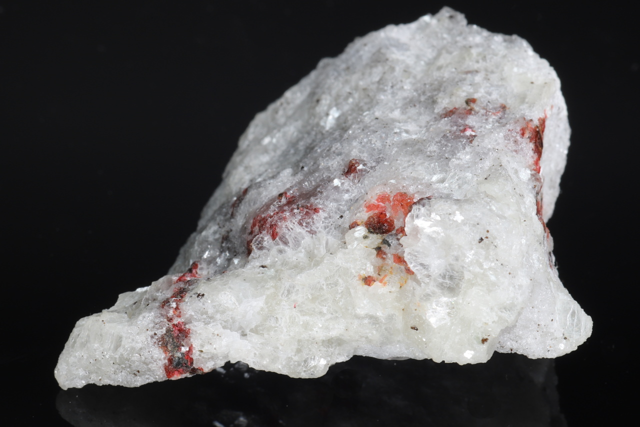 Schwarze Körner von Fencooperit in Assoziation mit roten Körnern von Gillespit in weißem Sanbornit. Klare, glasglänzende Körner bilden Celsián. Fencooperit und Gillespit sind extrem seltene Silikate von Barium und Eisen, Fencooperit wurde nur an zwei Orten auf der Welt gefunden. Sanbornit ist ein sehr seltenes Bariumsilikat. Die Probe dieser seltenen Minerale stammt aus der Fundstelle Trumbull Peak in den USA, welche auch die Typlokalität für Fencooperit und Sanbornit ist. Die Proben wurden im Jahr 1973 persönlich von J. F. Cooper gesammelt, nach dem der Fencooperit benannt ist.