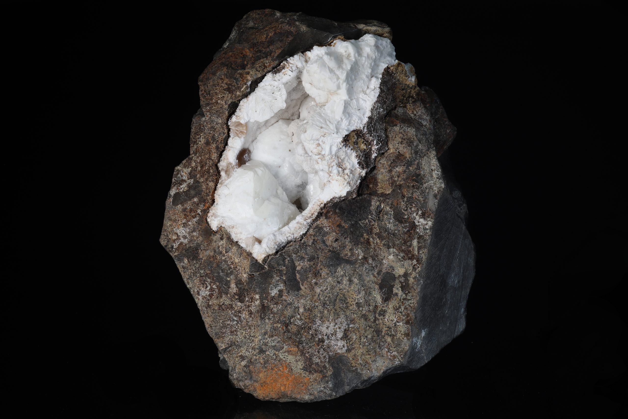 Hohlraum im Vulkanit, gefüllt mit großen weißen Kristallen von Fluorapophyllit, weißen kugelförmigen Aggregaten von Tobermorit und bräunlichem radialen Thomsonit. Die Apophyllitkristalle sind über 1,5 cm groß, die Halbkugel des Tobermorits an der Seite der Stufe hat einen Durchmesser von 16 mm. Die gesamte Zeolithhöhle ist 7 cm lang. Eine reiche Silikatprobe aus dem Fundort Cvikov bei Česká Lípa. Probe durch einen Schnitt bearbeitet.