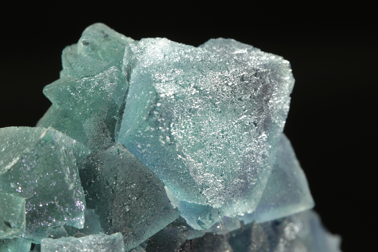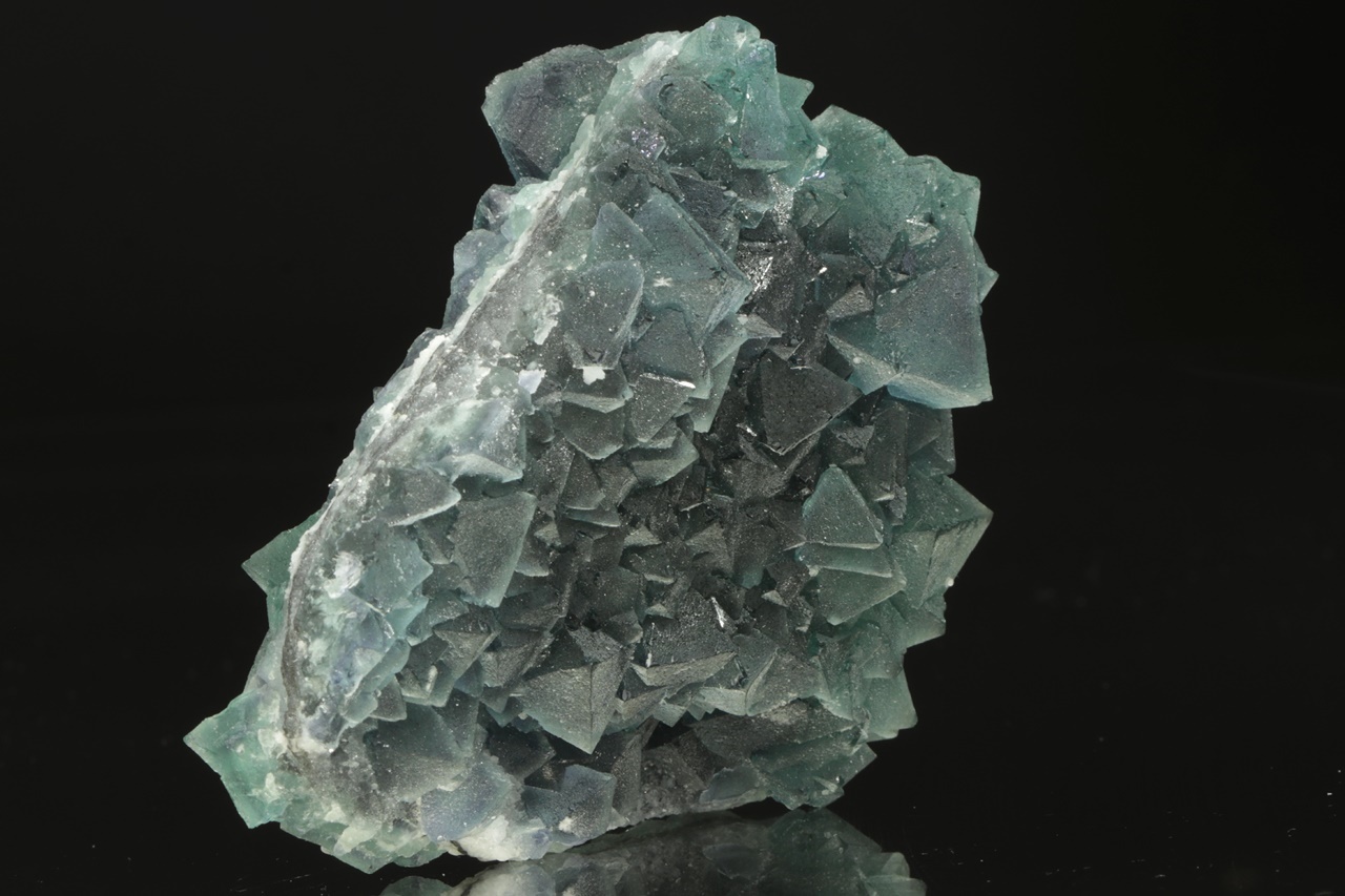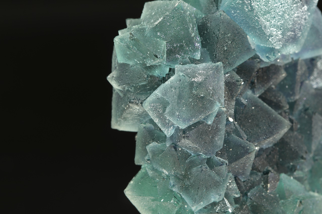 Ein beidseitiger, ästhetischer Muster oktaedrischer Fluorit-Kristalle mit Zonarität, die von grünlich-blau bis hin zu violett an den Rändern verläuft. Der größte Kristall ist 2 cm groß.