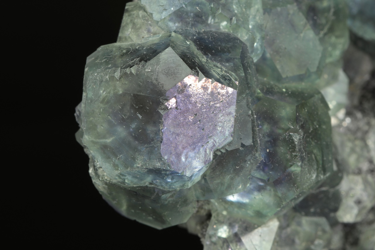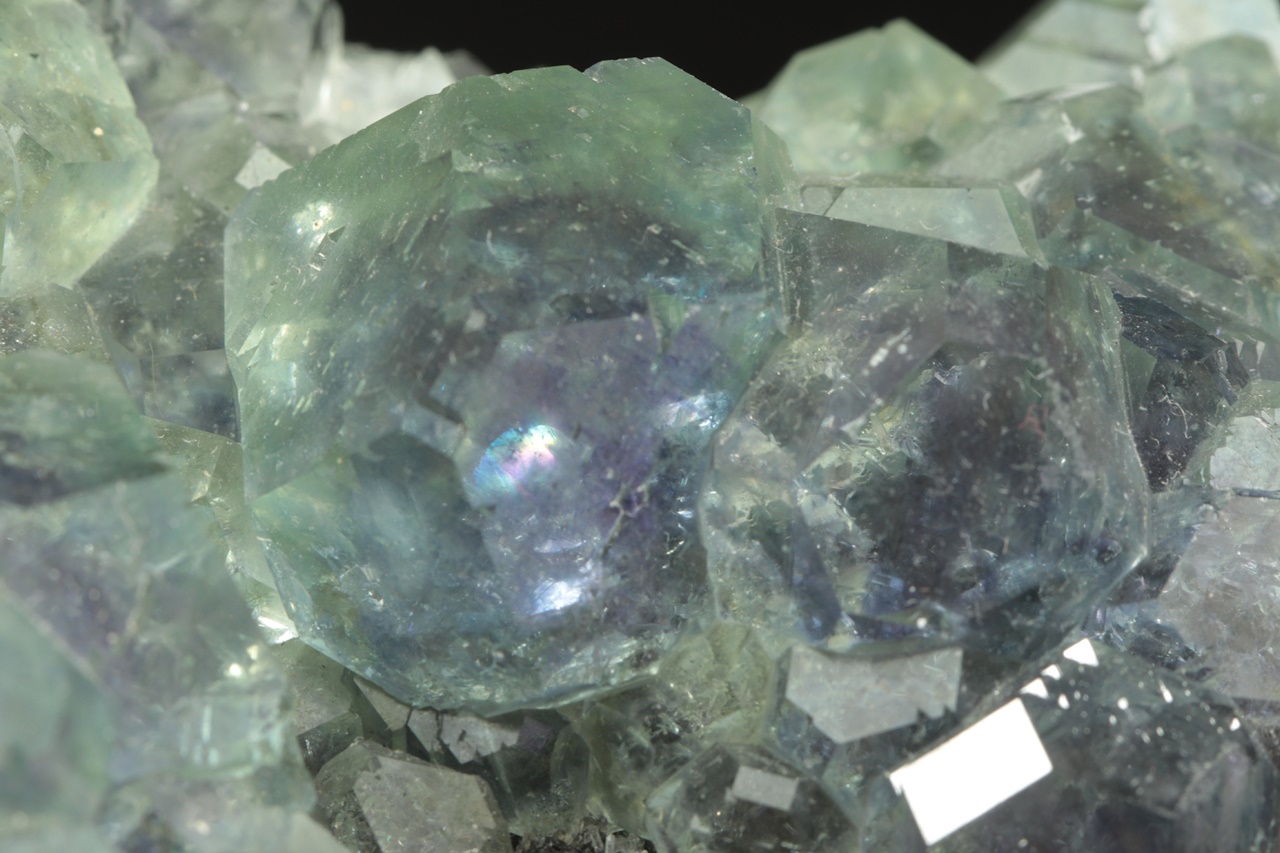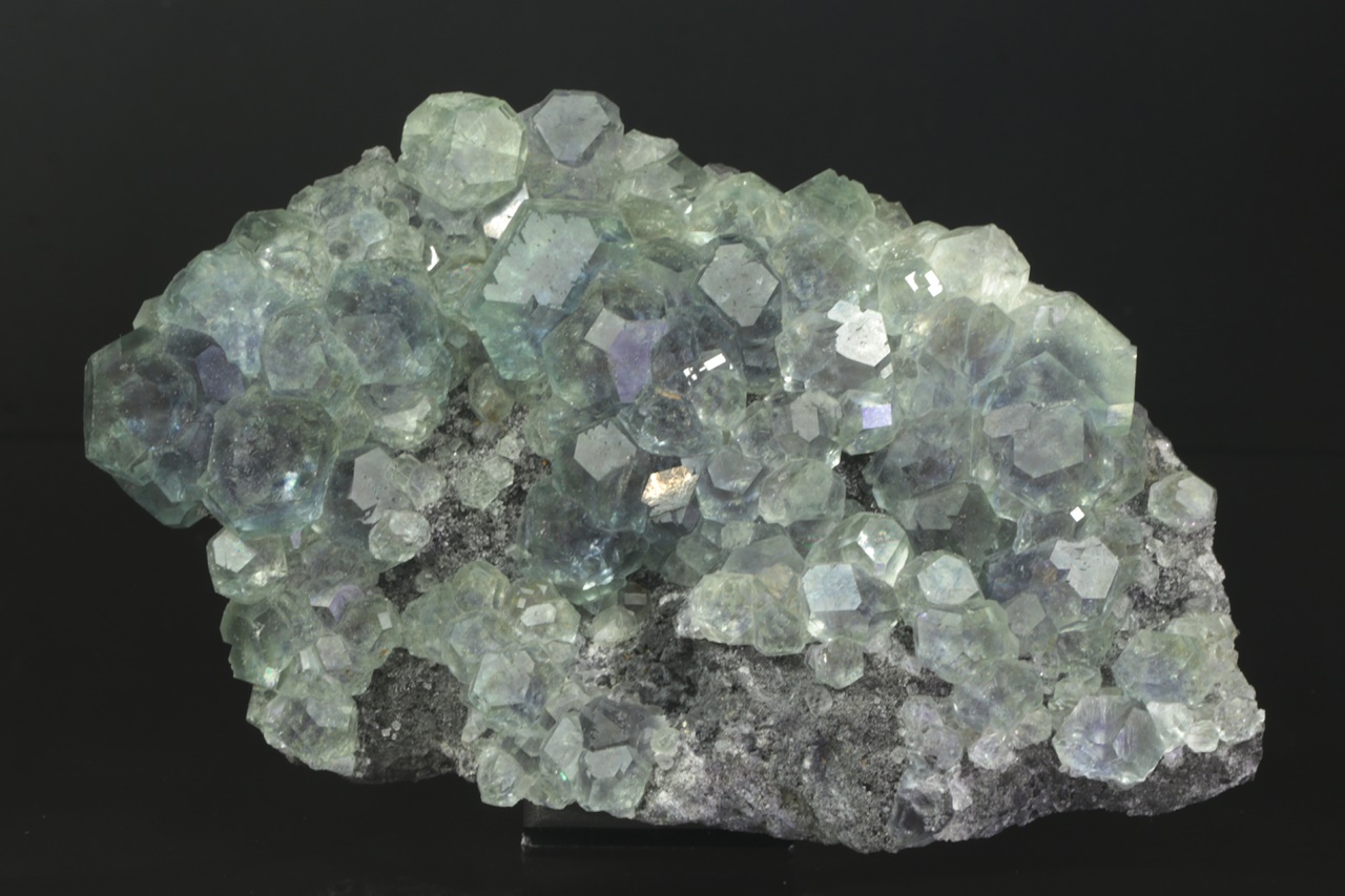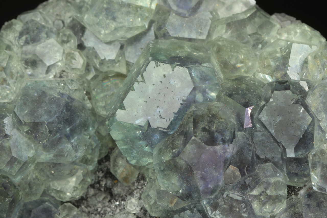 Wunderschöne Druse von hellgrünem Fluorit mit violetten Zentren, die durch die Verbindung von Würfel und Oktaeder gebildet werden. Der Fluorit ist sehr rein bis transparent, die größten Kristalle sind bis zu 2,5 cm groß .