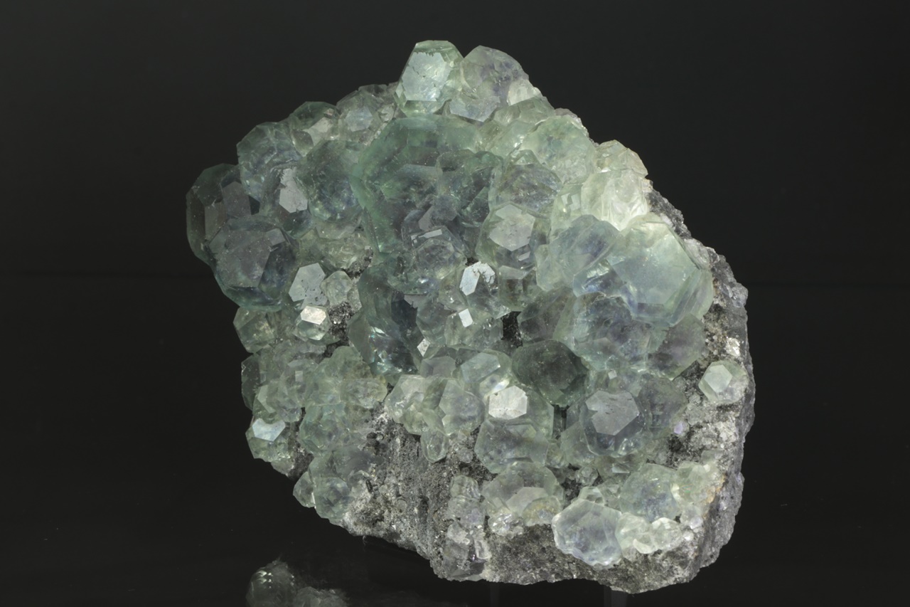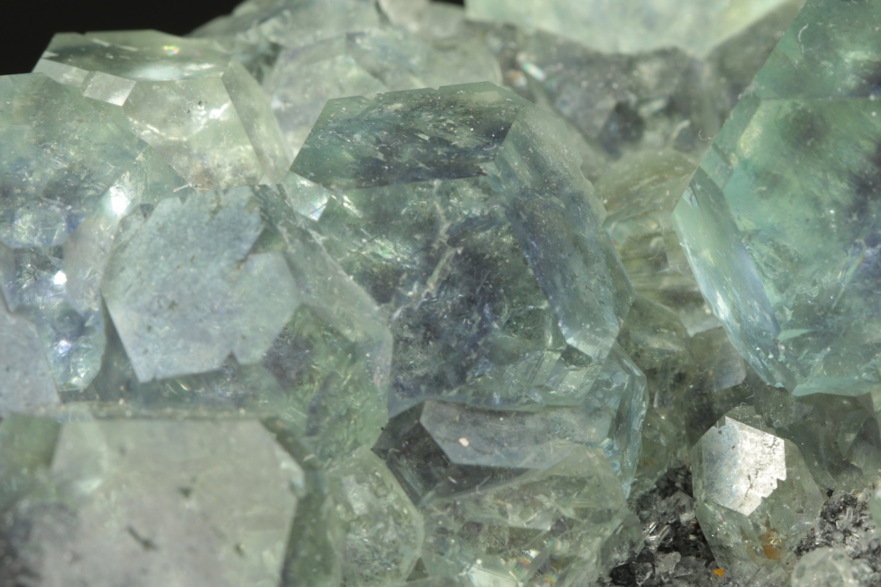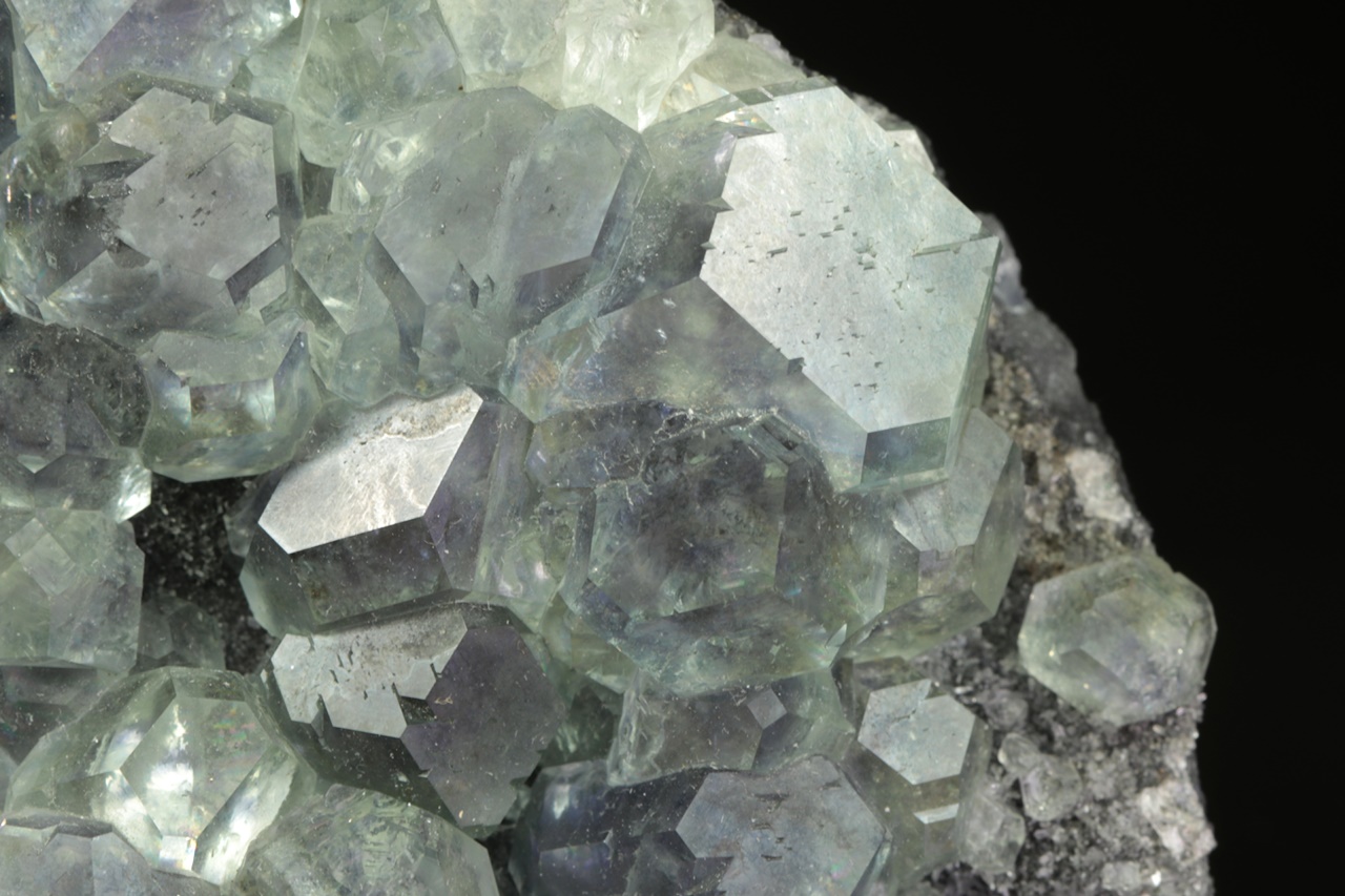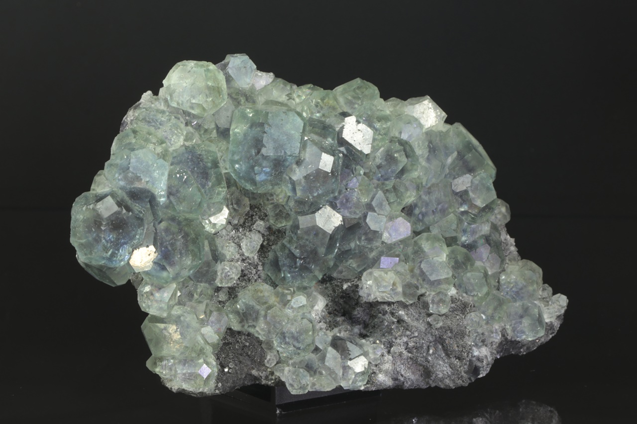 Wunderschöne Druse von hellgrünem Fluorit mit violetten Zentren, die durch die Verbindung von Würfel und Oktaeder gebildet werden. Der Fluorit ist sehr rein bis transparent, die größten Kristalle sind bis zu 2,5 cm groß .