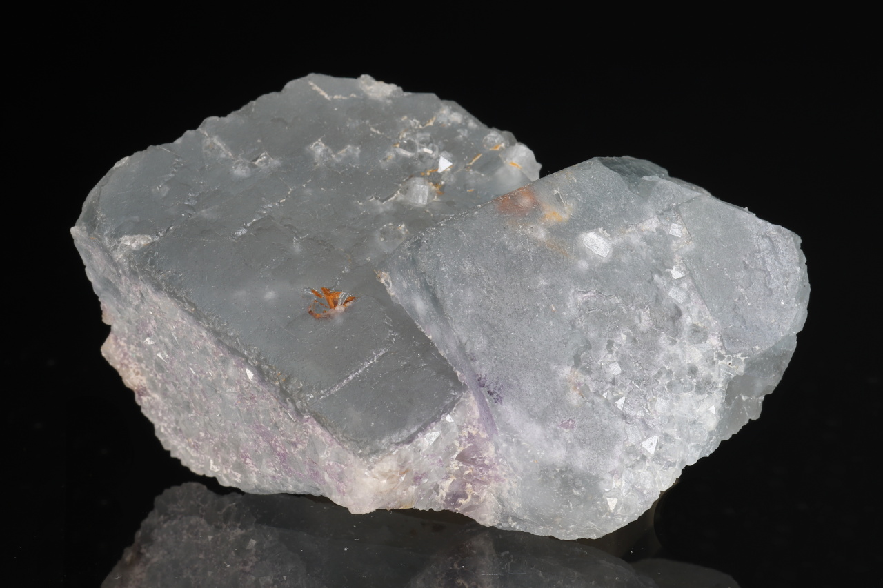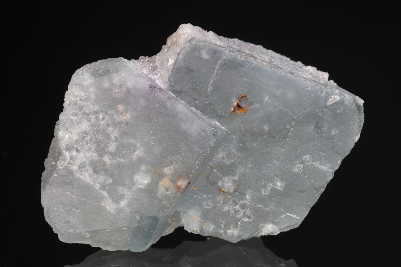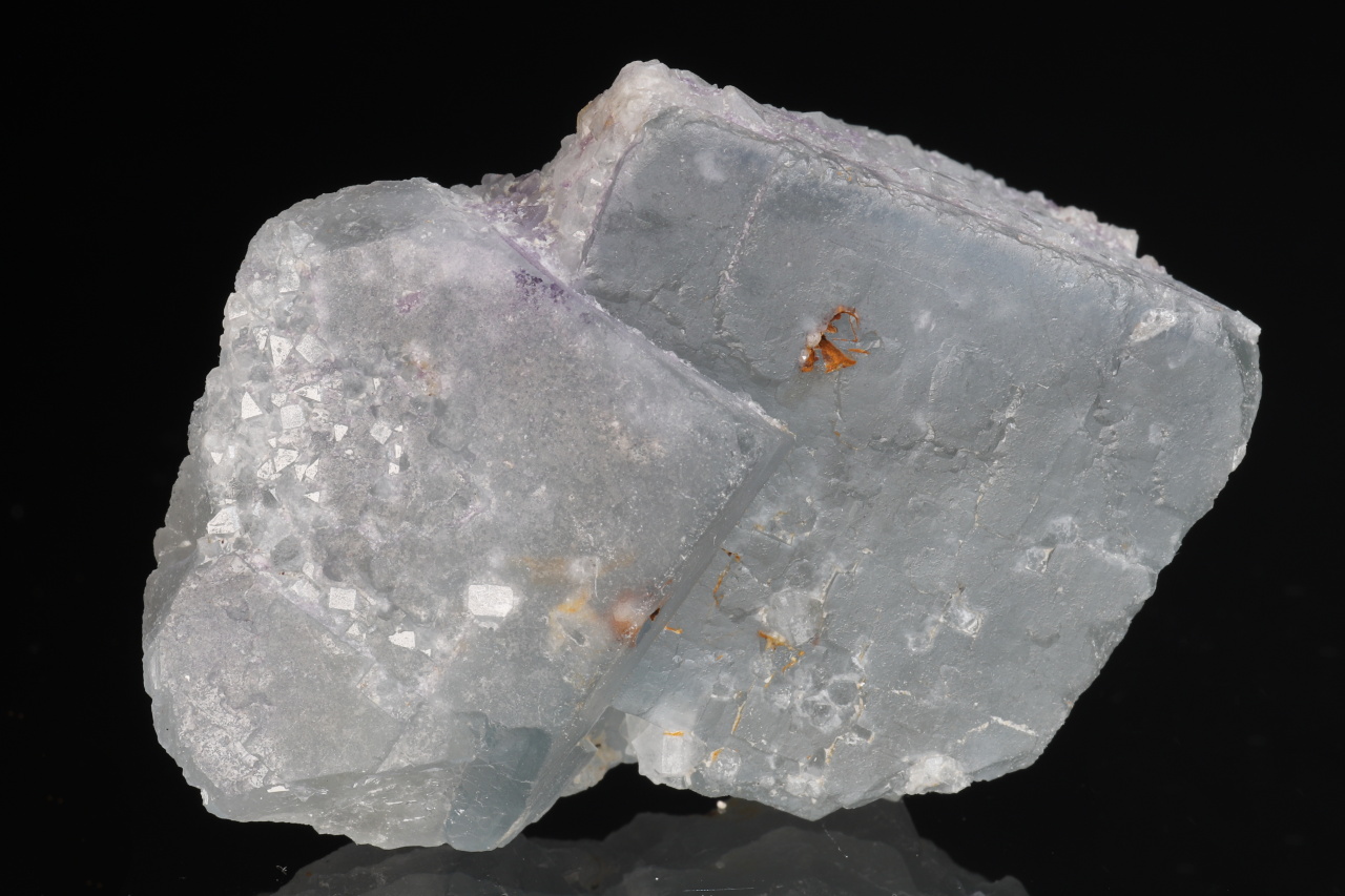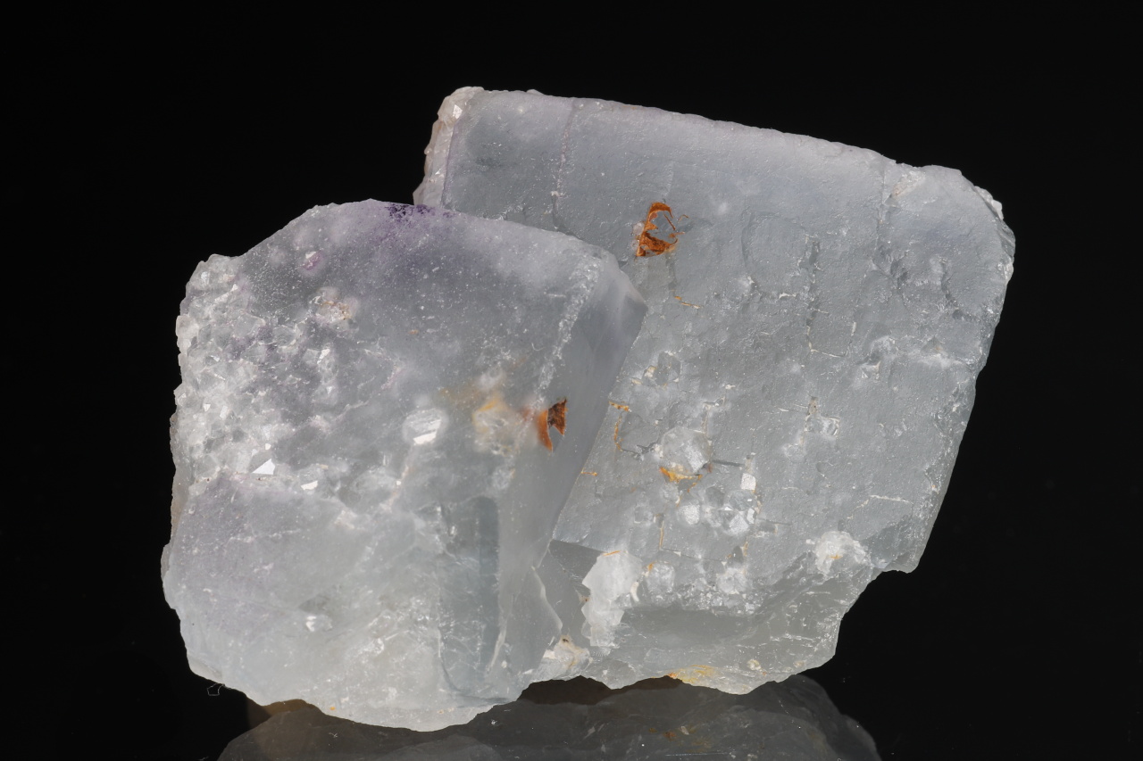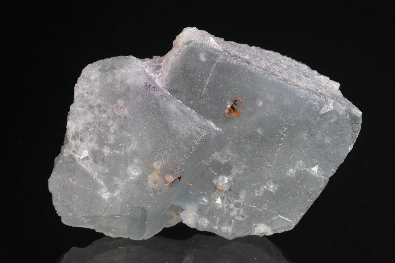 Volná srostlice dvou namodralých krychlových krystalů fluoritu o největší hraně 33 mm. Vzorek pochází z historických nálezů na fluorit-barytovém ložisku Harrachov v Krkonoších.
