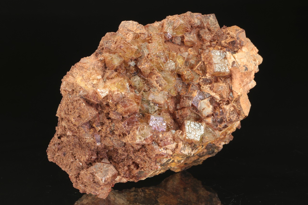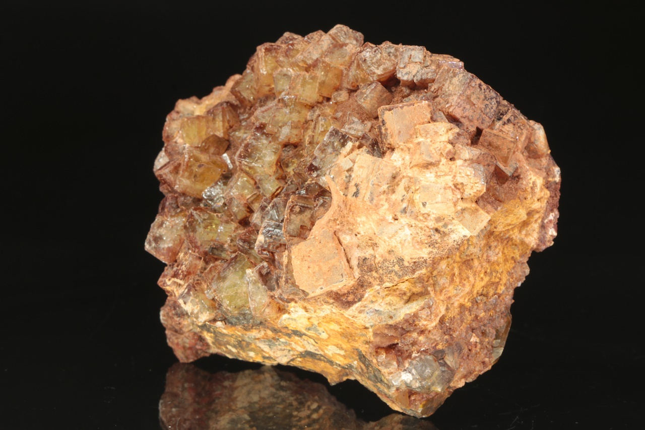 Druse von kubischen Kristallen aus gelbem Fluorit. Der größte Kristall ist 1 cm groß.