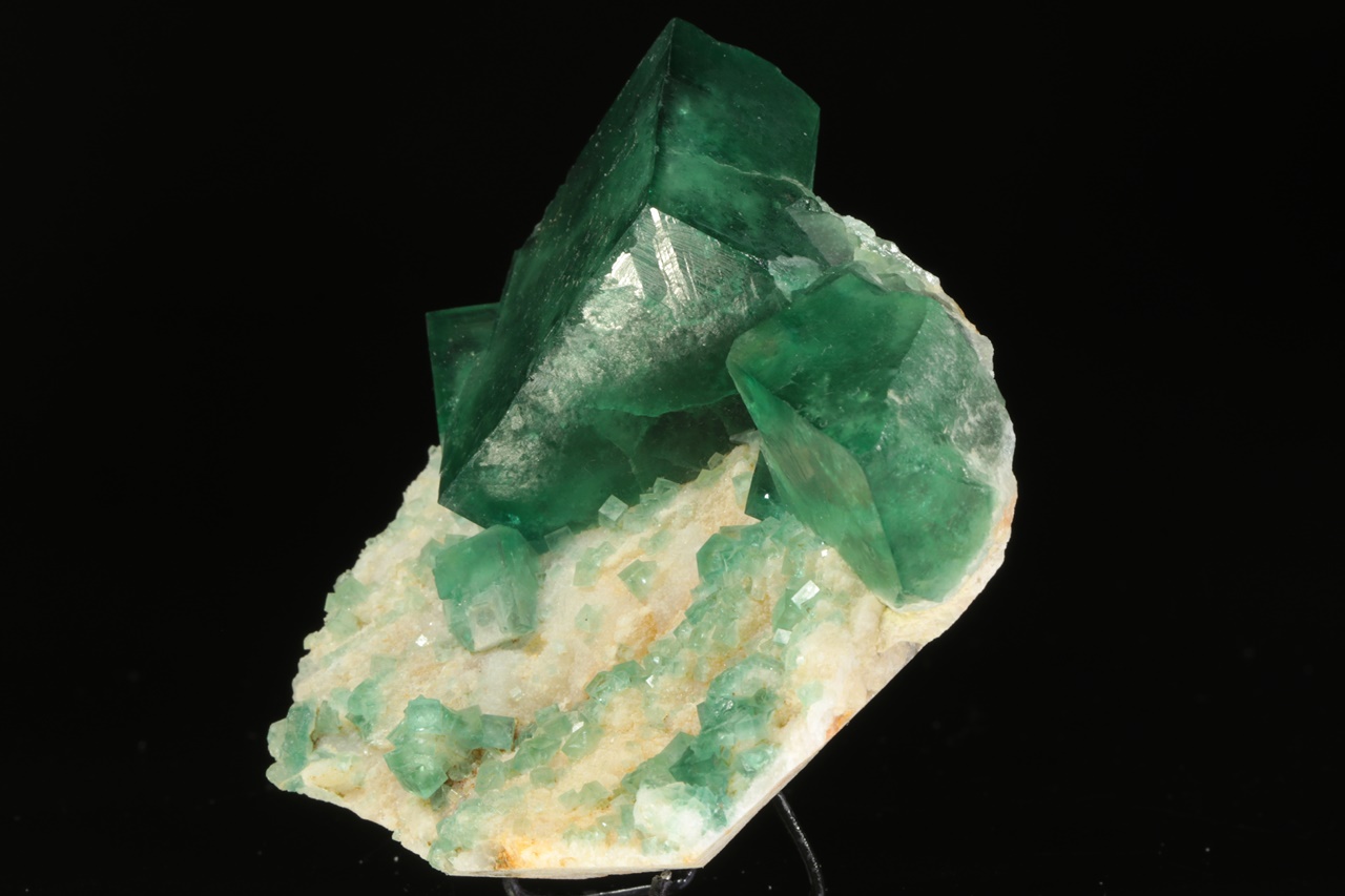 Krystalle von intensiv grünem, durchscheinendem Fluorit, gewachsen auf einer weißen Unterlage. Der größte Kristall ist 3,5 cm groß.