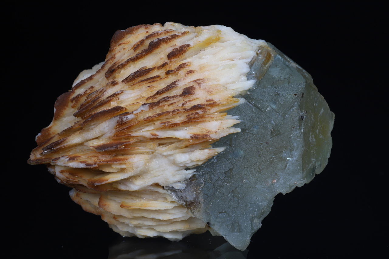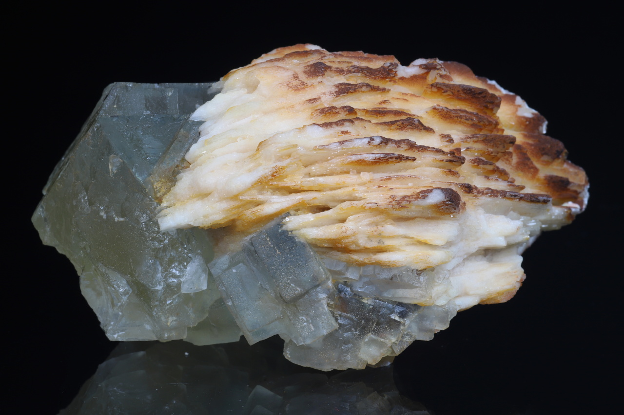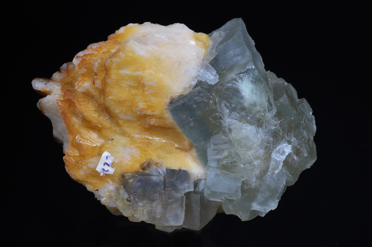 Estetický „plovák“ tvořený tabulkovitými krystaly barytu s krychlovými krystaly na povrchu namodralého a uvnitř žlutého fluoritu. Nejdelší hrana krystalů fluoritu dosahuje 4 cm. Tato kvalitní ukázka pochází z historických nálezů na fluorit-barytovém ložisku Harrachov v Krkonoších.