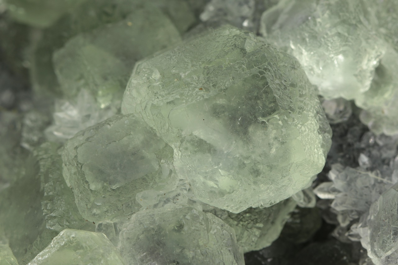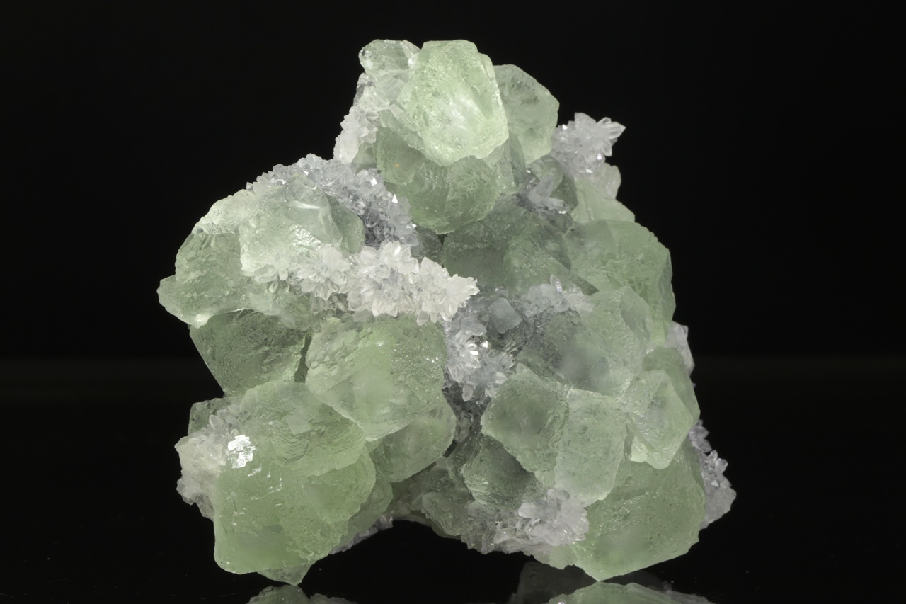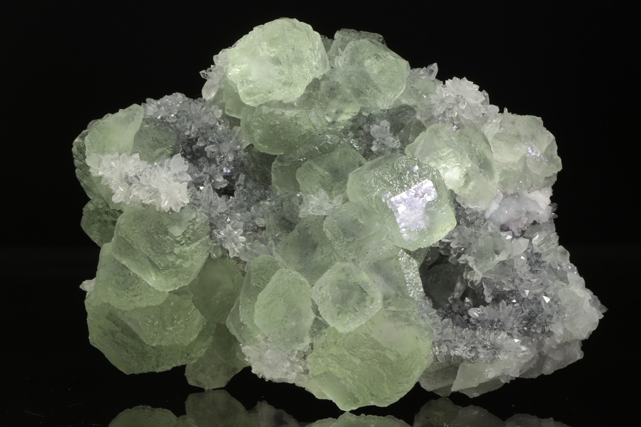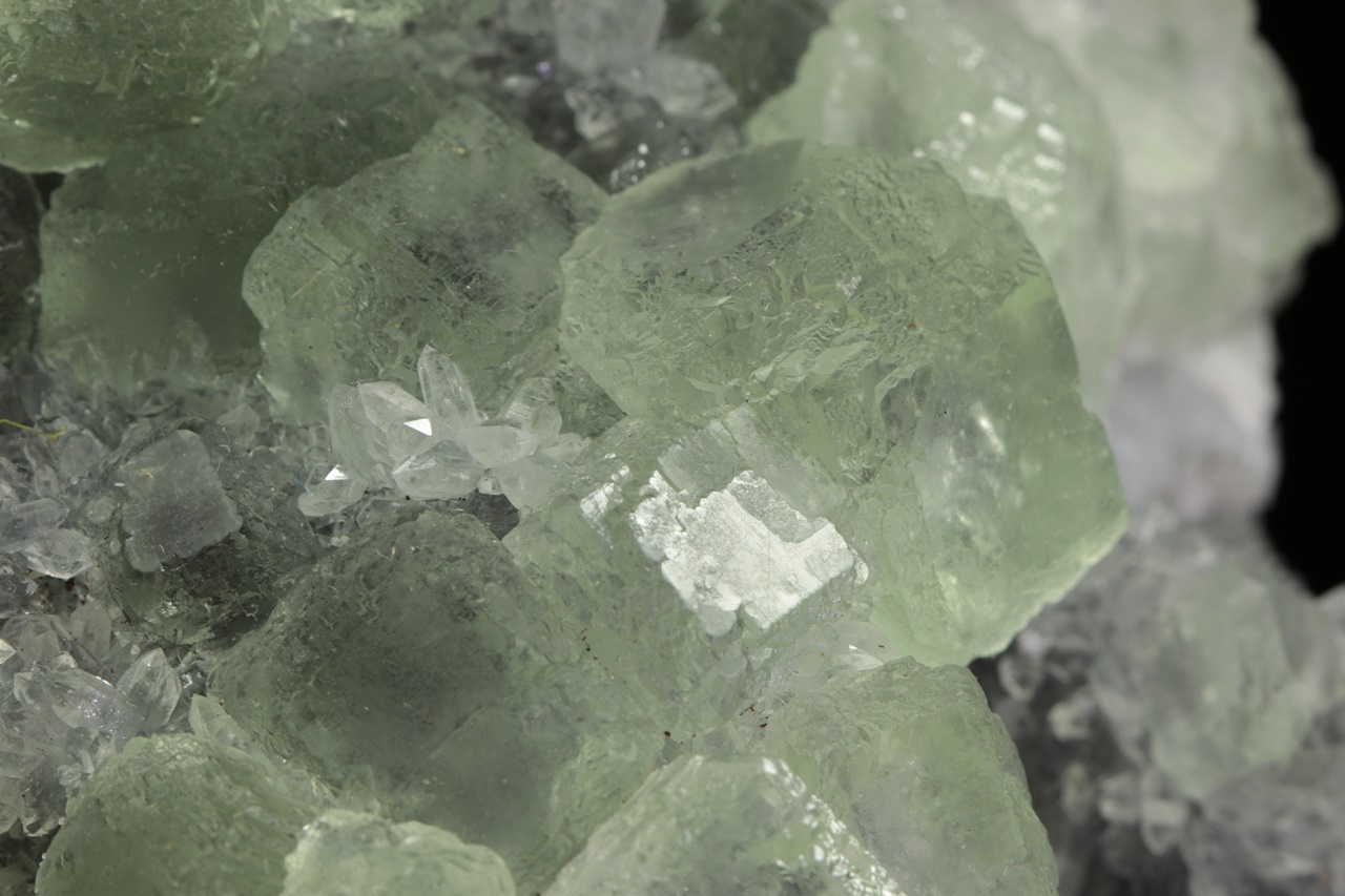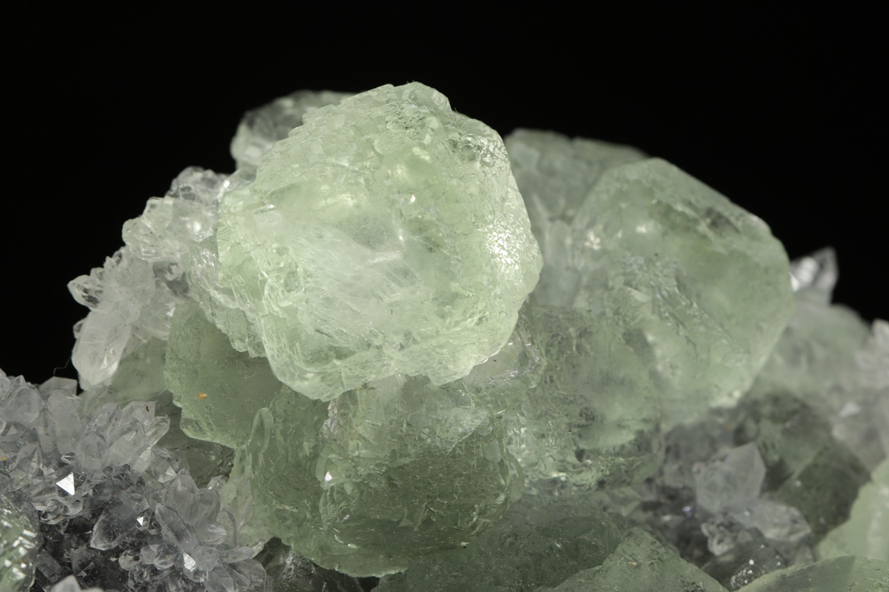 Nádherná ukázka průzračných krystalů světle zeleného fluoritu tvořících spojky krychle a rombododekaedru s kříšťálem. Největší vzorek fluoritu je 2,5 cm velký.