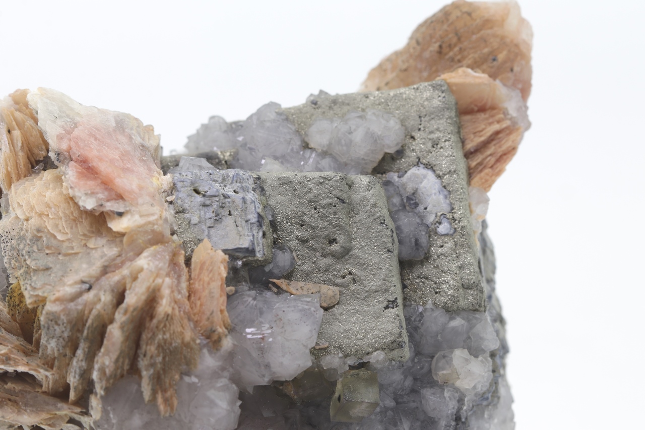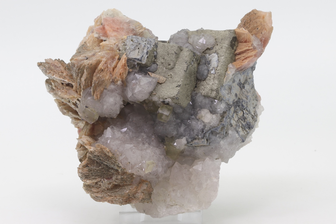 Große kubische Galenit-Kristalle (bis zu 4 cm groß), teilweise überwachsen mit feinem Pyrit, mit hell orangefarbenen, leistenförmigen Baryt-Kristallen und Quarz, auf dem hellgelbe Fluorit-Kristalle von ca. 5 mm Größe wachsen .