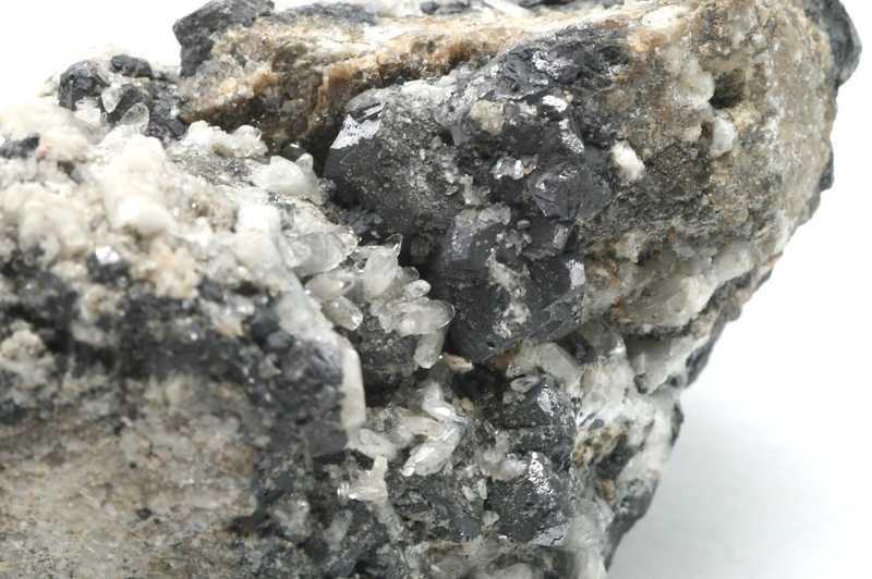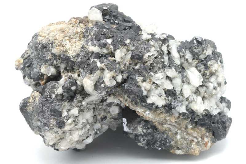Ästhetisches Exemplar des Minerals Galenit aus der Lokalität Bleiberg, Österreich. Druse von Galenit-Kristallen überzogen mit Cerussit.