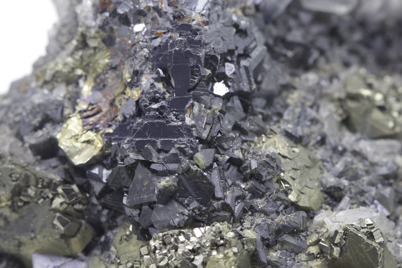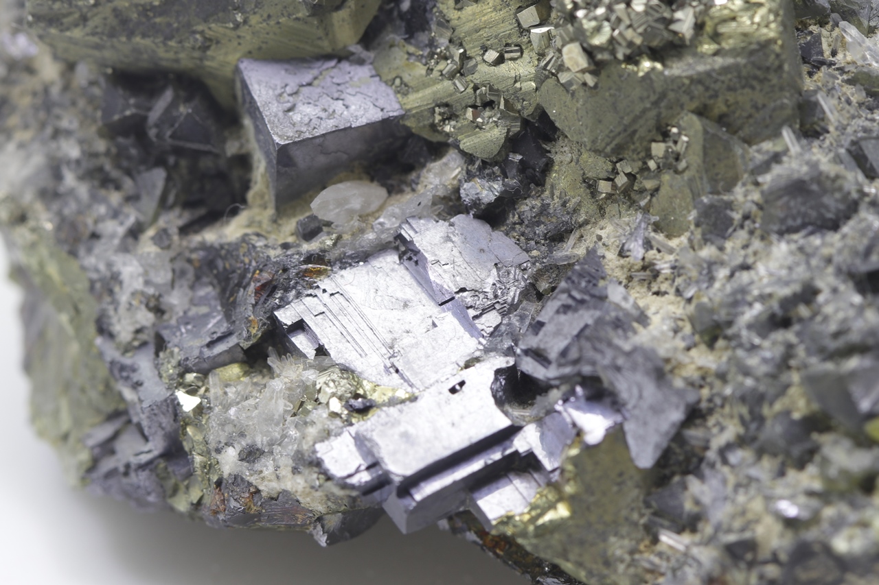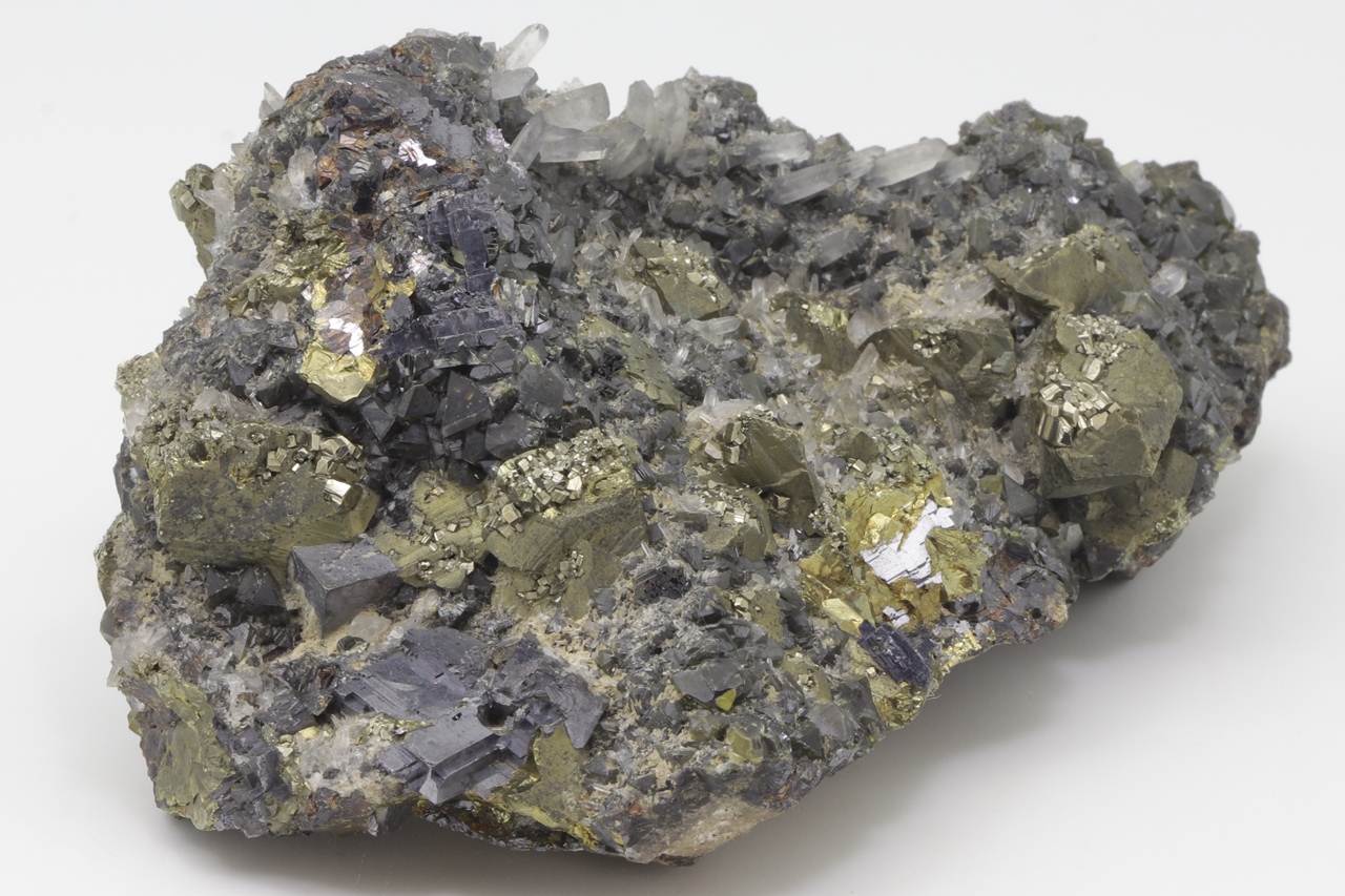 Kristalle von grauem, metallisch glänzendem Galenit, verwachsen mit großen, goldenen Kristallen von Chalkopyrit, an denen kleinere kubische Kristalle von Pyrit anwachsen.