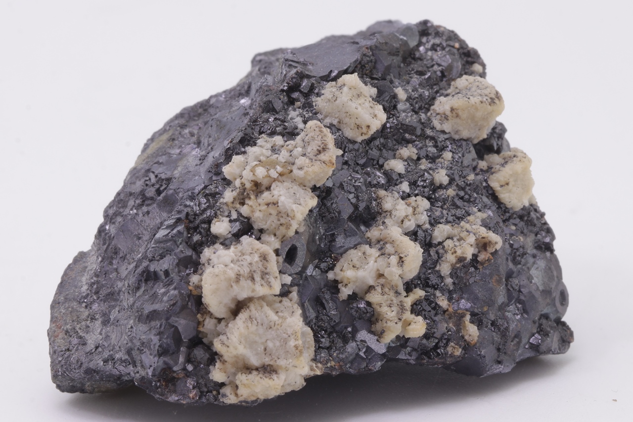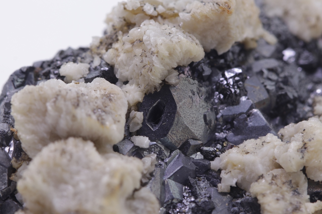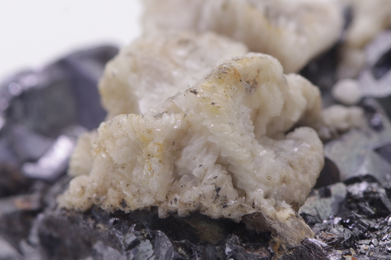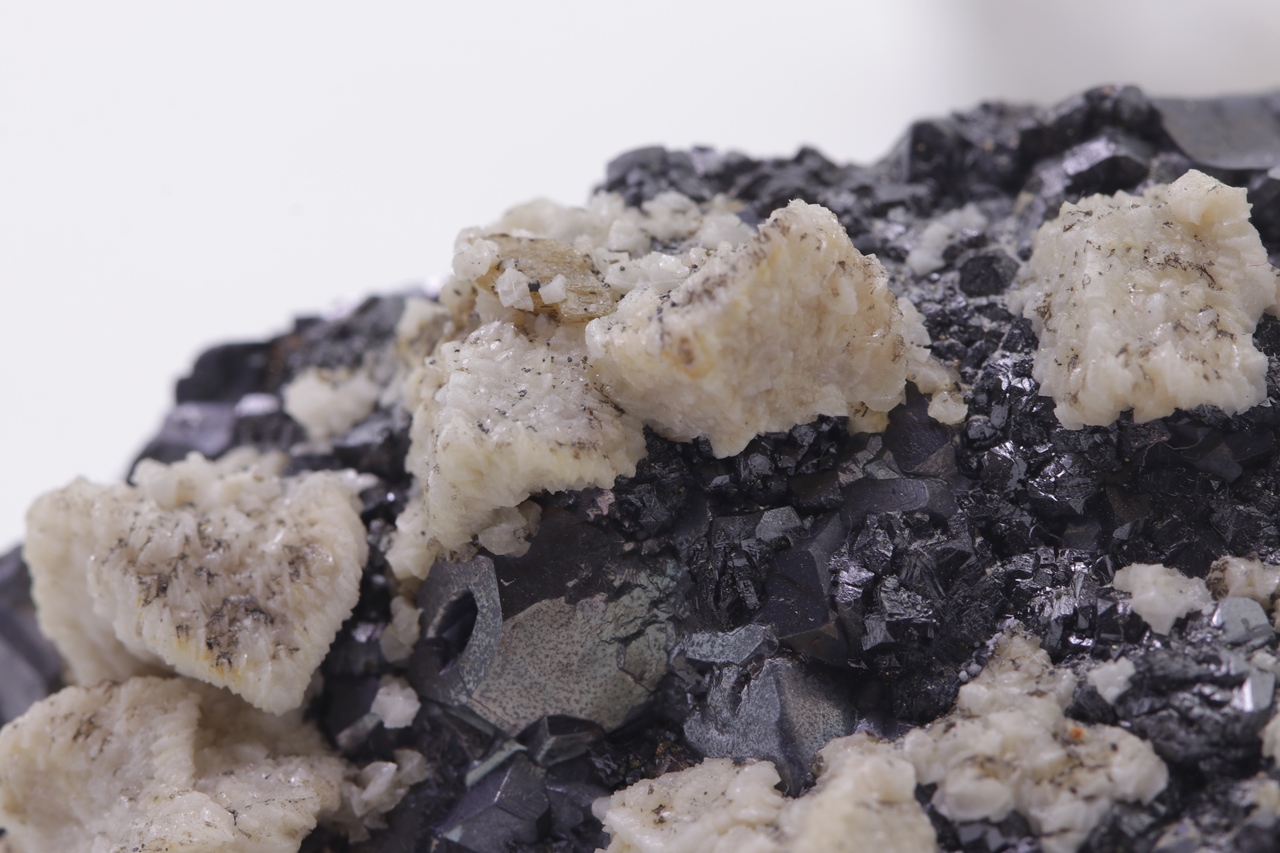 Beige Dolomitkristalle auf schwarzem Galenit mit teilweise skelettartiger Entwicklung.