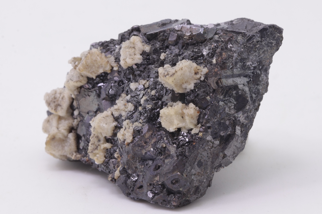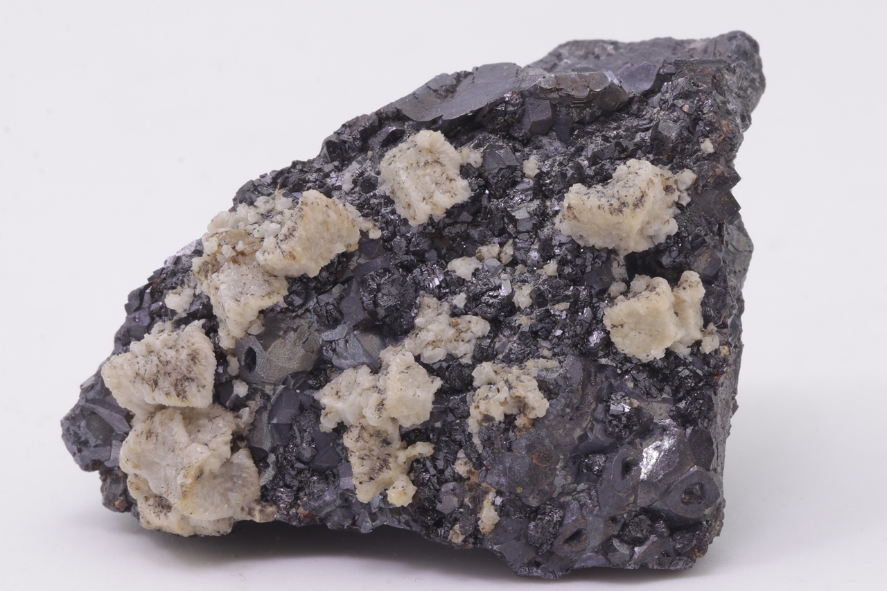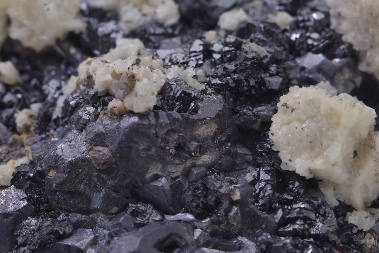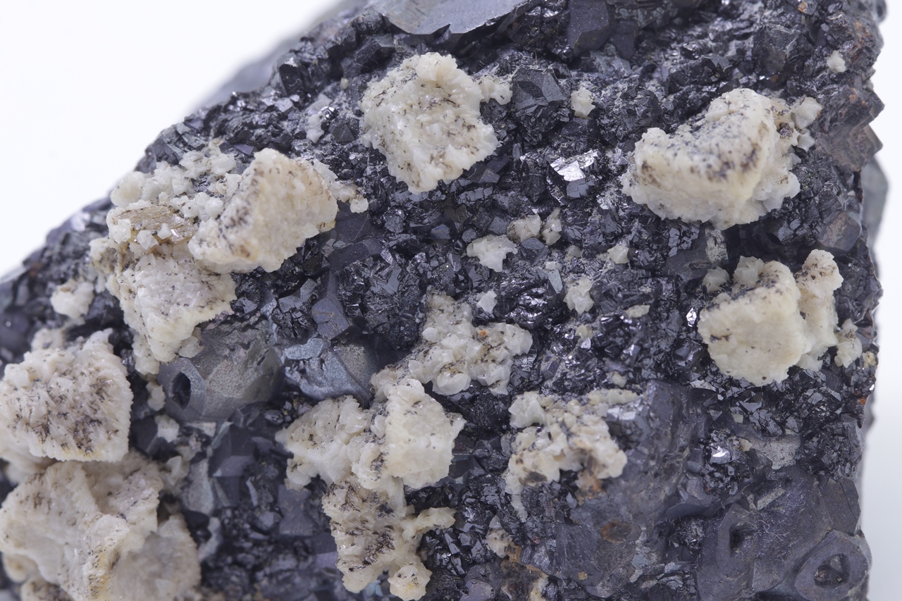 Beige Dolomitkristalle auf schwarzem Galenit mit teilweise skelettartiger Entwicklung.