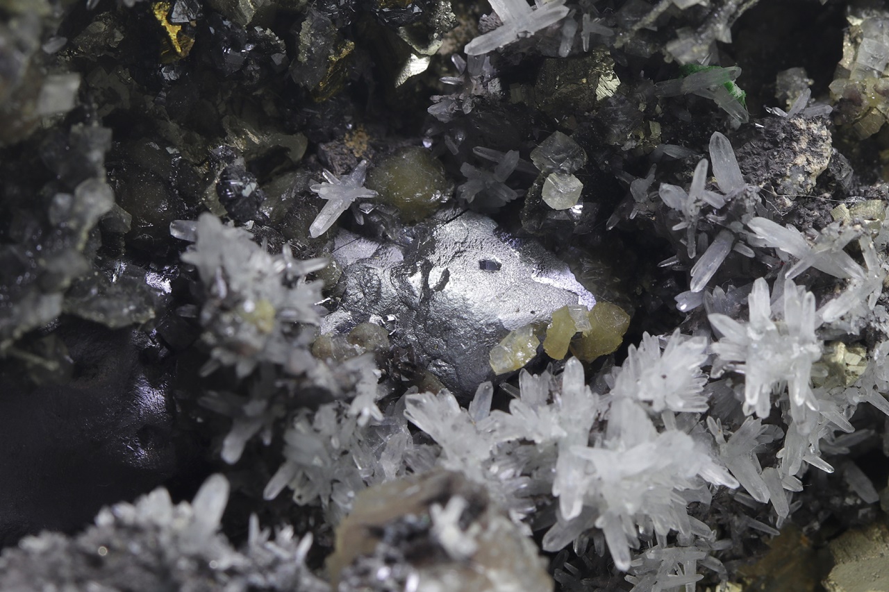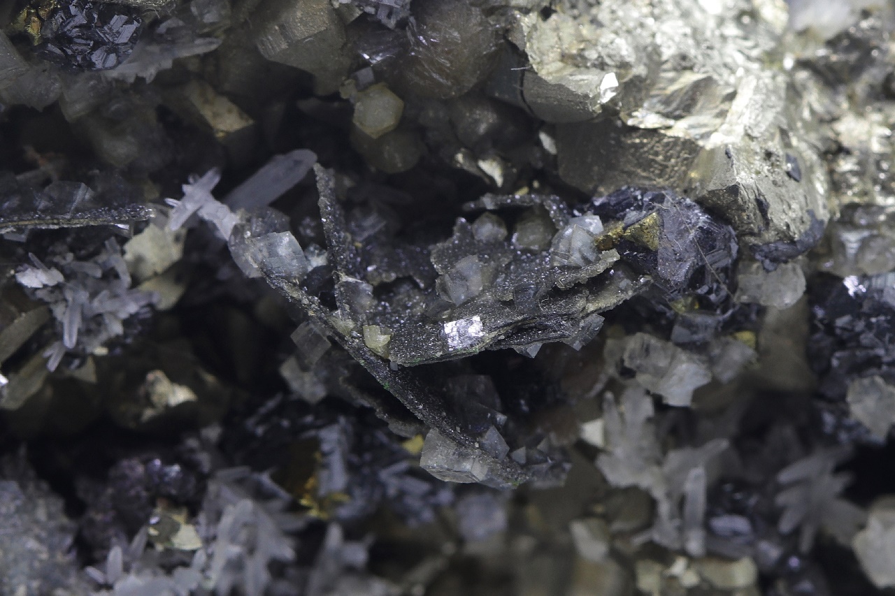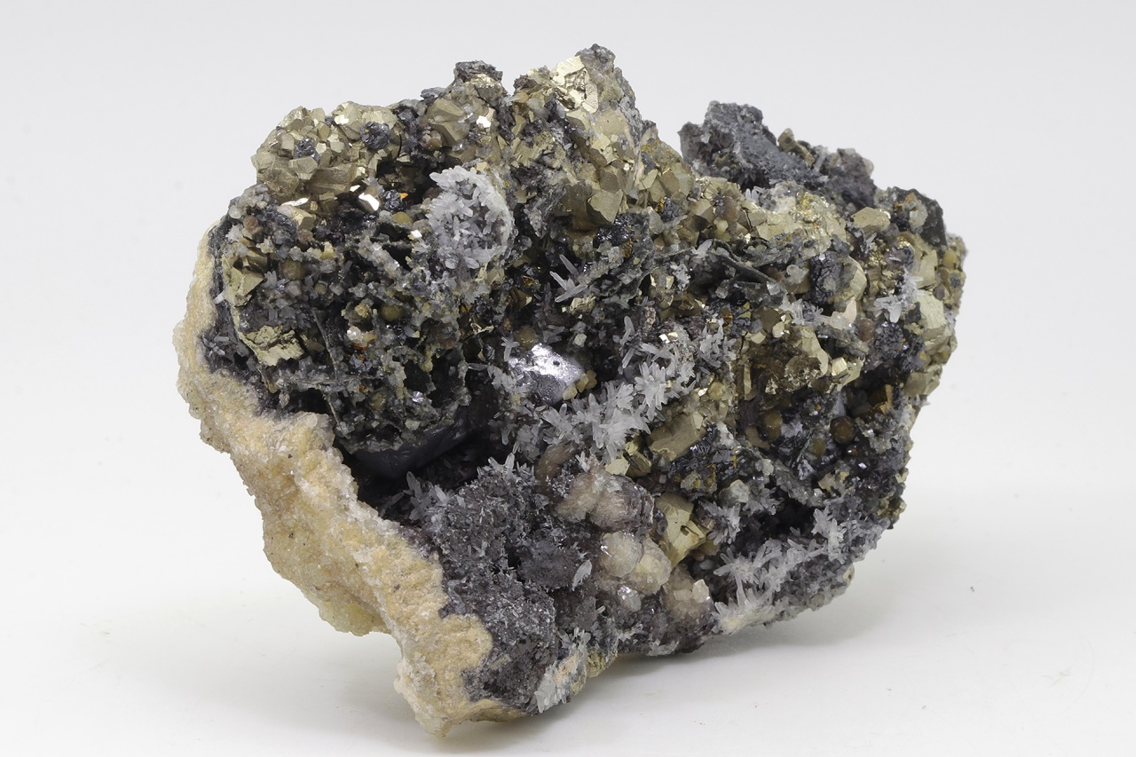 Mineralogisch sehr vielseitige Probe, die aus großen Kristallen von Galenit und Pyrit besteht, welche den tabularen Pyrhotin überwachsen, zusammen mit kugelförmigen Aggregaten von Dolomit und Semseyit.