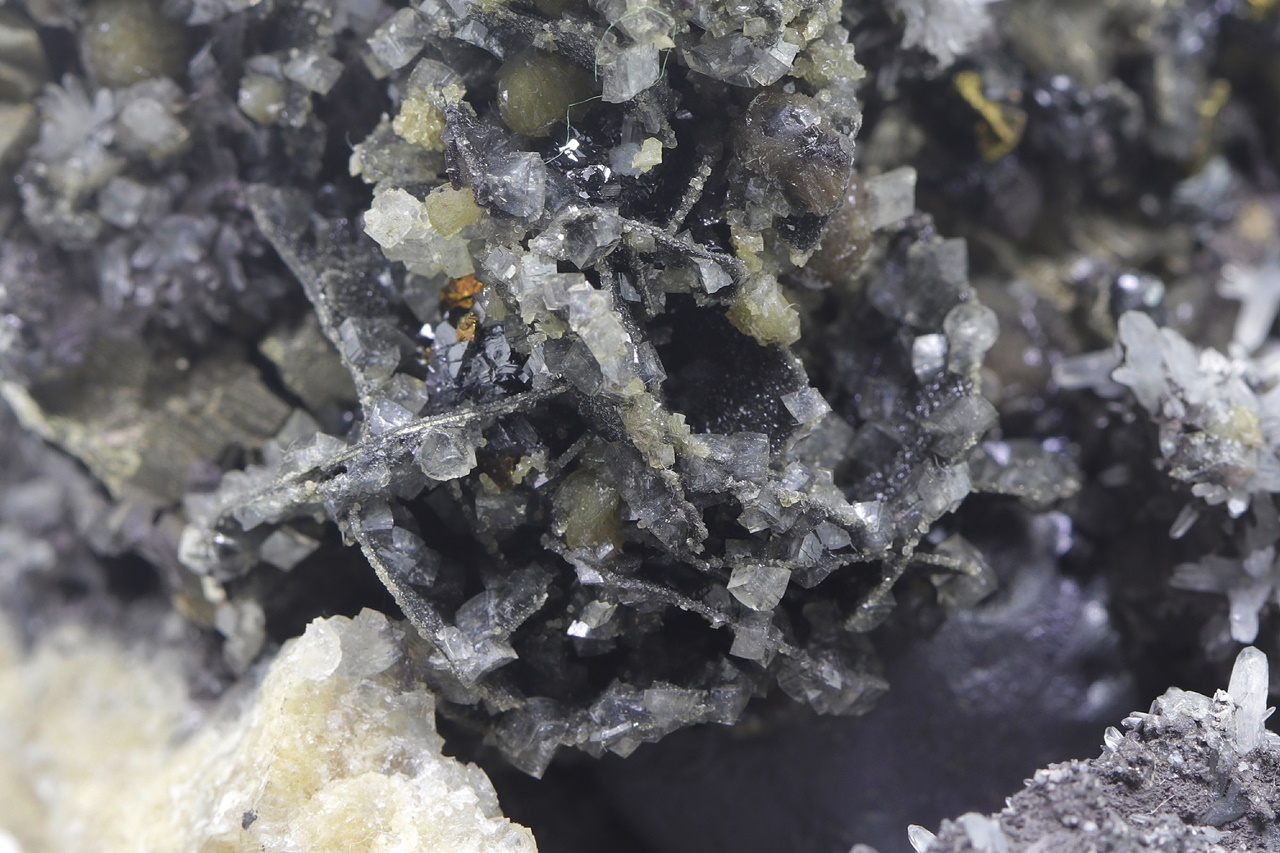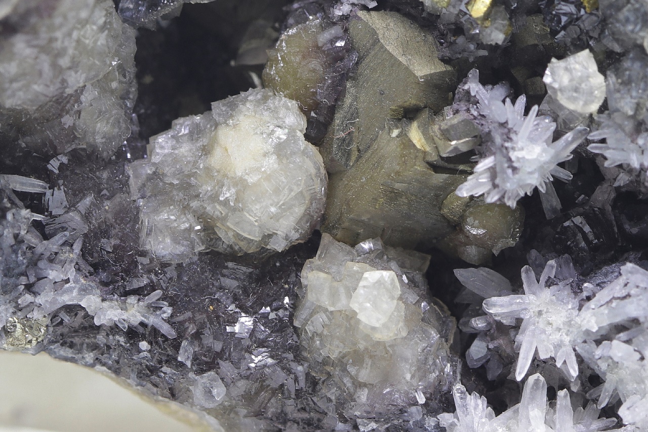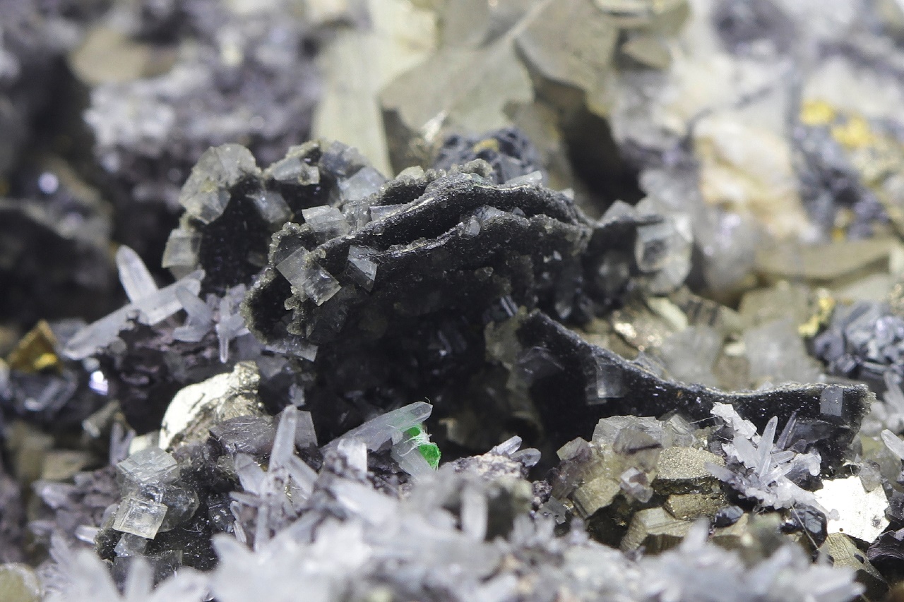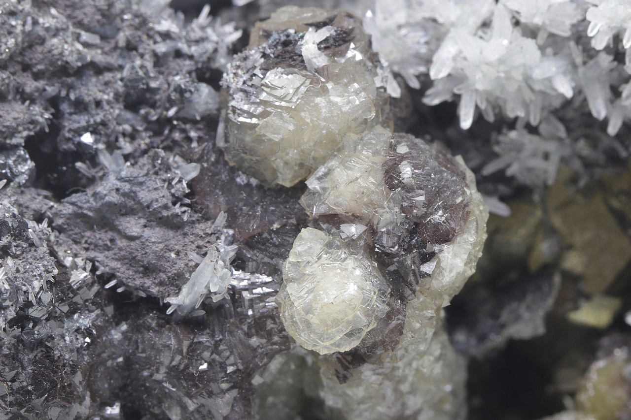 Mineralogisch sehr vielseitige Probe, die aus großen Kristallen von Galenit und Pyrit besteht, welche den tabularen Pyrhotin überwachsen, zusammen mit kugelförmigen Aggregaten von Dolomit und Semseyit.