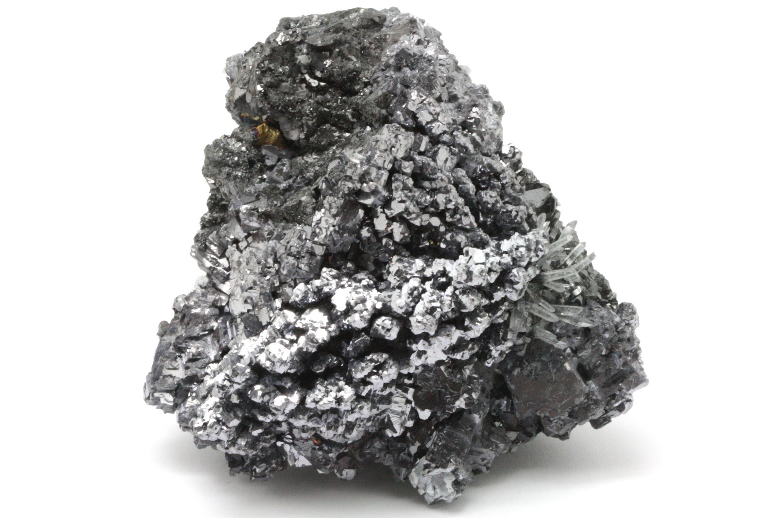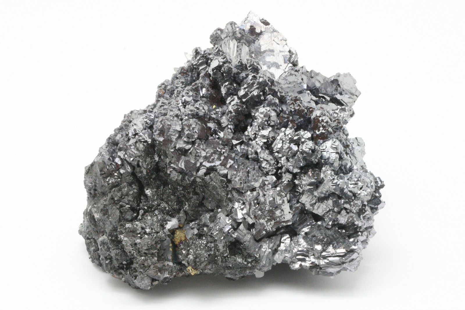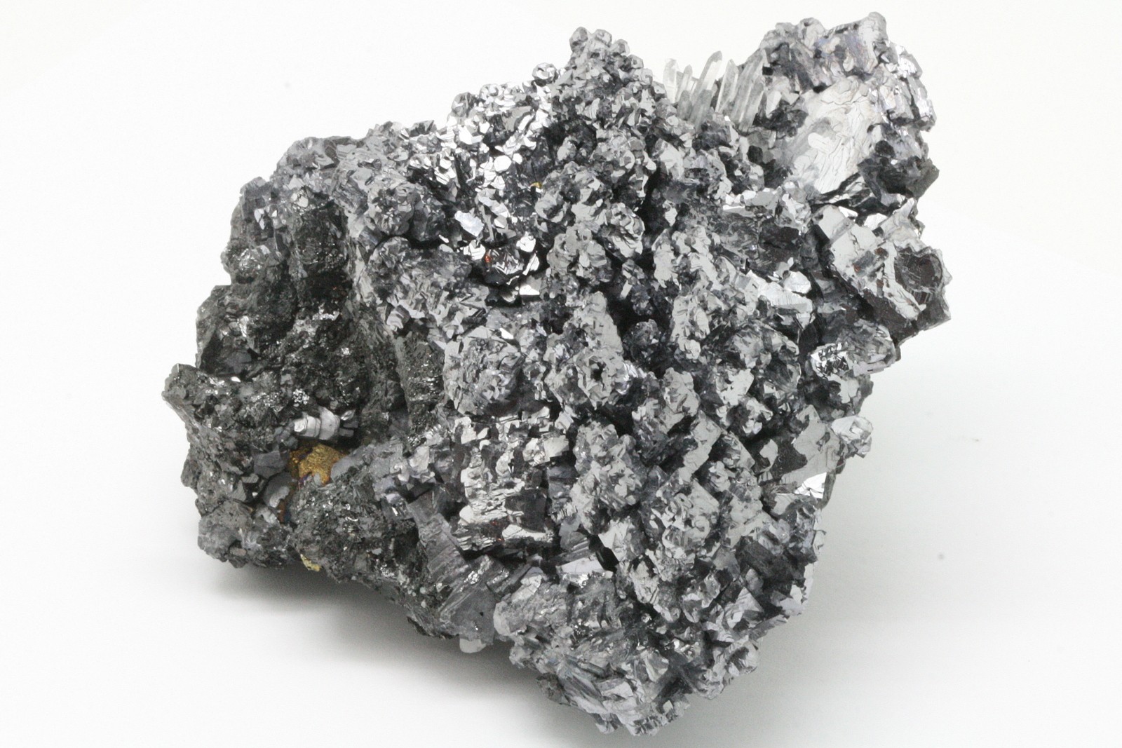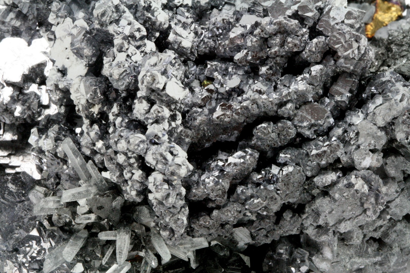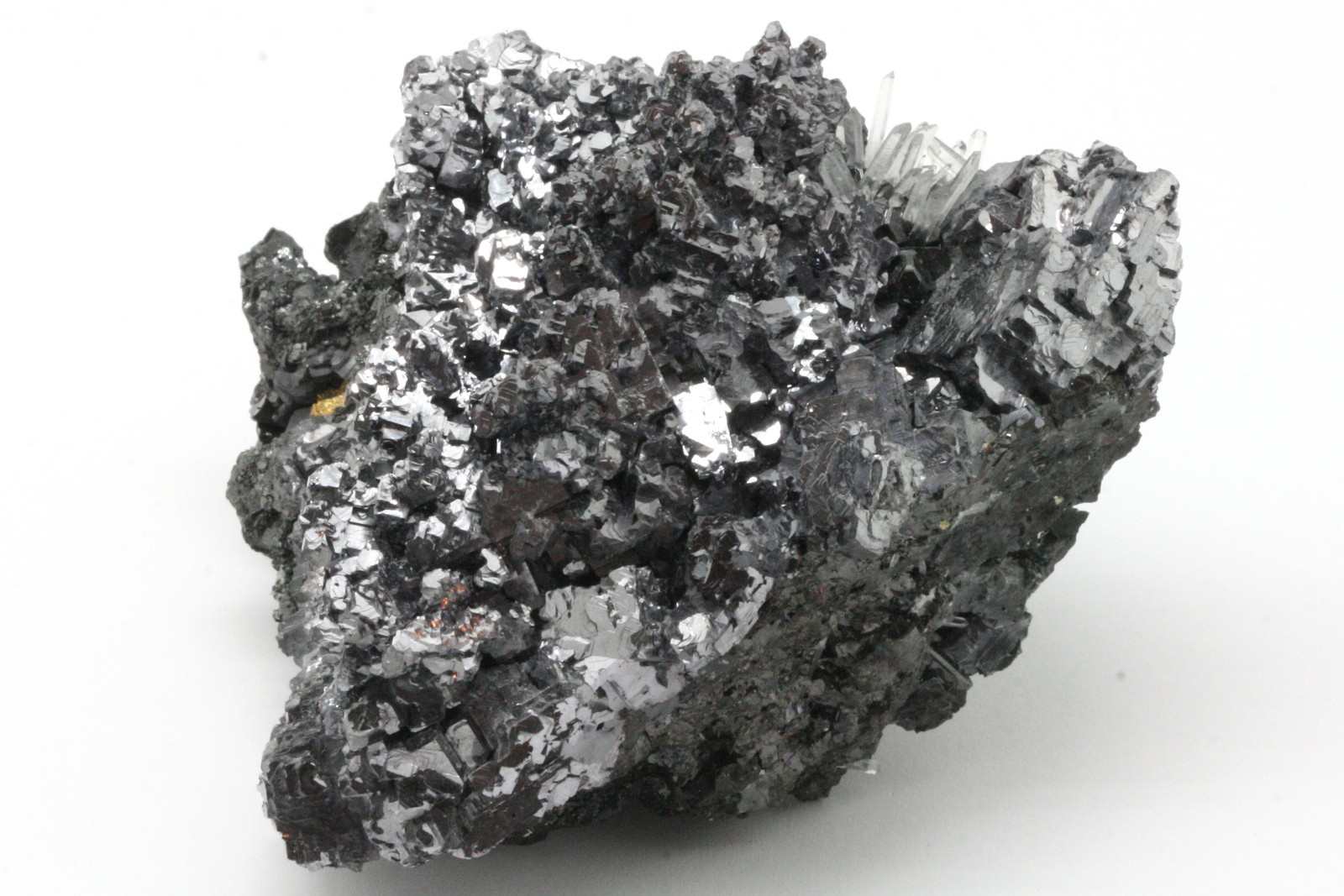 Sehr hochwertiges Exemplar von Galenit-Kristallen, an denen in der unteren Partie des Musters Kristalle von Sphalerit sitzen.