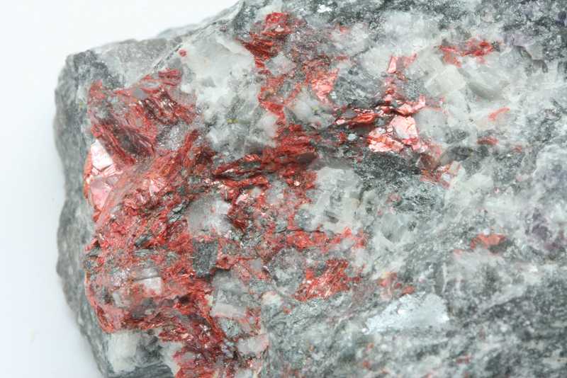Seltener dunkelroter Sulfid von Arsen und Antimon. Bis zu 4 mm große Körner von Geschellit.