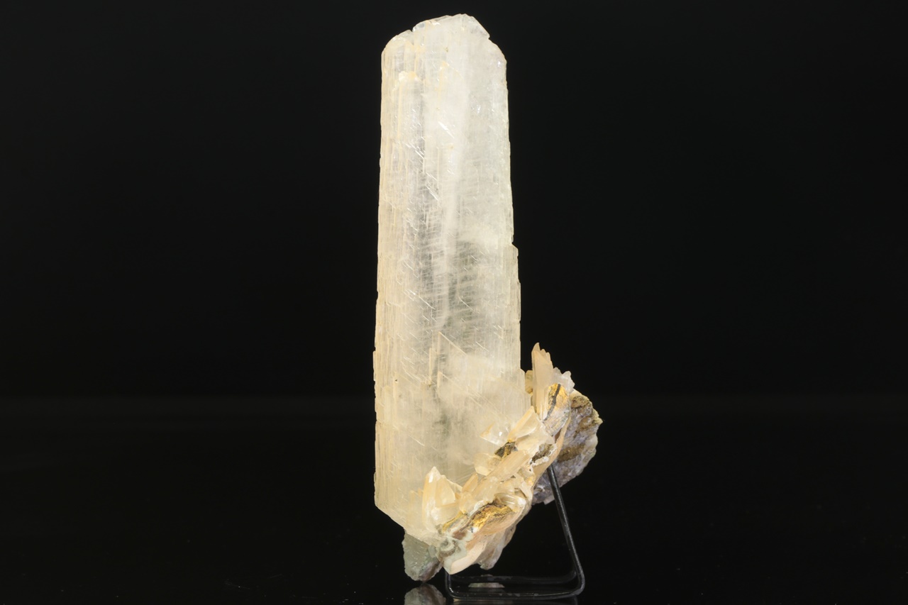 Eine ästhetische Probe durchscheinender, glänzender Sádrovce-Kristalle aus einem bekannten rumänischen Standort, beherrscht von einem elf Zentimeter langen vertikalen Kristall.