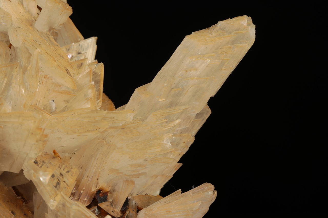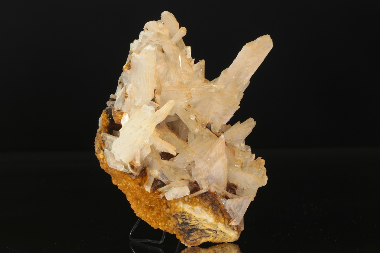 Reichhaltiger ästhetischer Stufe von Gipskristallen aus einem bekannten rumänischen Fundort. Die durchscheinenden Kristalle wachsen auf beigem Dolomit. Der größte Gipskristall ist 5 cm groß.