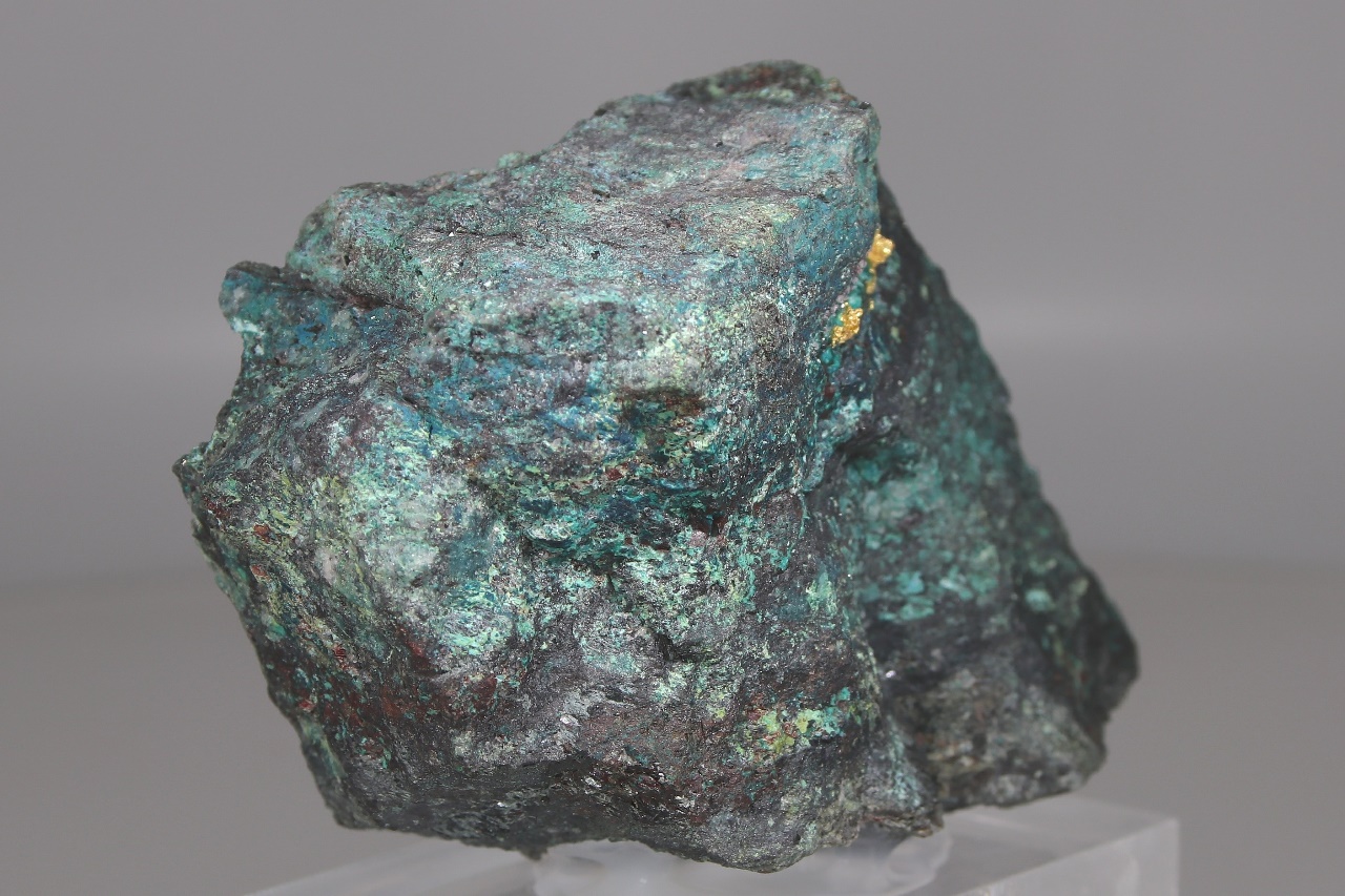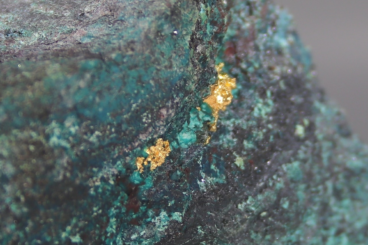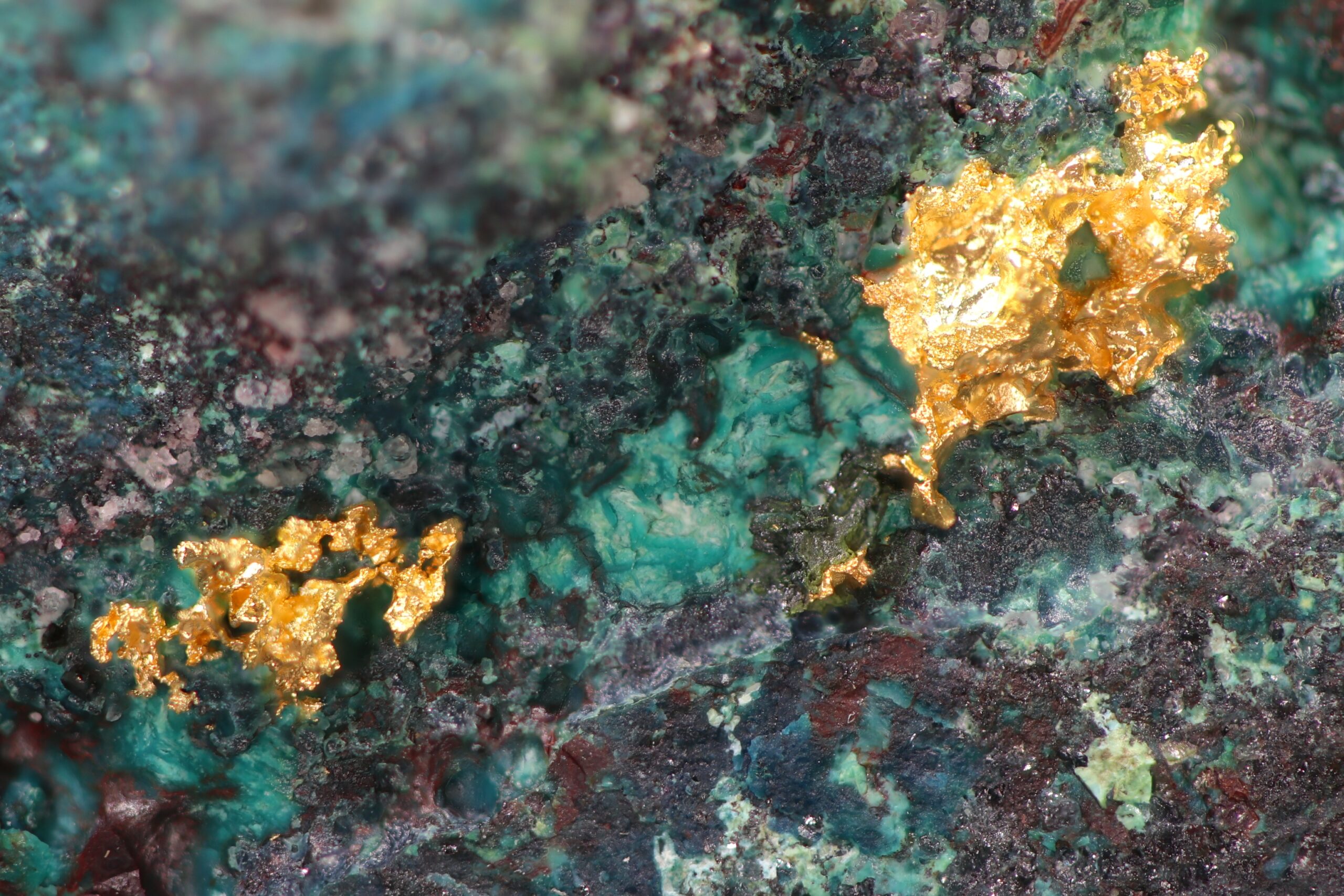 Zwei Aggregate von reinem Gold (5 und 6 mm groß) ragten in den Raum der Gangart, die aus Quarz und sekundären Kupfermineralien besteht.