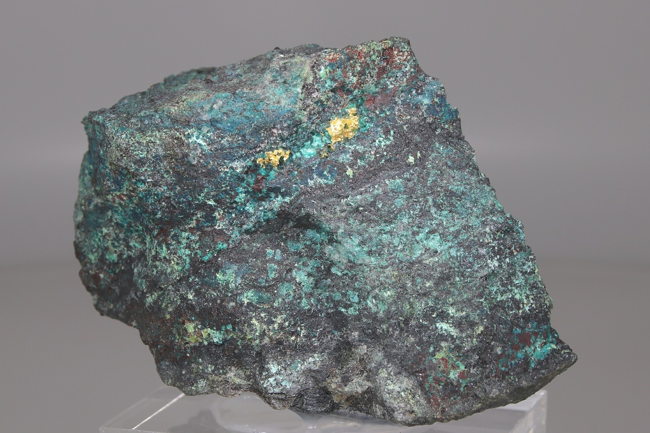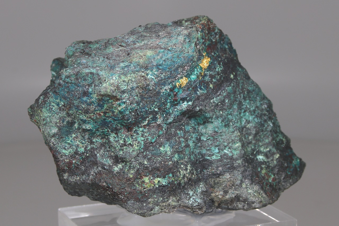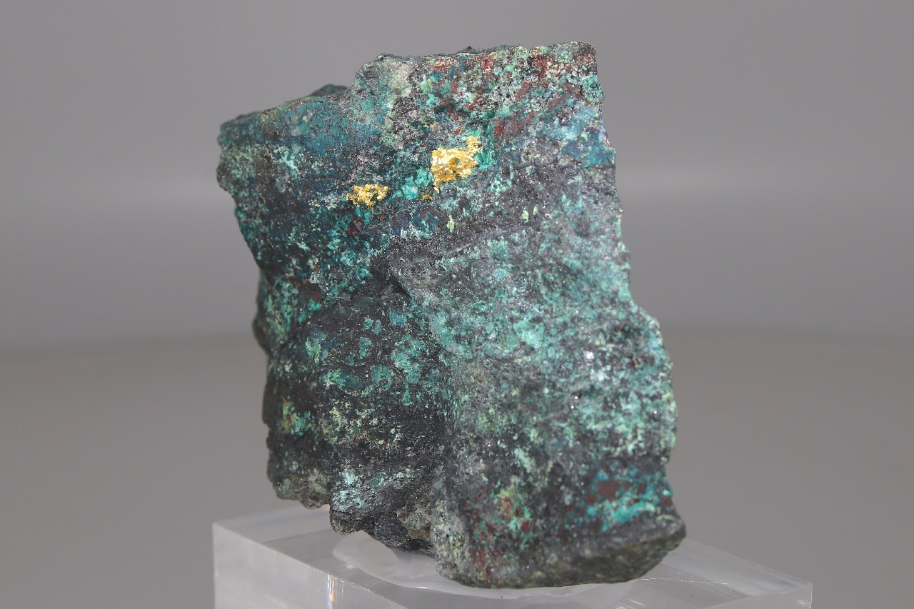 Zwei Aggregate von reinem Gold (5 und 6 mm groß) ragten in den Raum der Gangart, die aus Quarz und sekundären Kupfermineralien besteht.