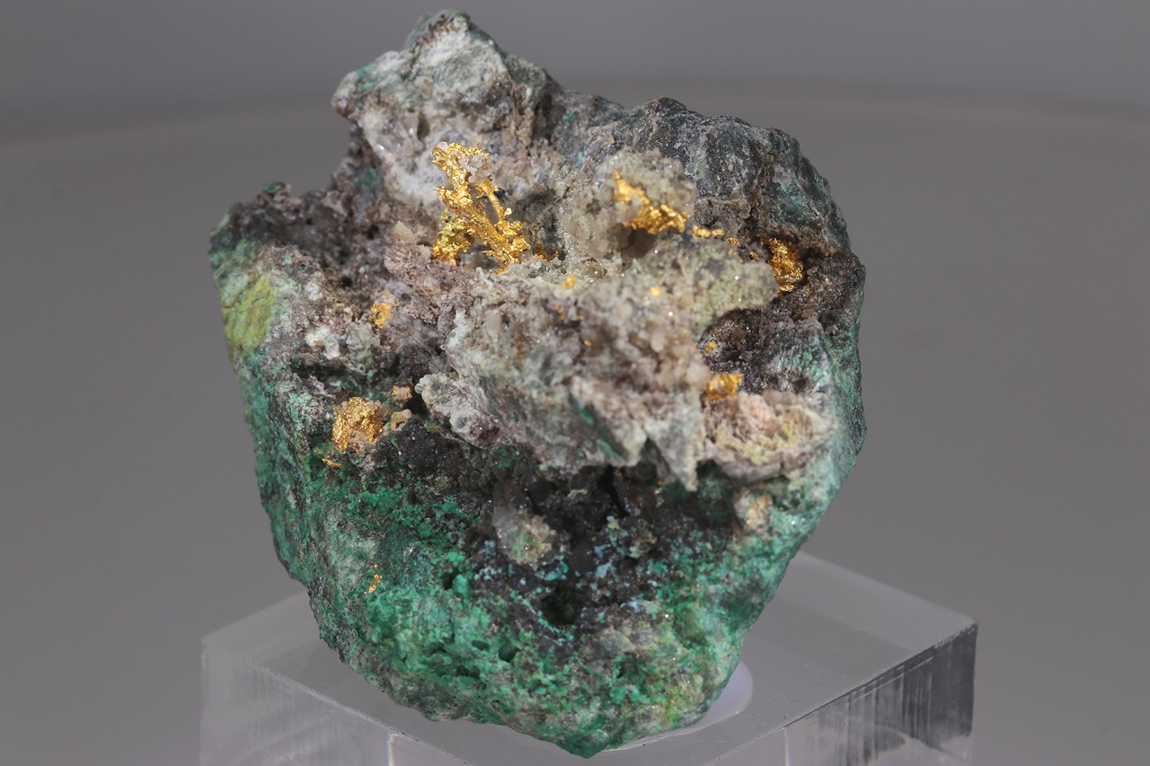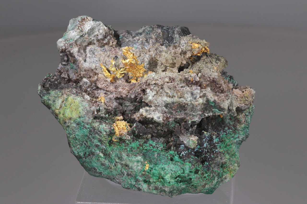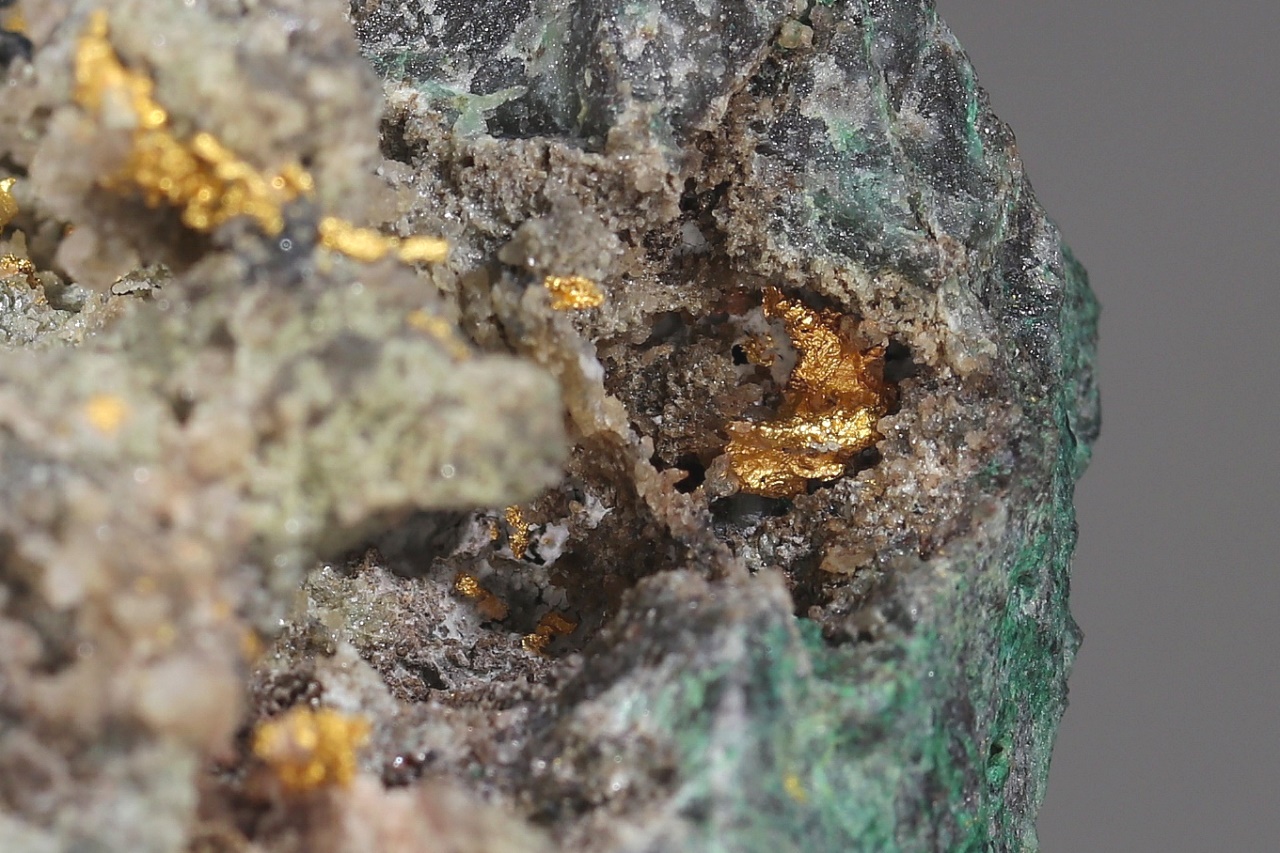 Außergewöhnlich reichhaltige Stufe mit mehreren großen Aggregaten von reinem Gold, die aus dem Quarz-Adern hervortreten. Das größte, wunderschön verzweigte Aggregat im linken Teil der Stufe hat die Abmessungen 1,5 × 1,5 cm .