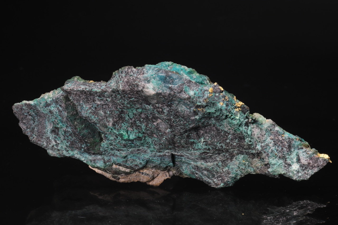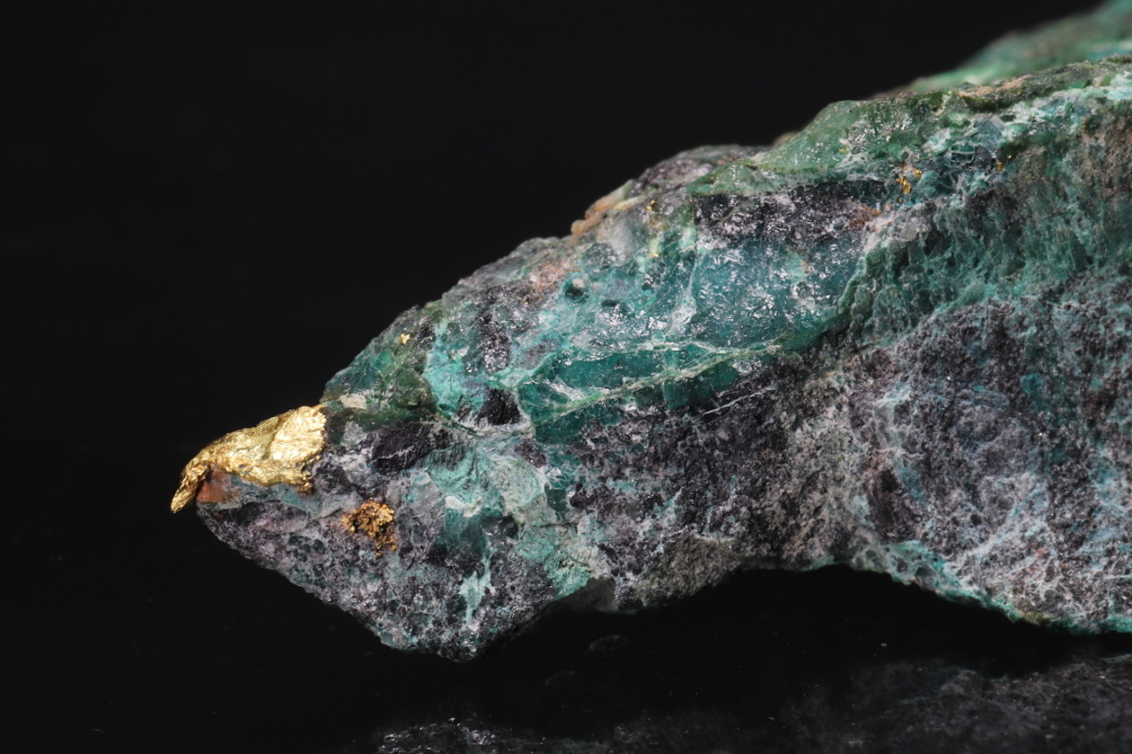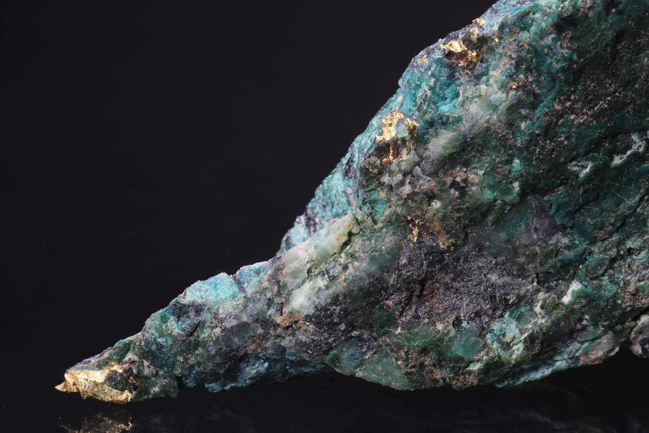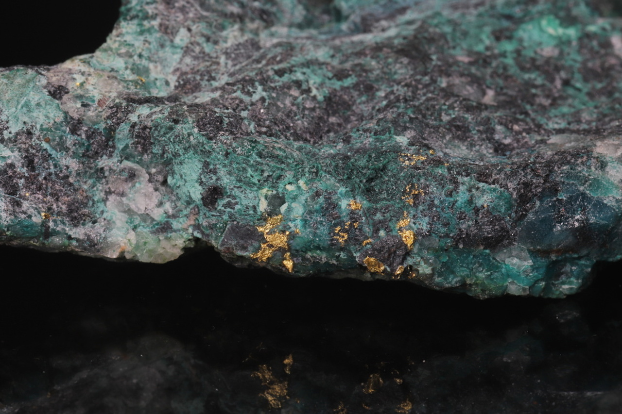 Flacher Kontrastmuster des Malachits und weiterer Cu-Minerale, reich durchwachsen mit groben Aggregaten von Gold bis zu einer Größe von 4 mm.
