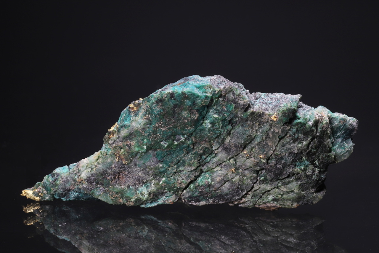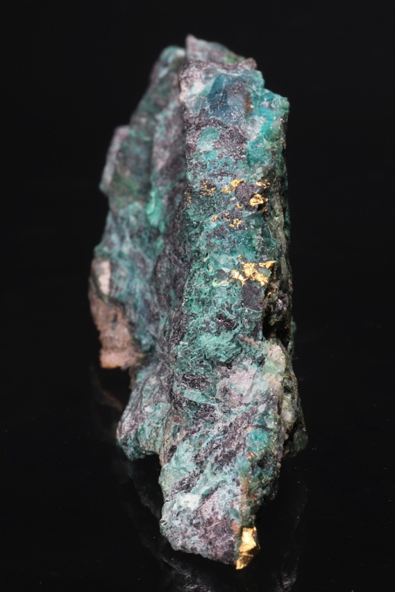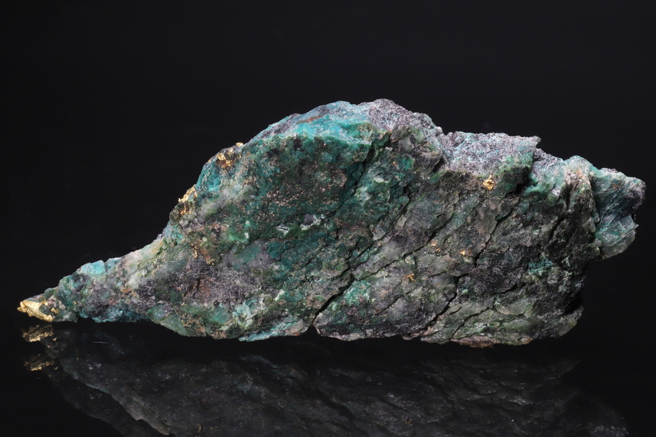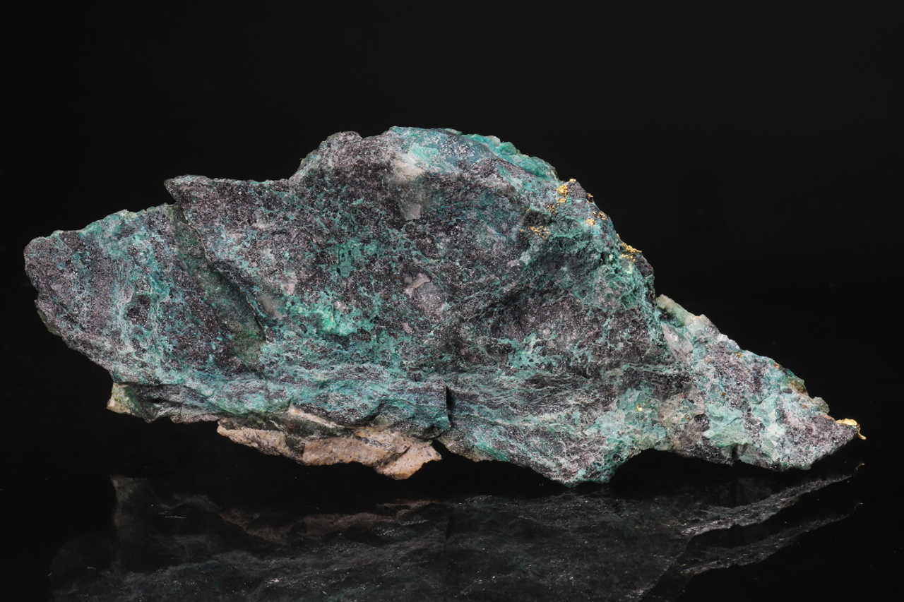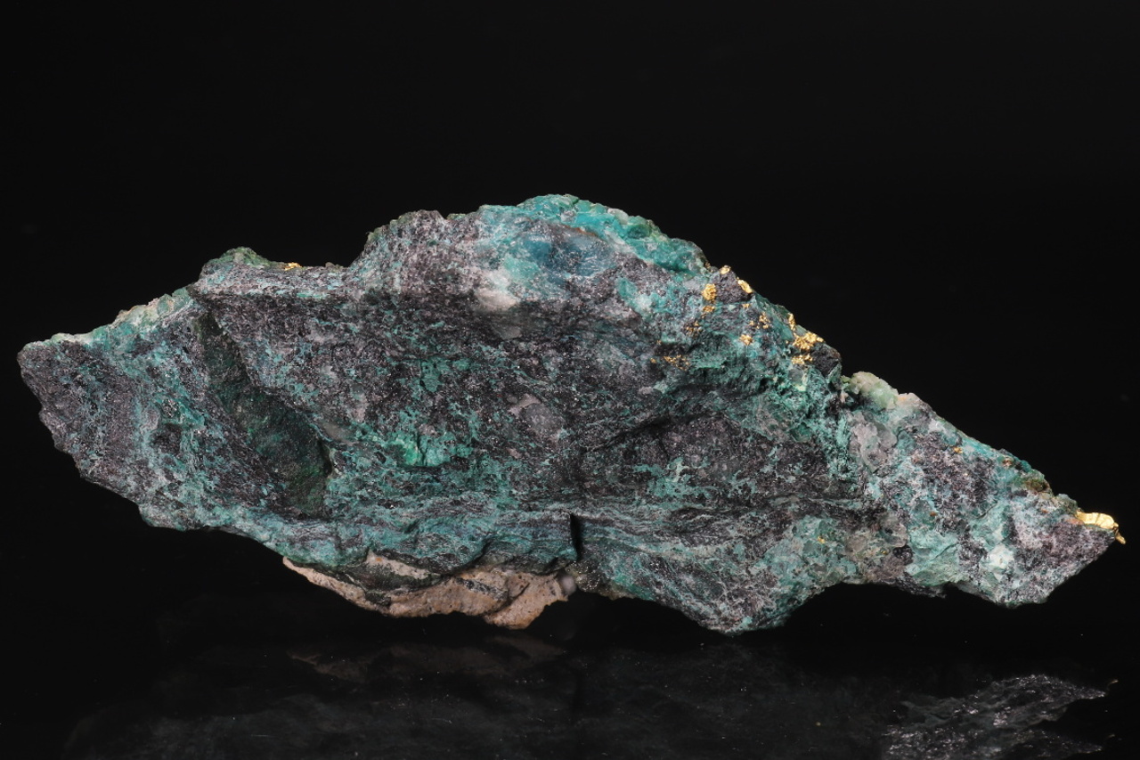 Flacher Kontrastmuster des Malachits und weiterer Cu-Minerale, reich durchwachsen mit groben Aggregaten von Gold bis zu einer Größe von 4 mm.