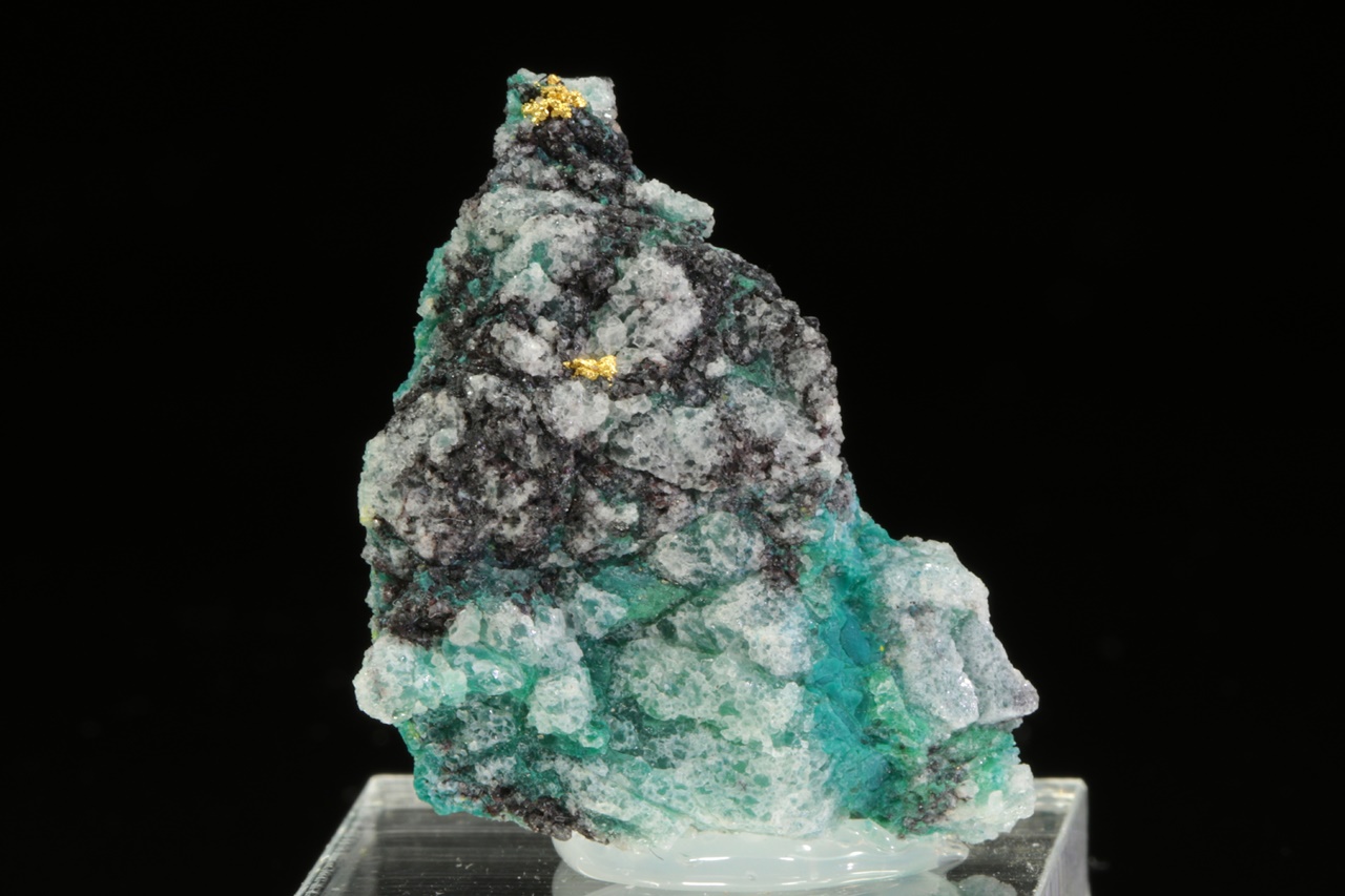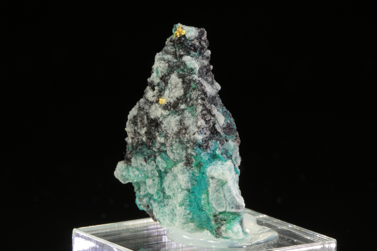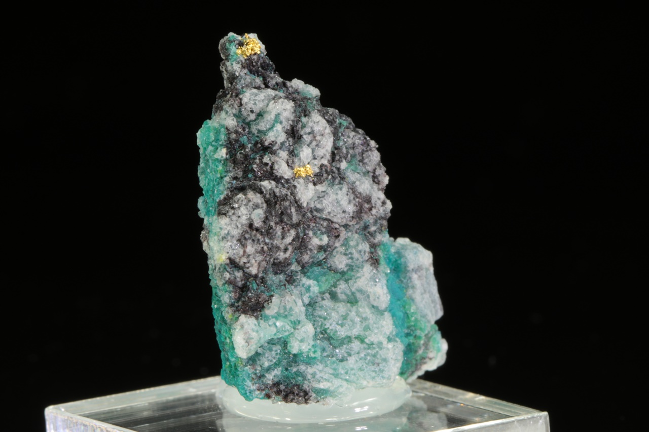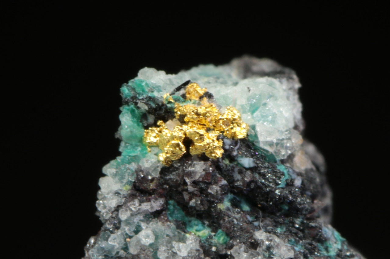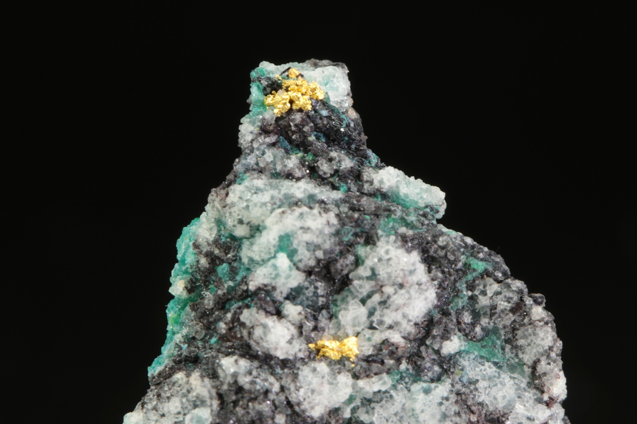 Aggregate reiner Gold in Quarzgestein mit grünen Kupfersekundärmineralien. Die Goldaggregate sind ungefähr 2 mm groß.