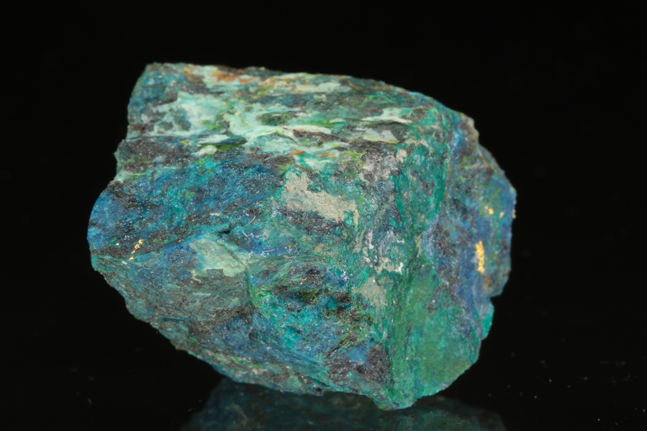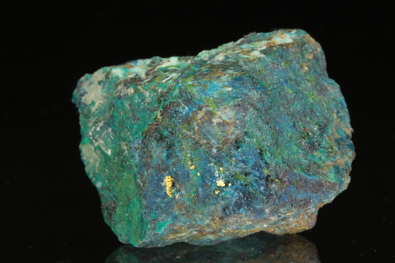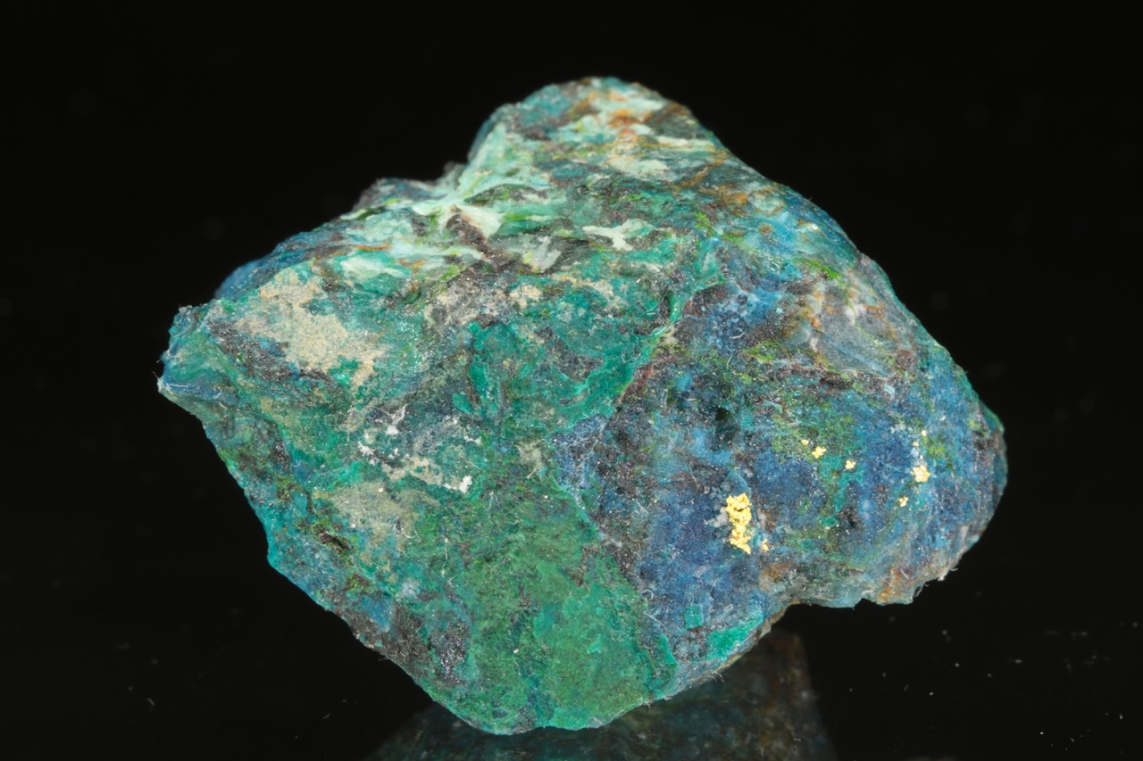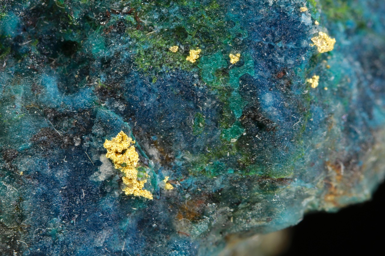 Aggregates von reinem Gold in Quarzgestein, gefärbt in Blau und Grün durch sekundäre Kupfermineralien.
