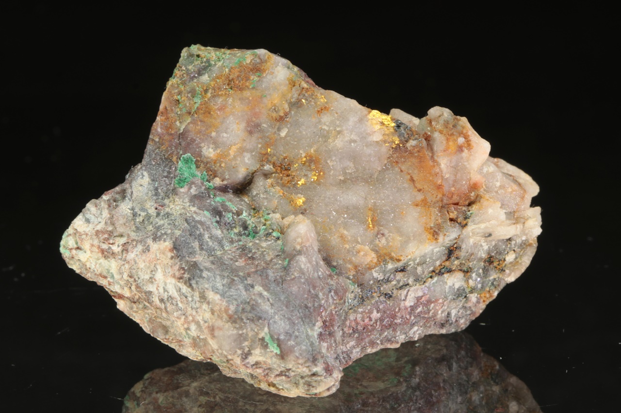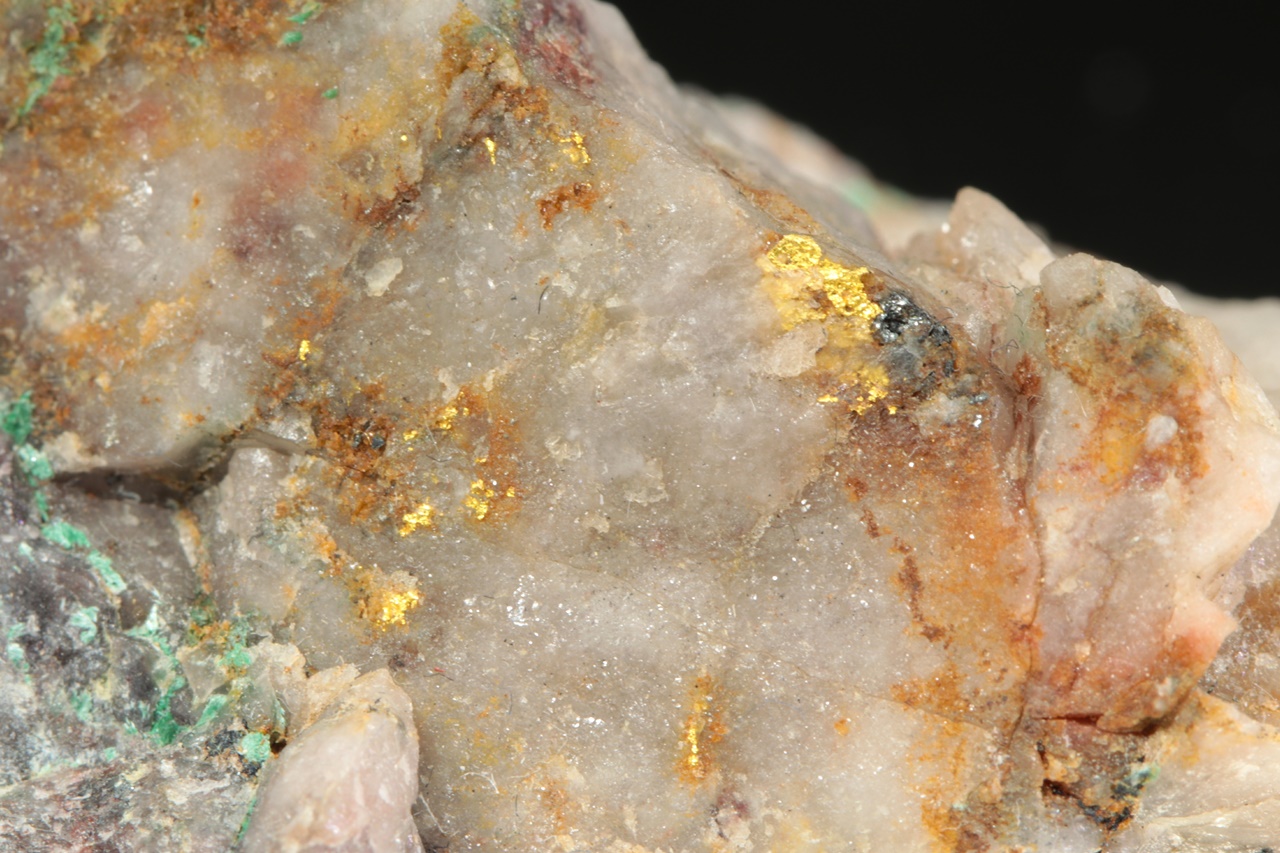 Aggregate von reinem Gold im Quarz. Der größte Aggregat ist 3 mm groß.