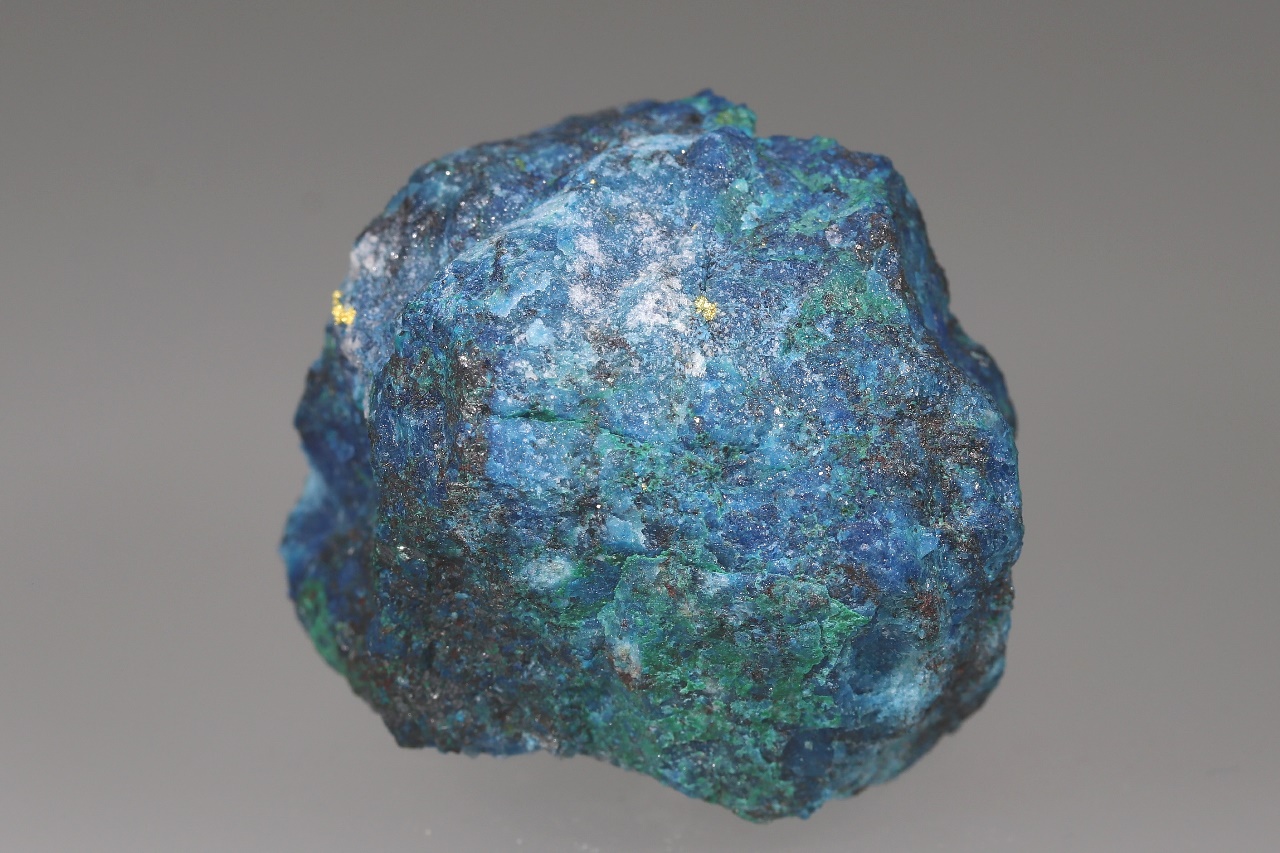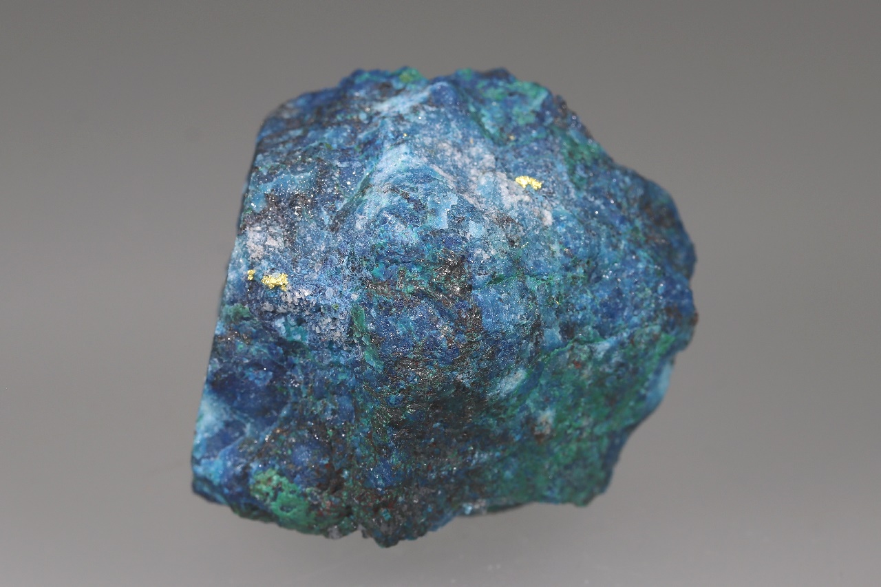 Agregaty reinen Goldes beide ca. 2 mm groß, aufgewachsen in intensiv blauem Shattuckit Edelsteinqualität.