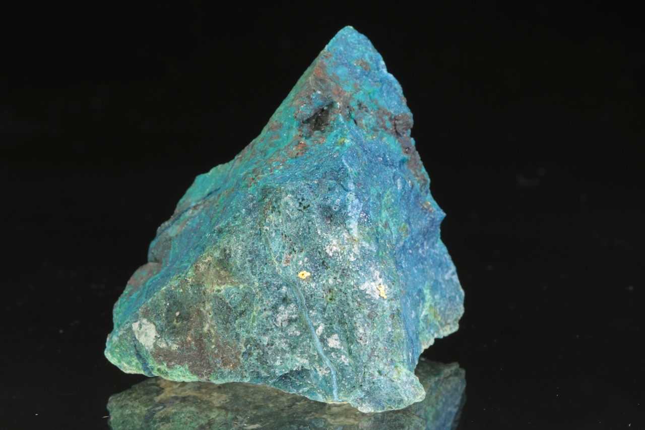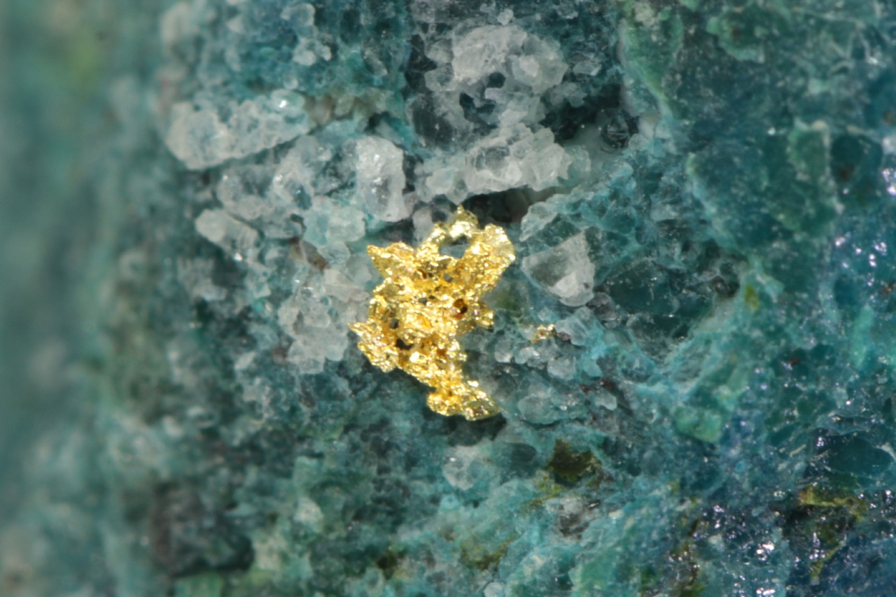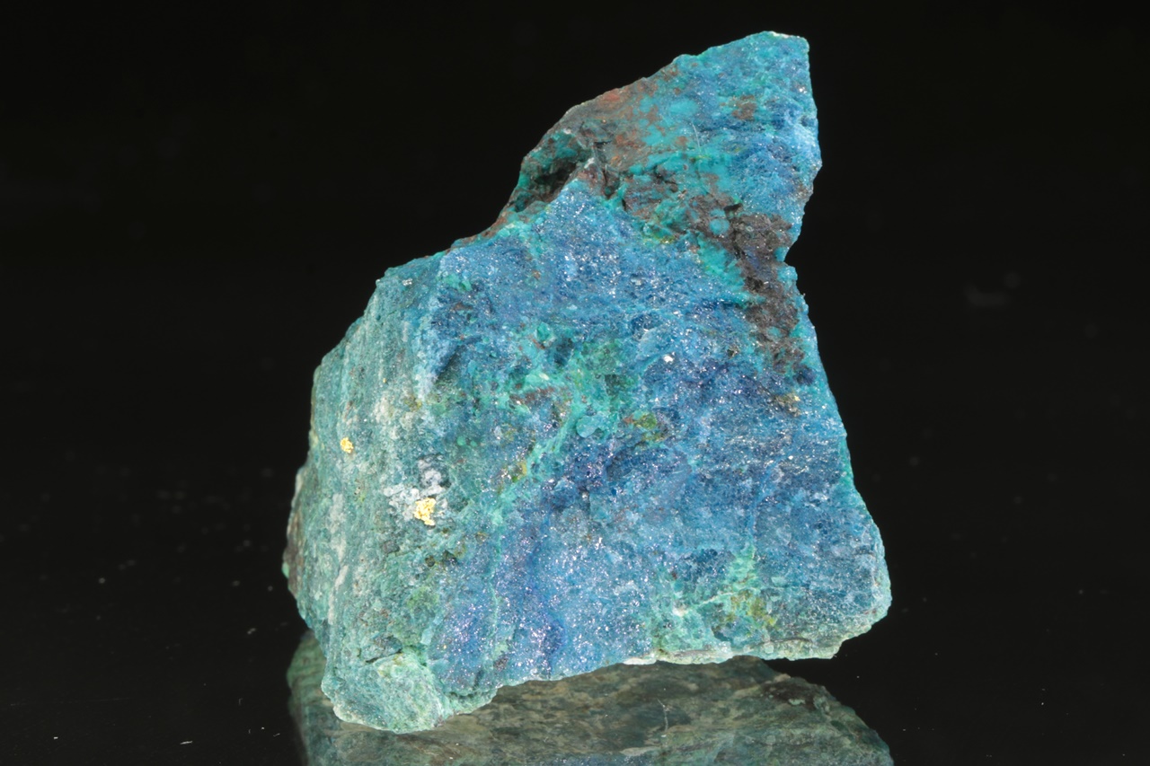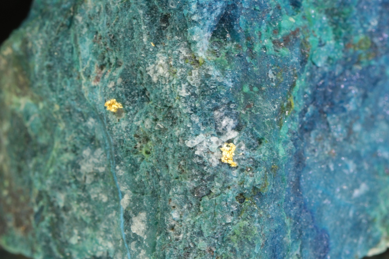 Aggregat reines Gold in kontrastierendem blauen Shattuckit von Edelsteinqualität. Die Goldaggregat sind 1,5 und 1 mm groß.