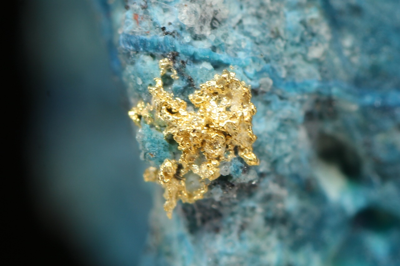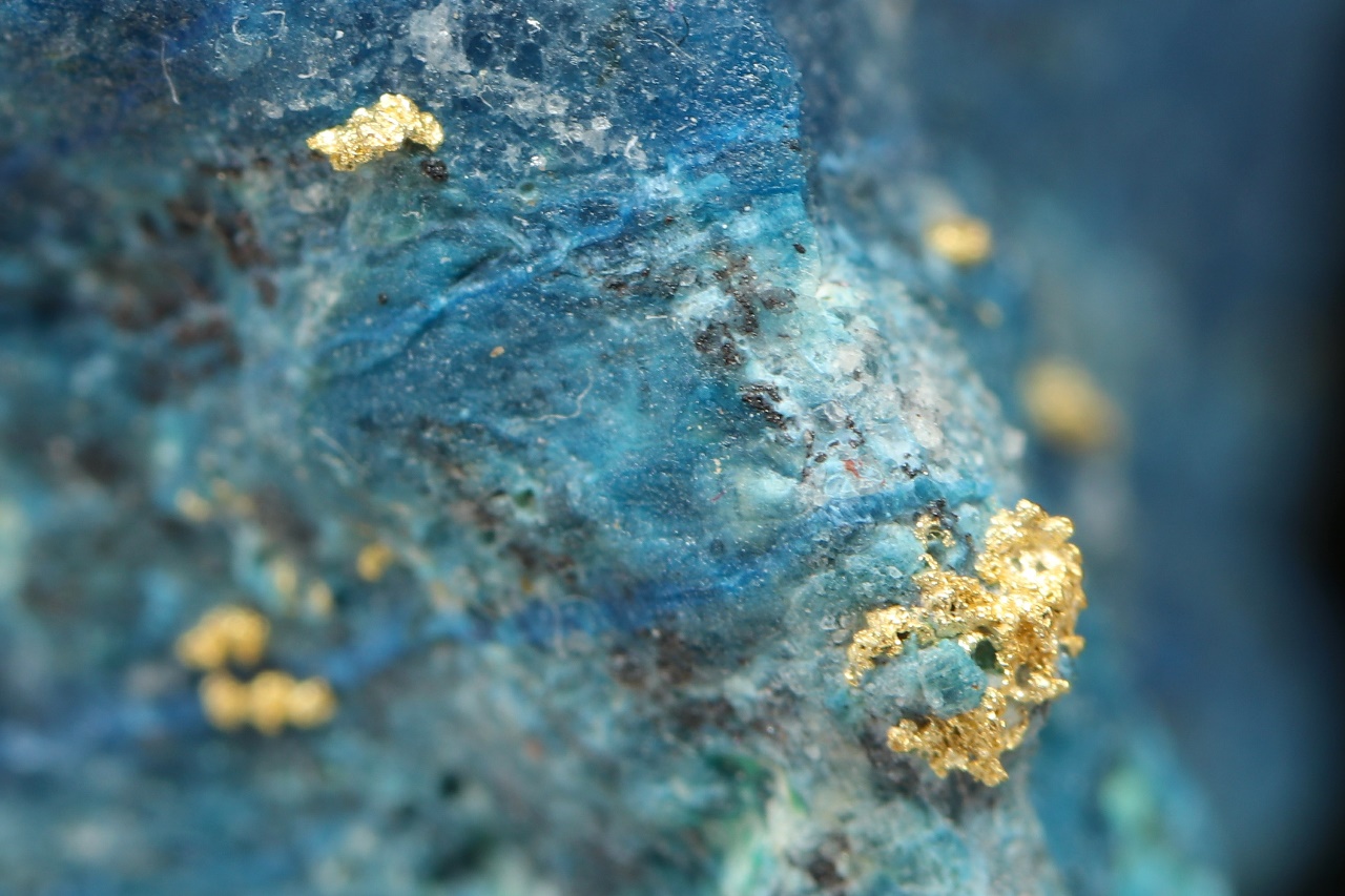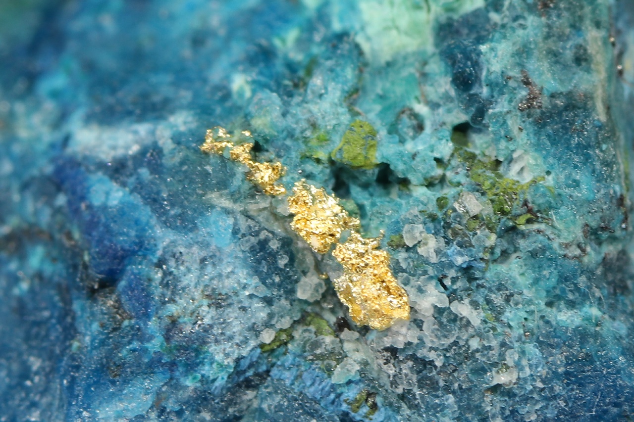 Probe von intensiv blauem Shattuckit Edelsteinqualität, aus der in alle Richtungen Aggregate aus reinem Gold in den Raum ragen. Der längste, gestreckte Aggregate (im oberen Teil der Probe) ist 4 mm groß.
