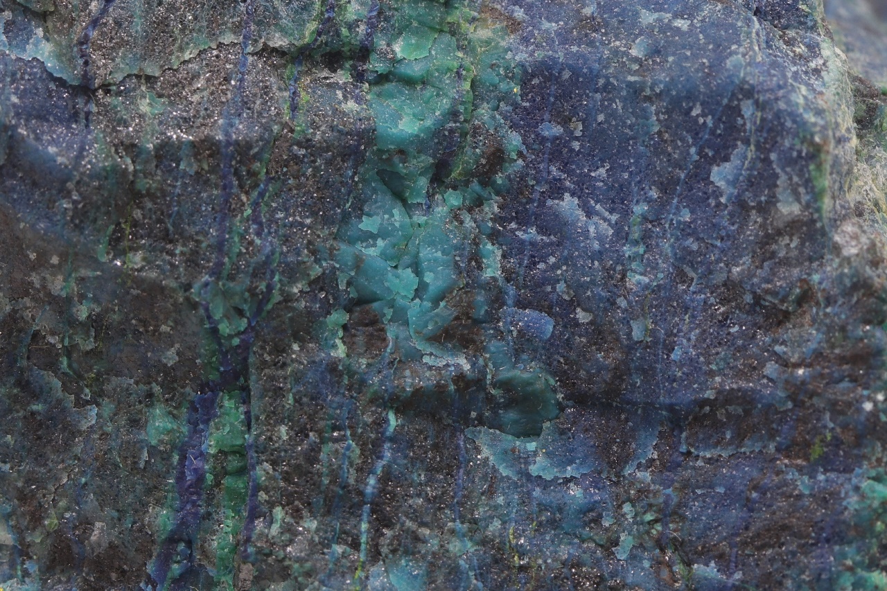 Kristallines Gold, das sich untypischerweise in einer kupfernen Mineralassoziation in einer außerordentlich attraktiven hellblauen Farbe befindet. Die Goldflitter an der Oberseite des Exemplars sind bis zu 2 mm groß. Der Shattuckit mit Chrysokoll ist verquarzt und erreicht Juweliersqualität .