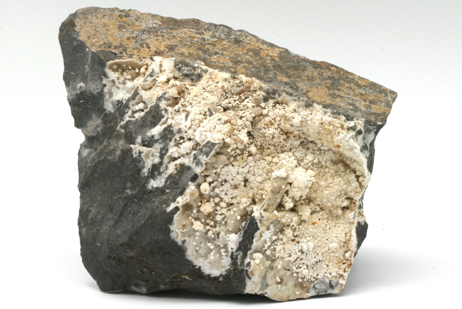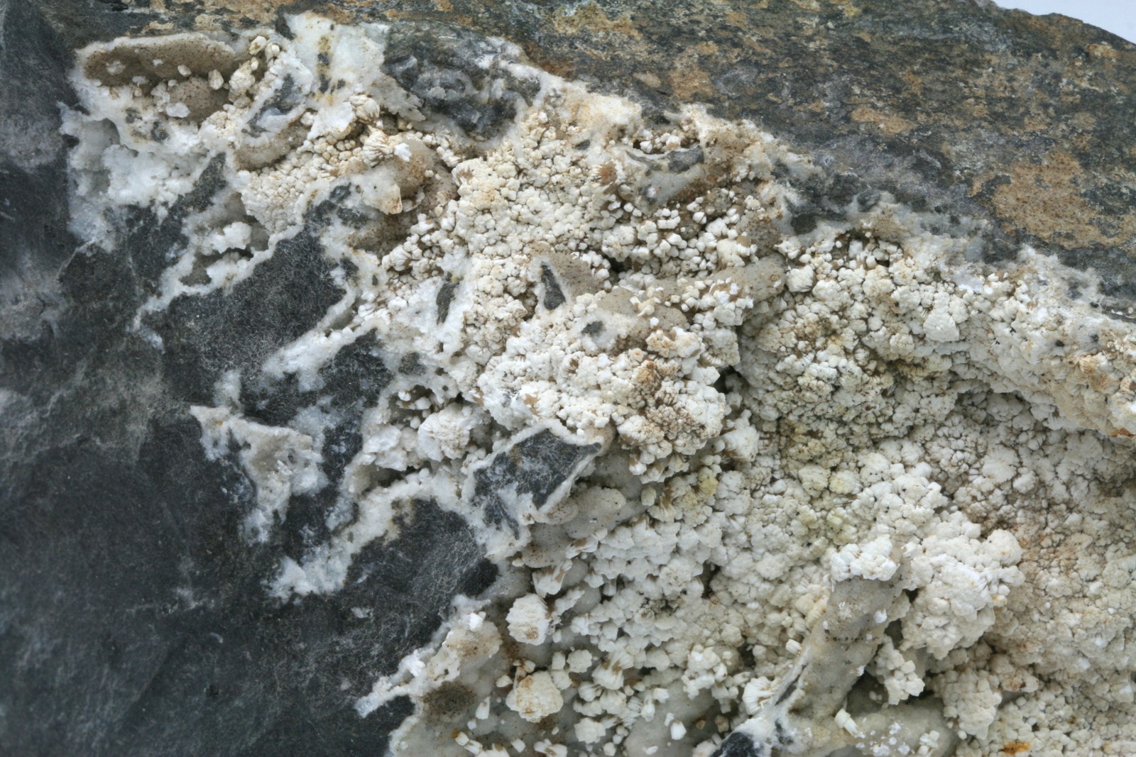 Weiße Kristalle von Zeolithen. Durch Röntgenuntersuchung bestimmt, dass die Kristalle aus einer Mischung von Gonardit, Thomsonit und Phillipsit bestehen.