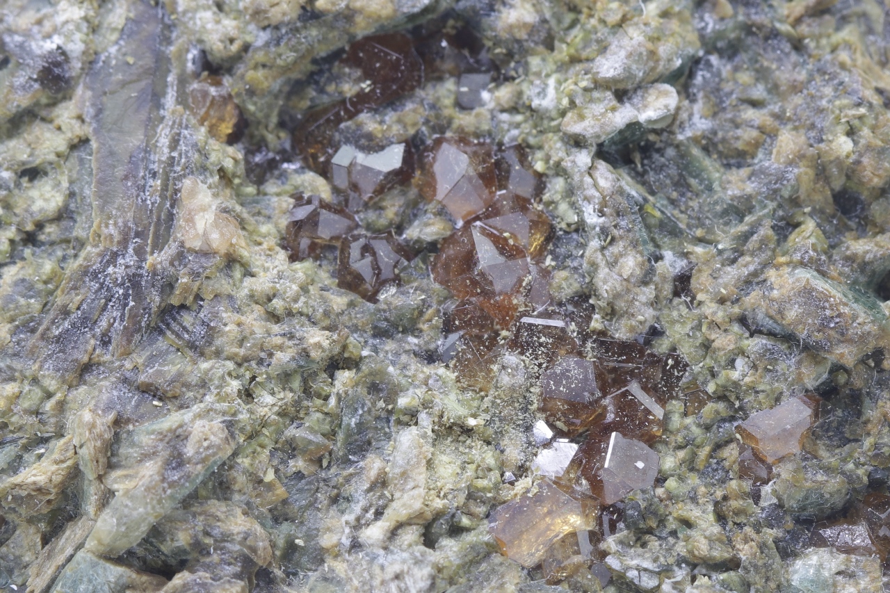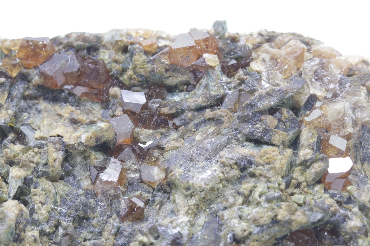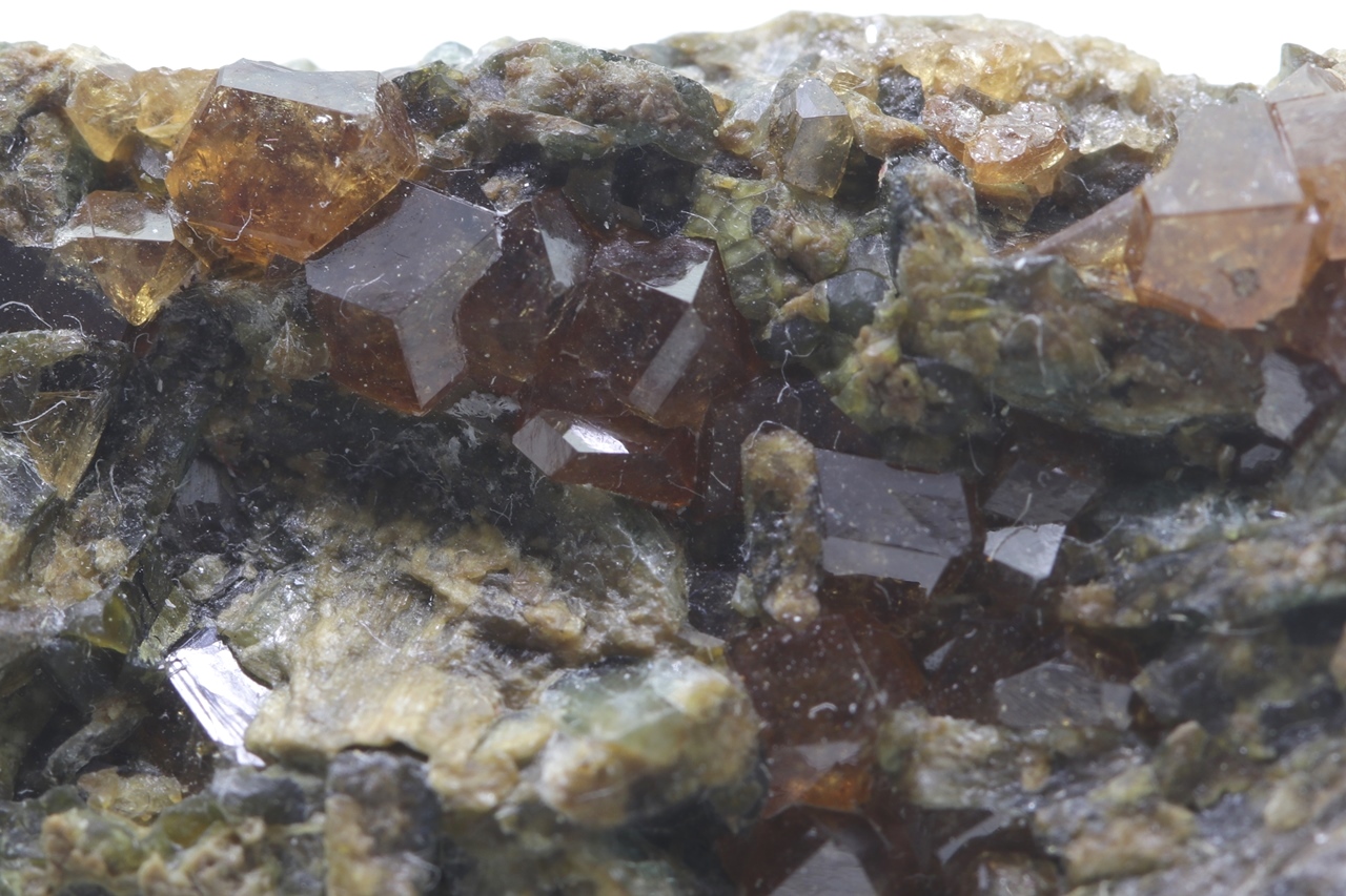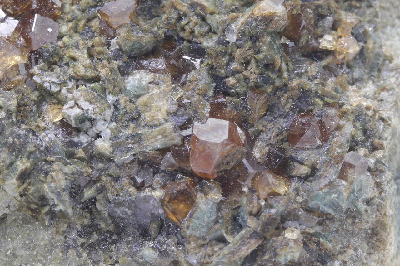 Glänzende Kristalle des dunkel orangefarbenen Grossulars von Edelsteinqualität bis zu 5 mm Größe.