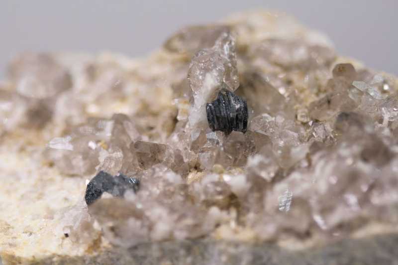 Ungewöhnliche Assoziation von Hämatit und Rauchquarz aus Österreich. Ästhetisches Stufe von Hämatit-Rosen, die zwischen glänzenden Rauchquarz-Kristallen liegen .