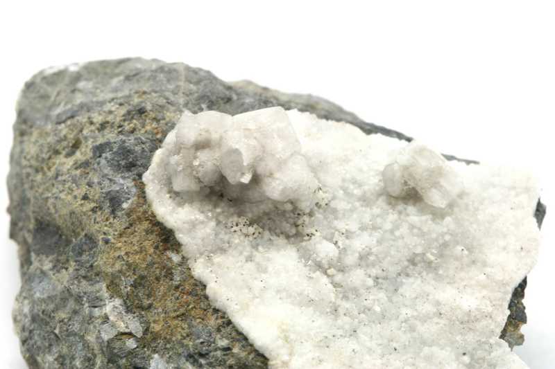 Historisches Beispiel des bernsteinfarbenen Zeoliths Harmotom aus einem klassischen deutschen Fundort. Sehr schöne Probe von durchsichtigen Harmotom-Kristallen und ihren Verwachsungen, groß bis zu 11 mm.